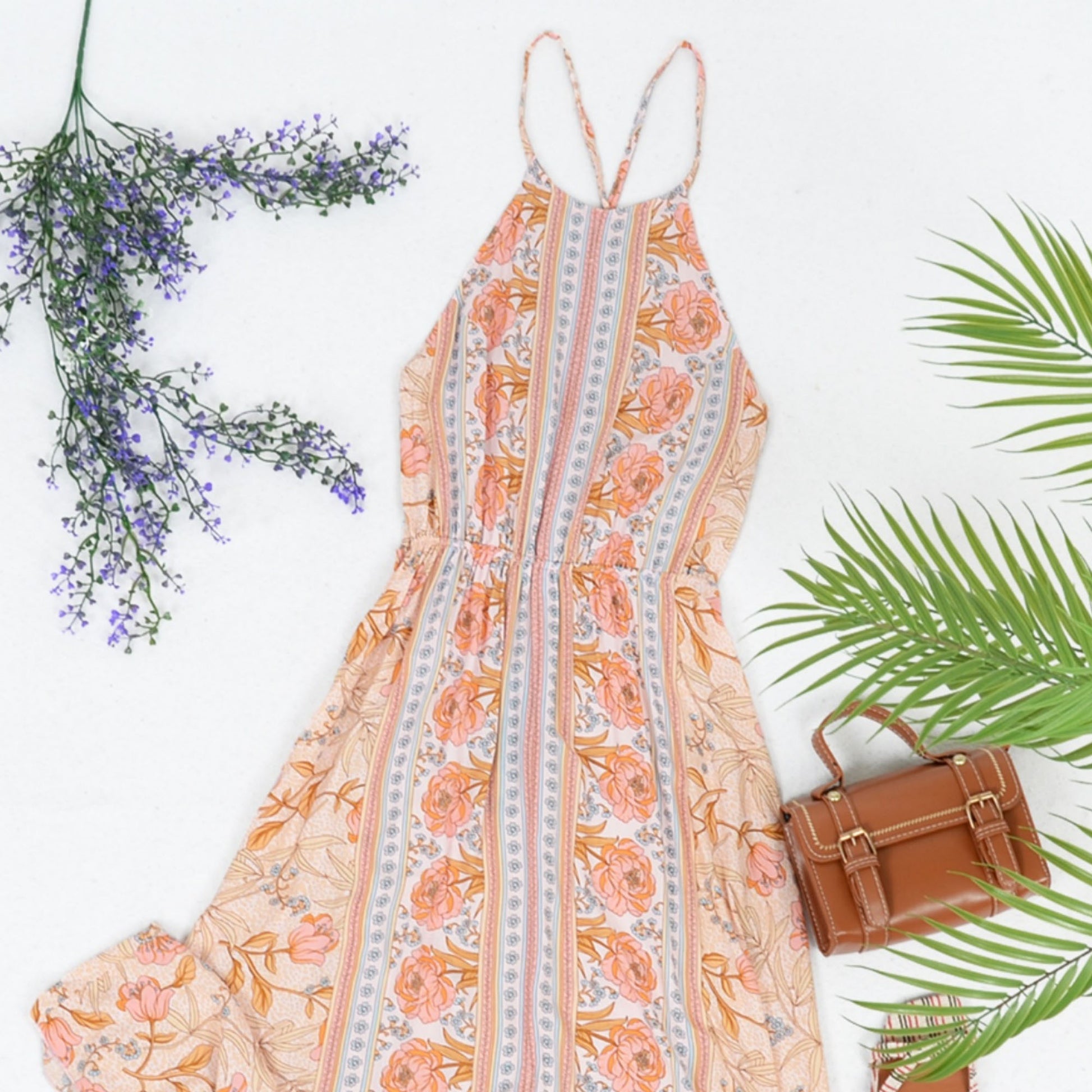The Anna-Kaci Women's Floral Print Maxi Dress showcases a flowy silhouette and delicate floral stripe pattern. Featuring a sleeveless bodice and high front slit, this dress adds movement and charm to your look. The elastic waist ensures a flattering, comfortable fit. Ideal for styling with sandals, sun hats, or woven bags for a relaxed and stylish outfit.