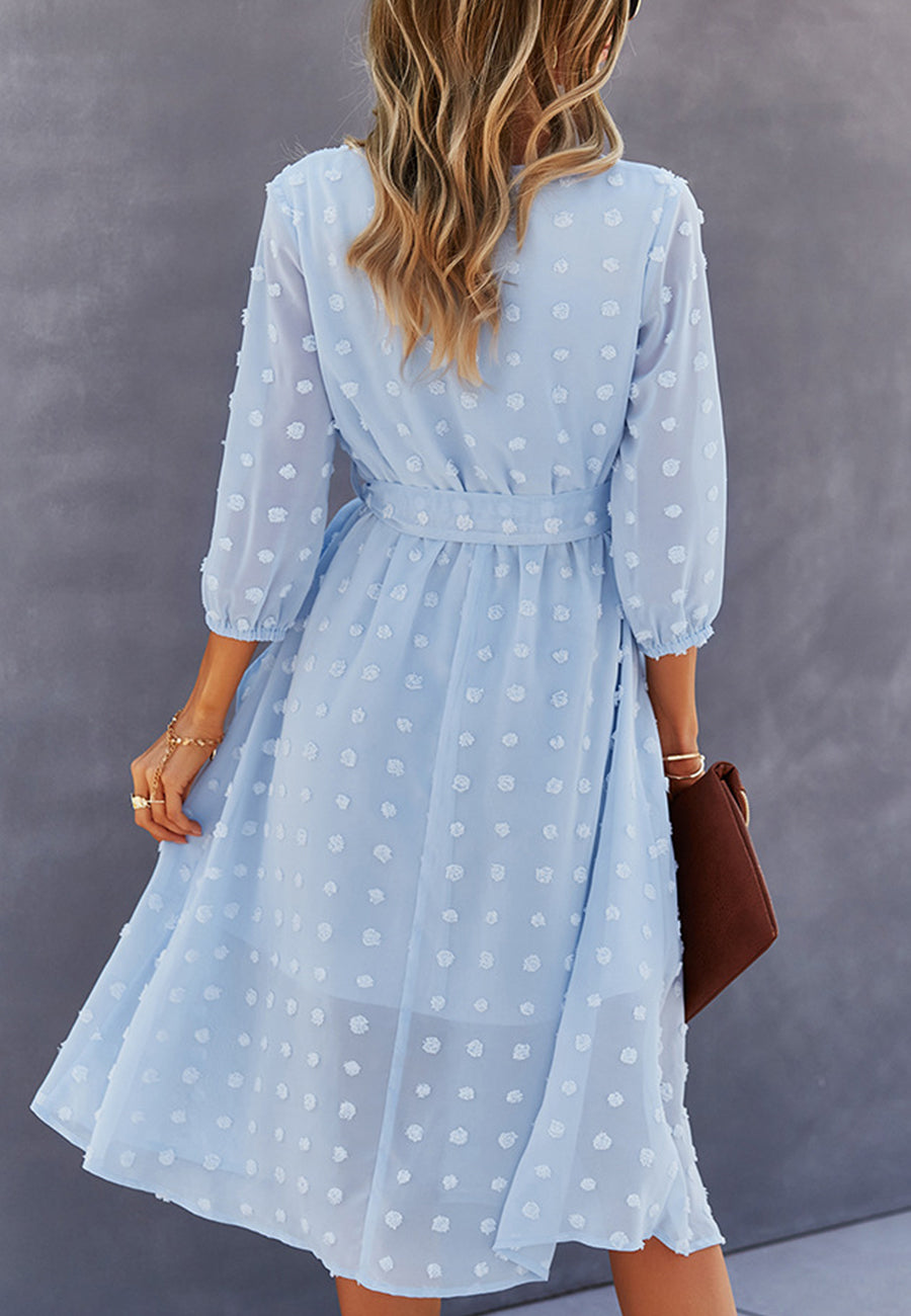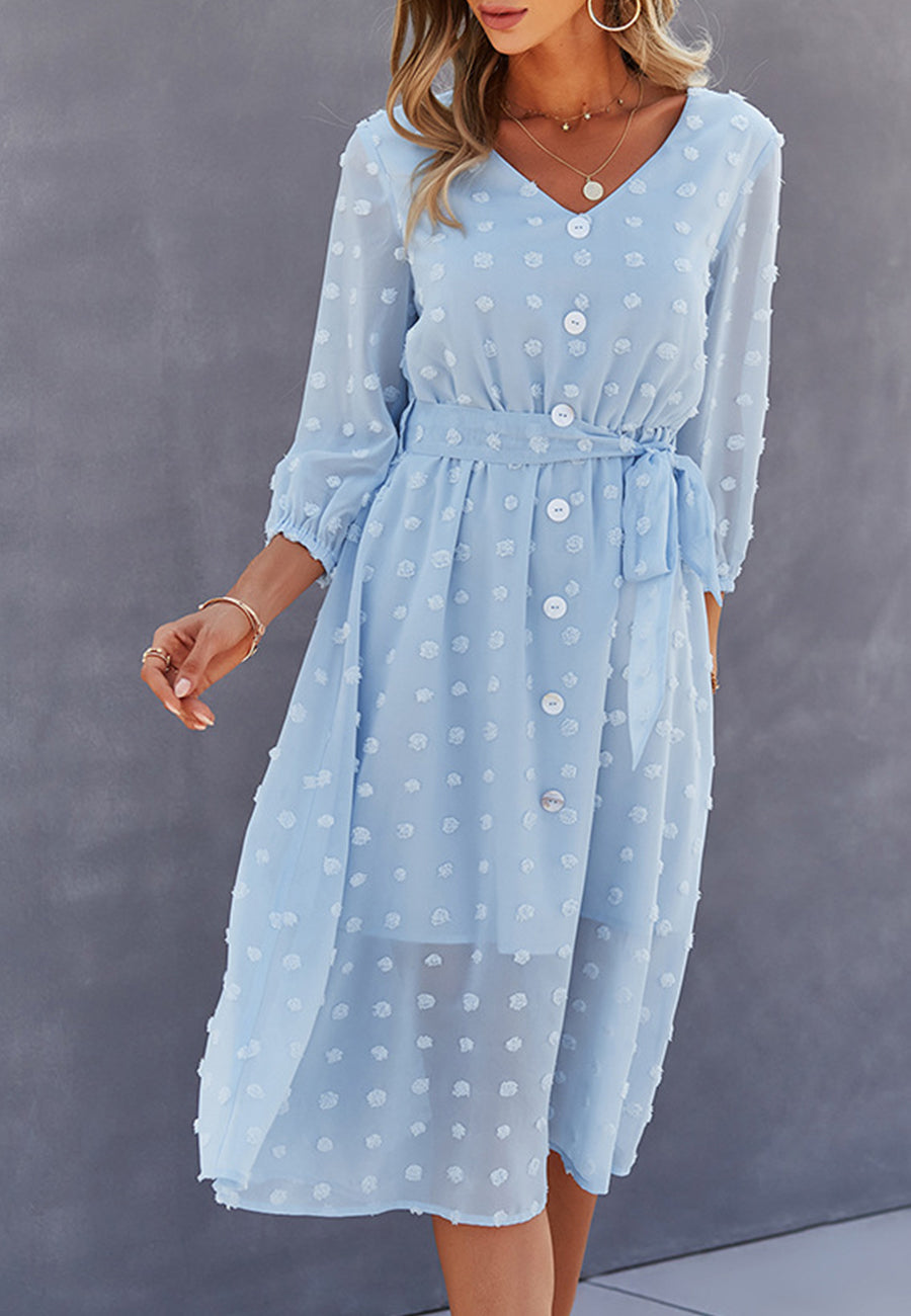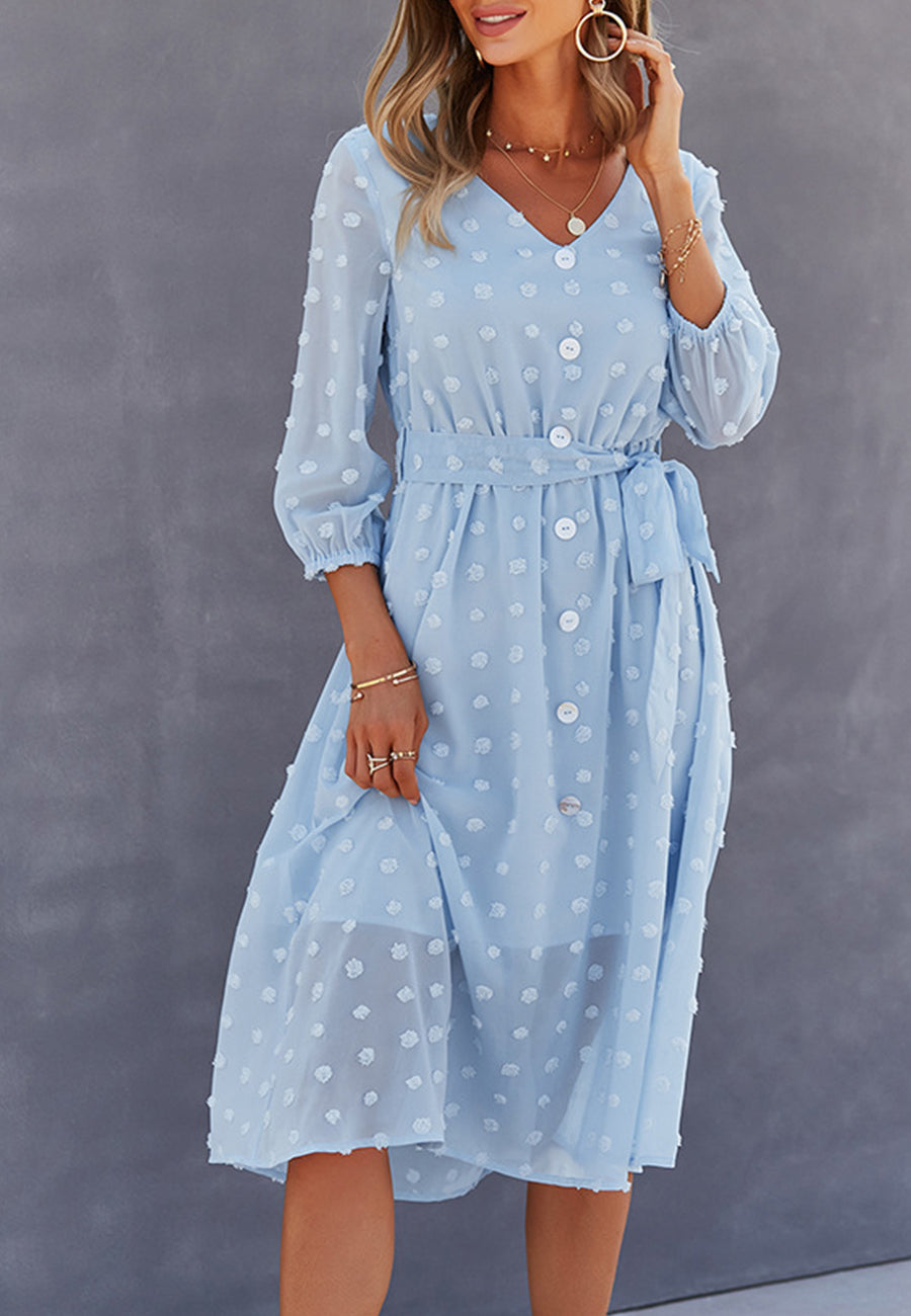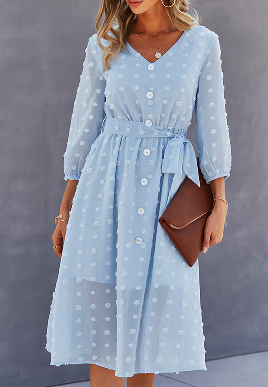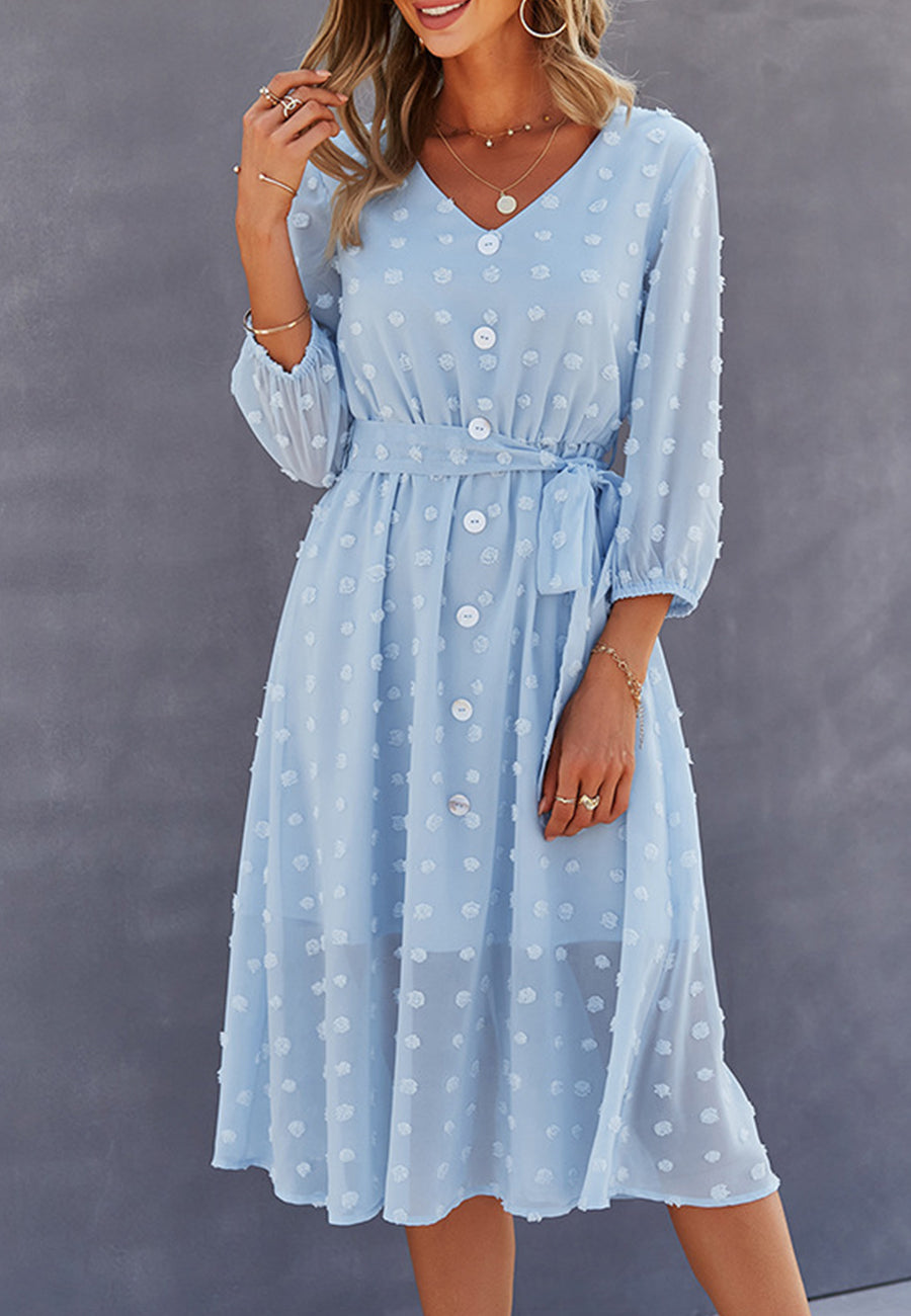 El vestido Anna-Kaci está elaborado con un delicado tejido de lunares suizos. Tiene escote en V, botones en contraste en la parte delantera, mangas 3/4, cinturón anudado en la cintura, silueta en forma de A y largo por debajo de la rodilla. Combínalo con gafas de sol y tacones de aguja para lograr un look magnífico.