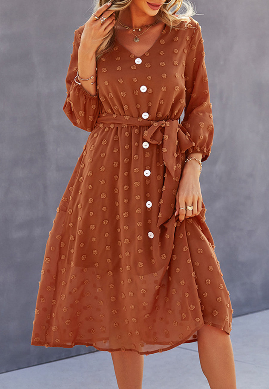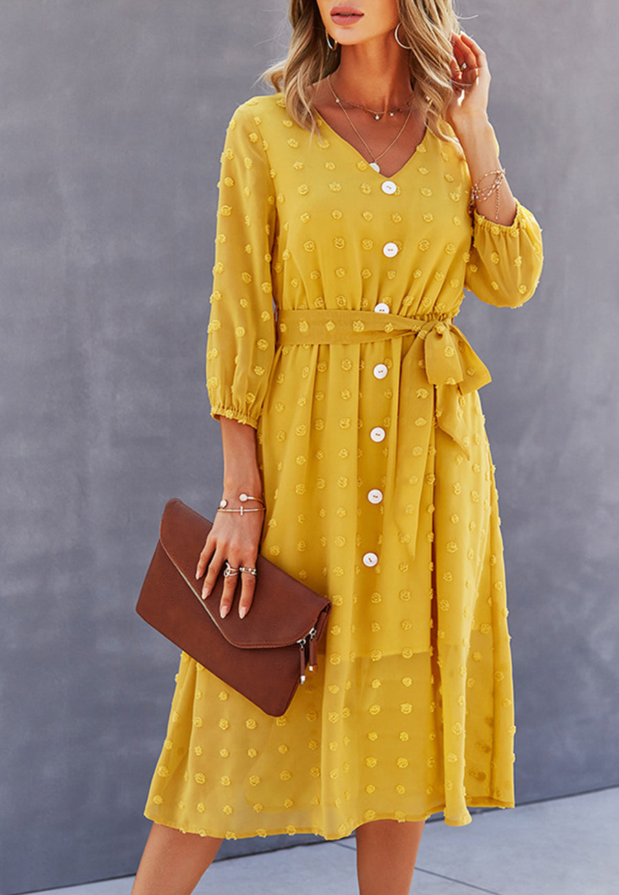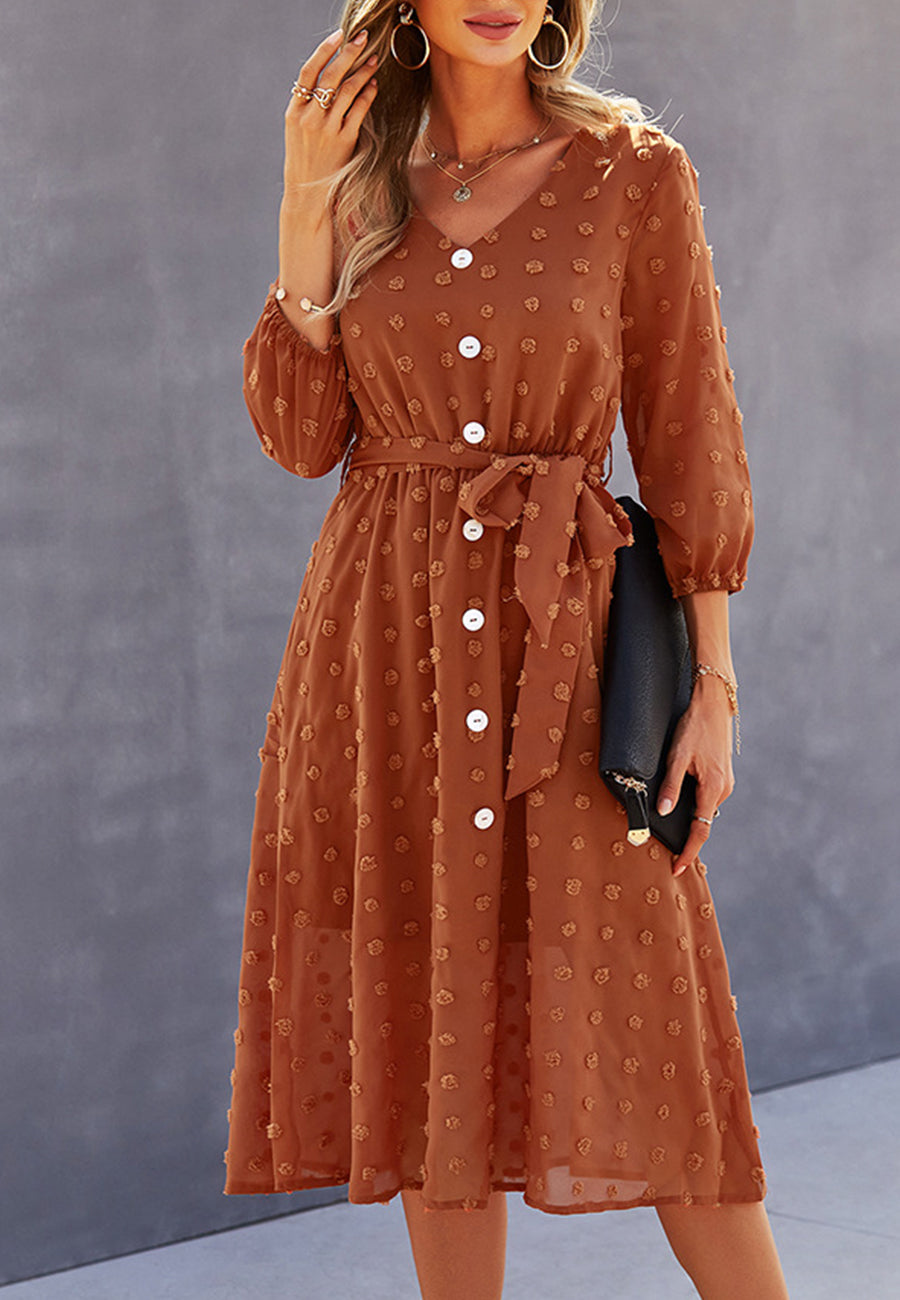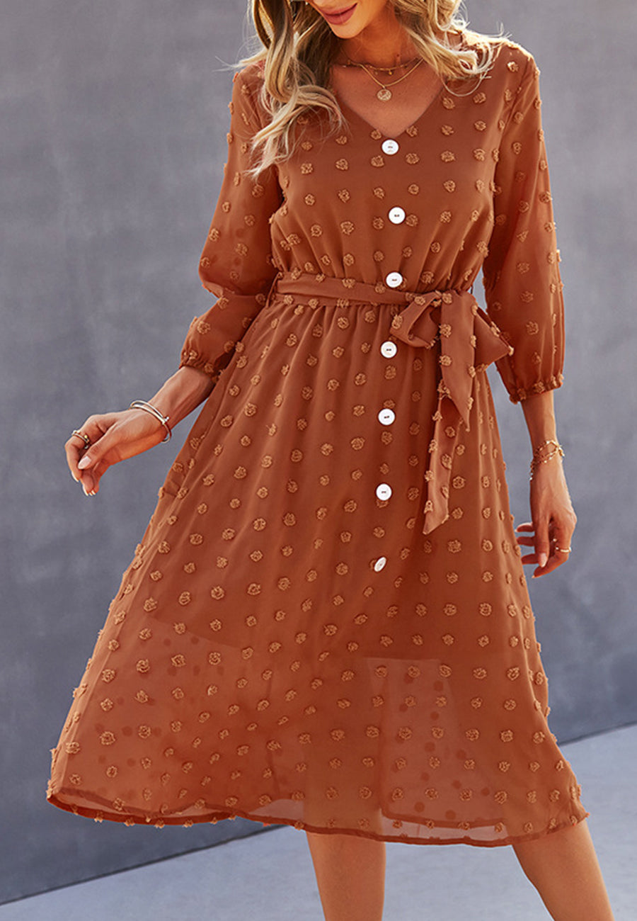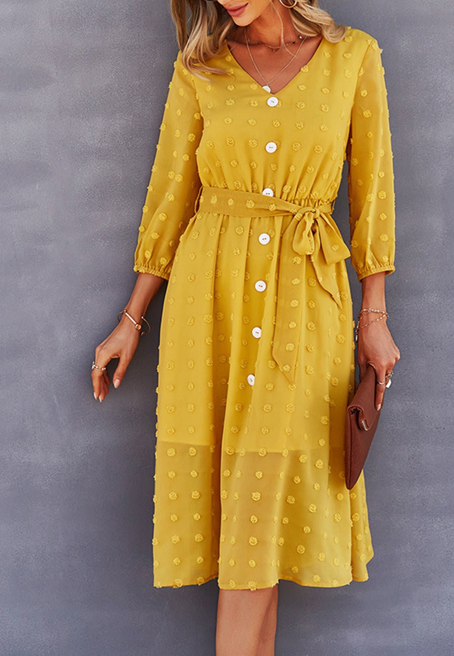 El vestido Anna-Kaci está elaborado con un delicado tejido de lunares suizos. Tiene escote en V, botones en contraste en la parte delantera, mangas 3/4, cinturón anudado en la cintura, silueta en forma de A y largo por debajo de la rodilla. Combínalo con gafas de sol y tacones de aguja para lograr un look magnífico.