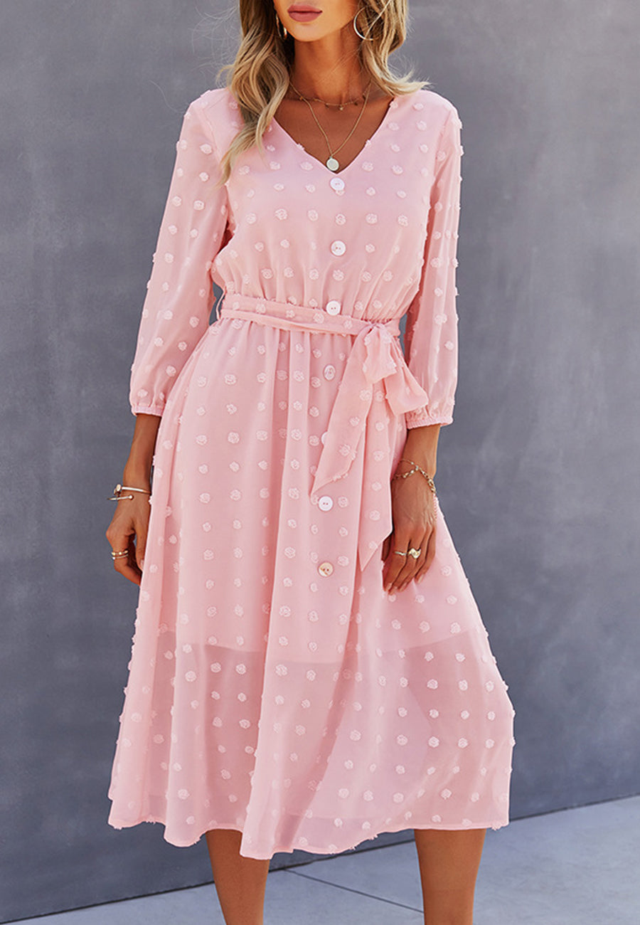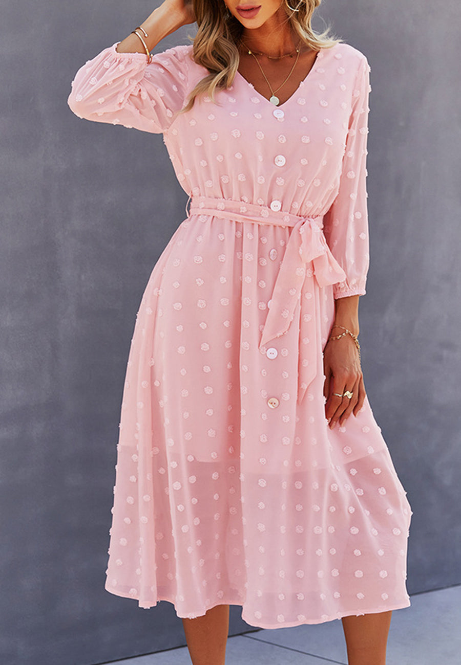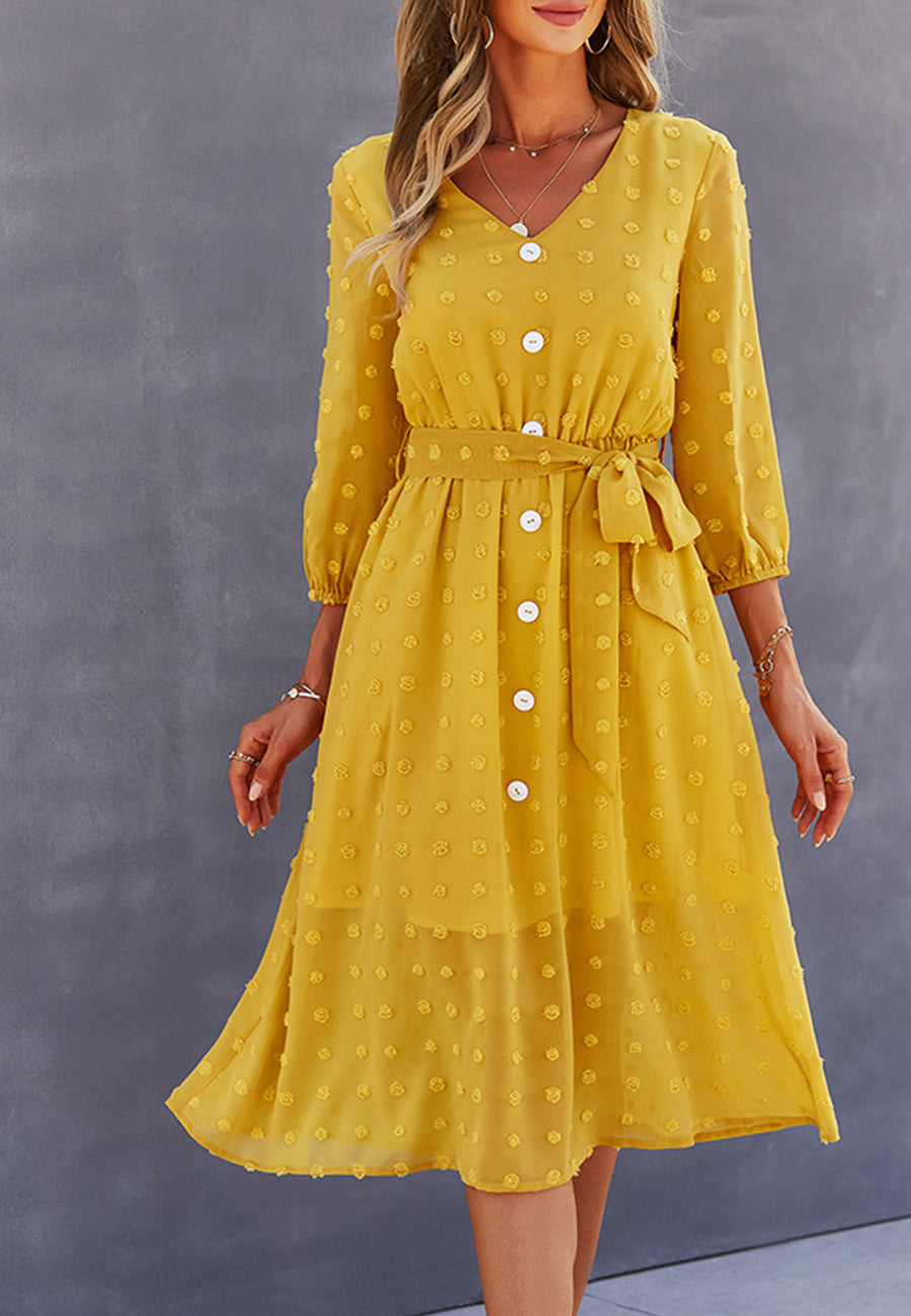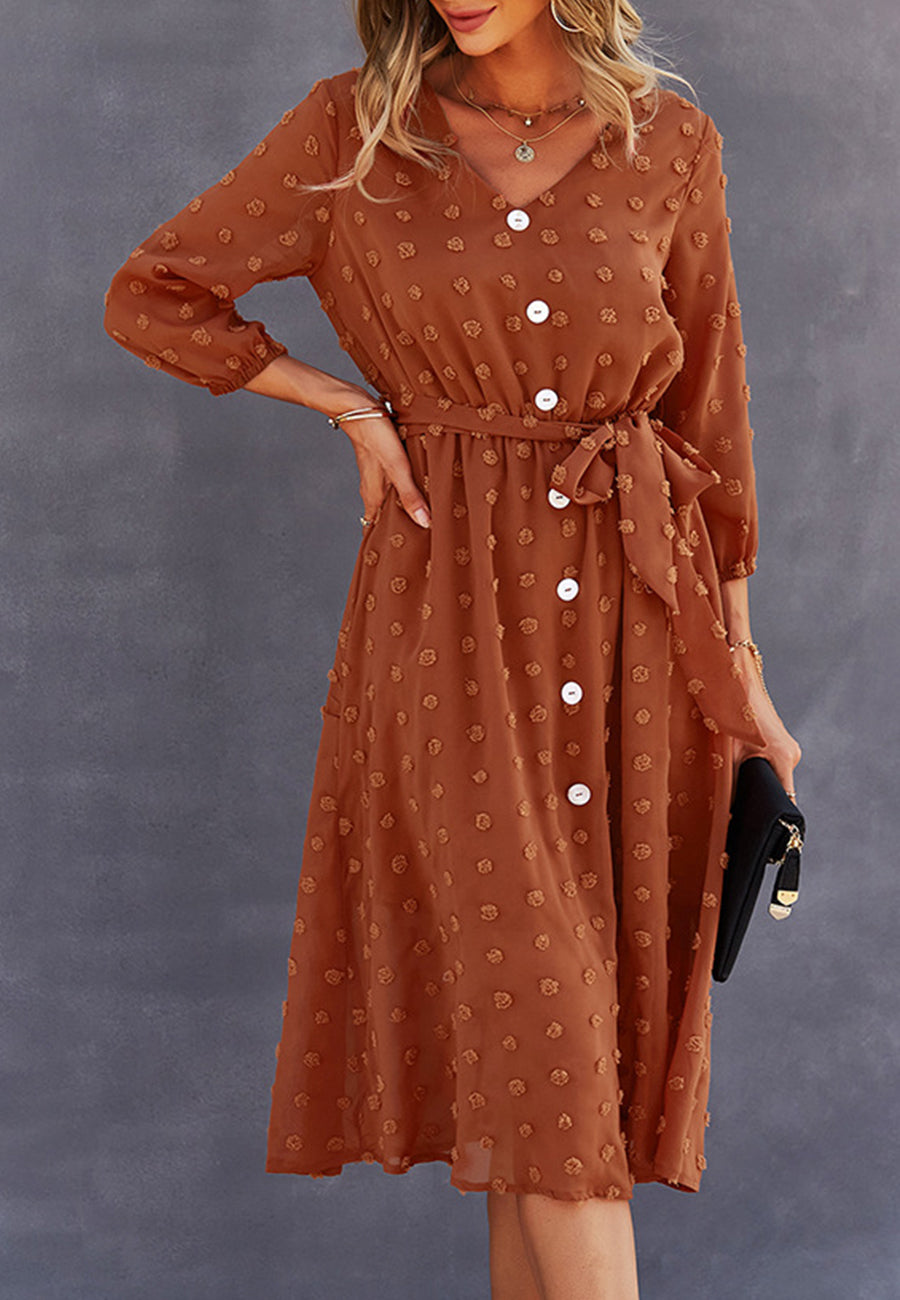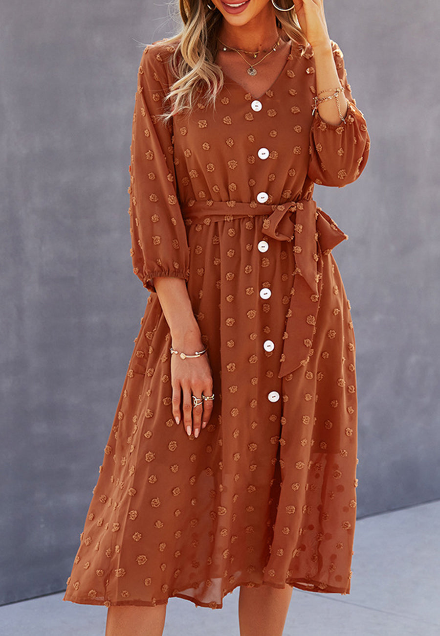 El vestido Anna-Kaci está elaborado con un delicado tejido de lunares suizos. Tiene escote en V, botones en contraste en la parte delantera, mangas 3/4, cinturón anudado en la cintura, silueta en forma de A y largo por debajo de la rodilla. Combínalo con gafas de sol y tacones de aguja para lograr un look magnífico.