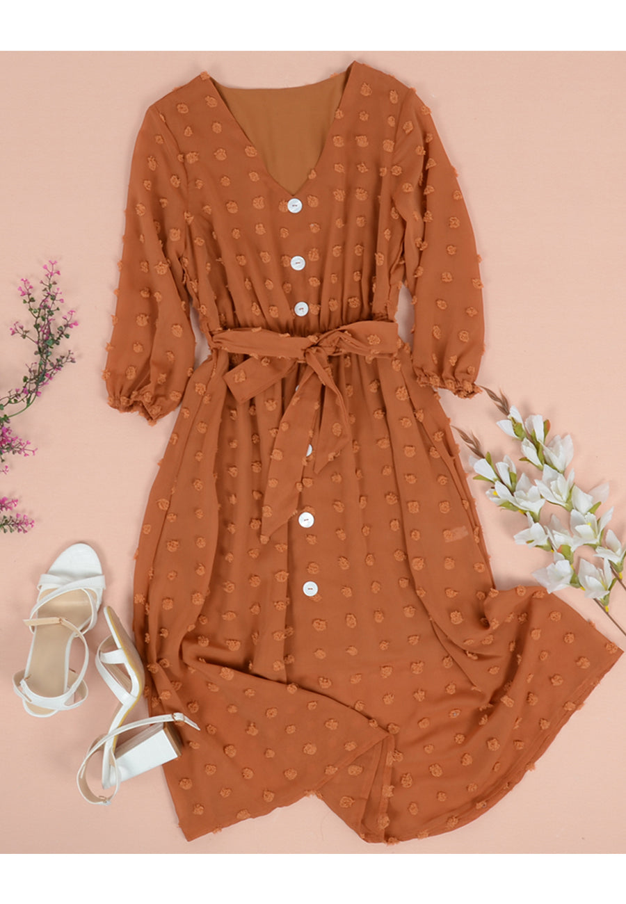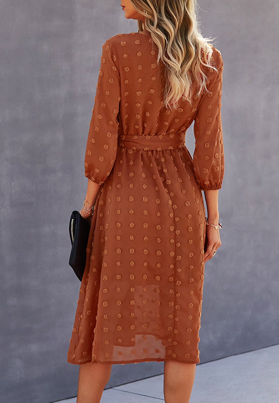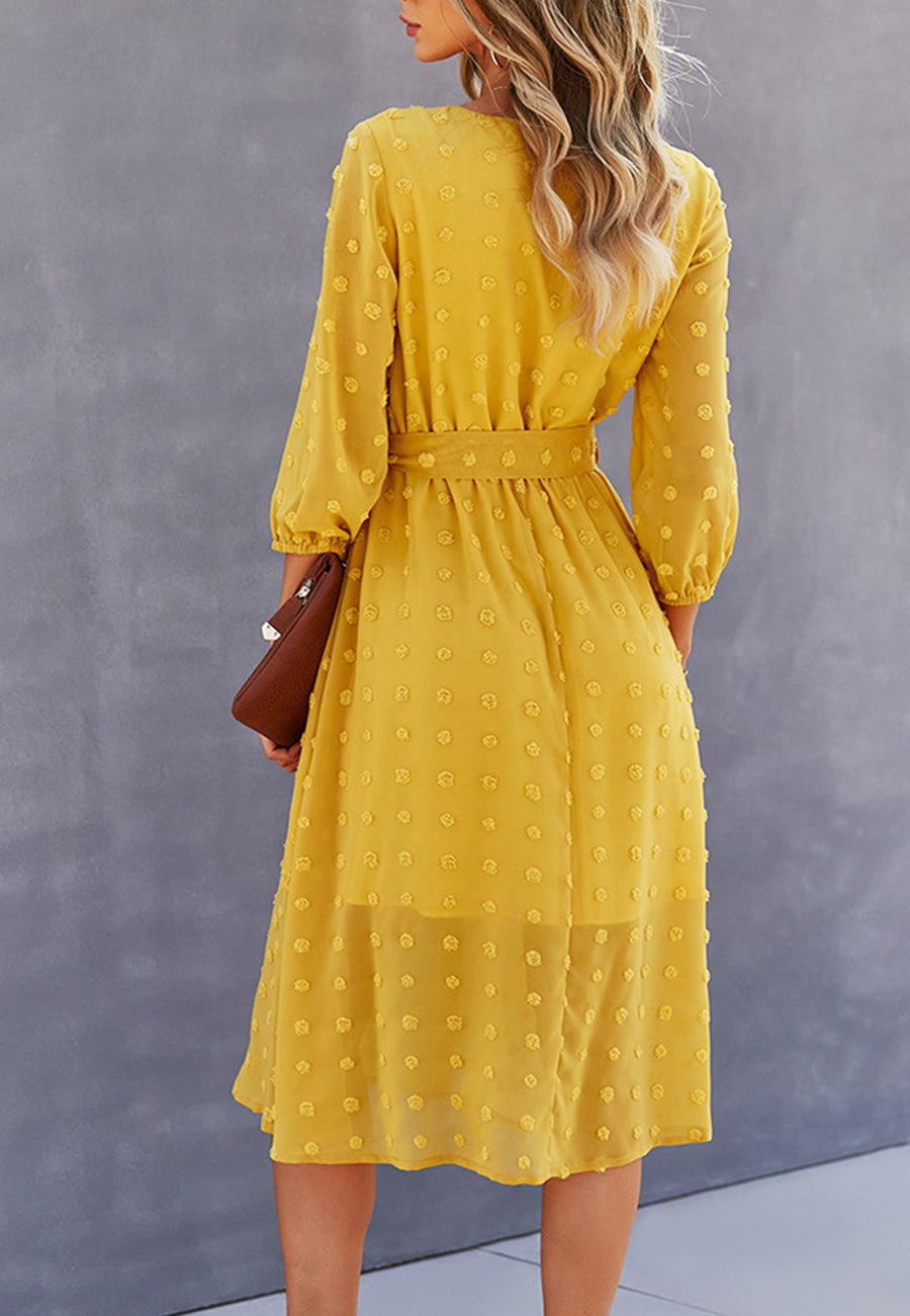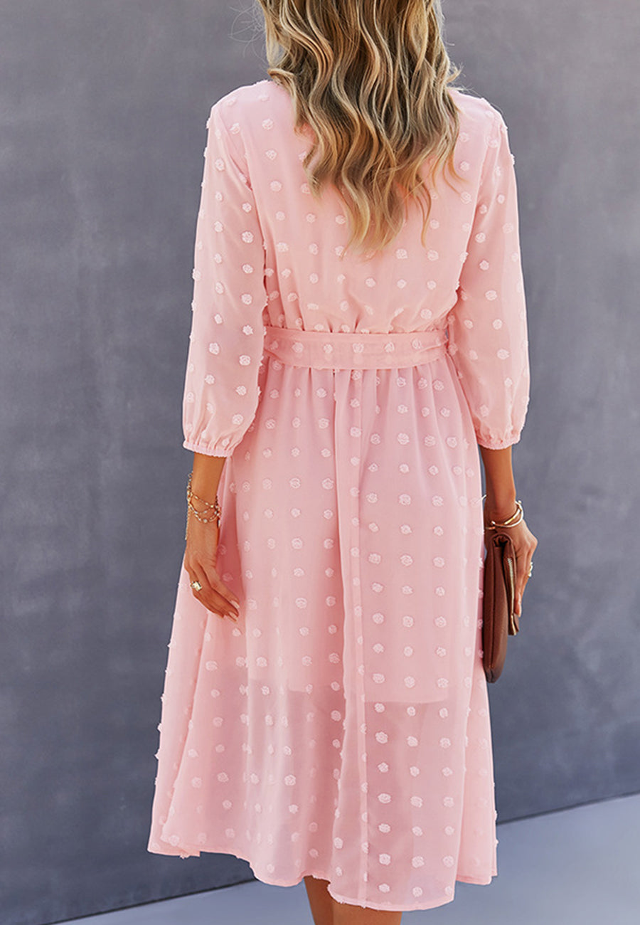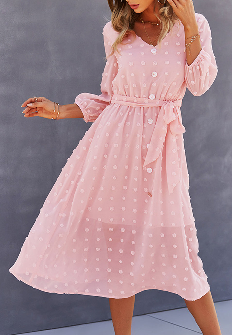 El vestido Anna-Kaci está elaborado con un delicado tejido de lunares suizos. Tiene escote en V, botones en contraste en la parte delantera, mangas 3/4, cinturón anudado en la cintura, silueta en forma de A y largo por debajo de la rodilla. Combínalo con gafas de sol y tacones de aguja para lograr un look magnífico.
