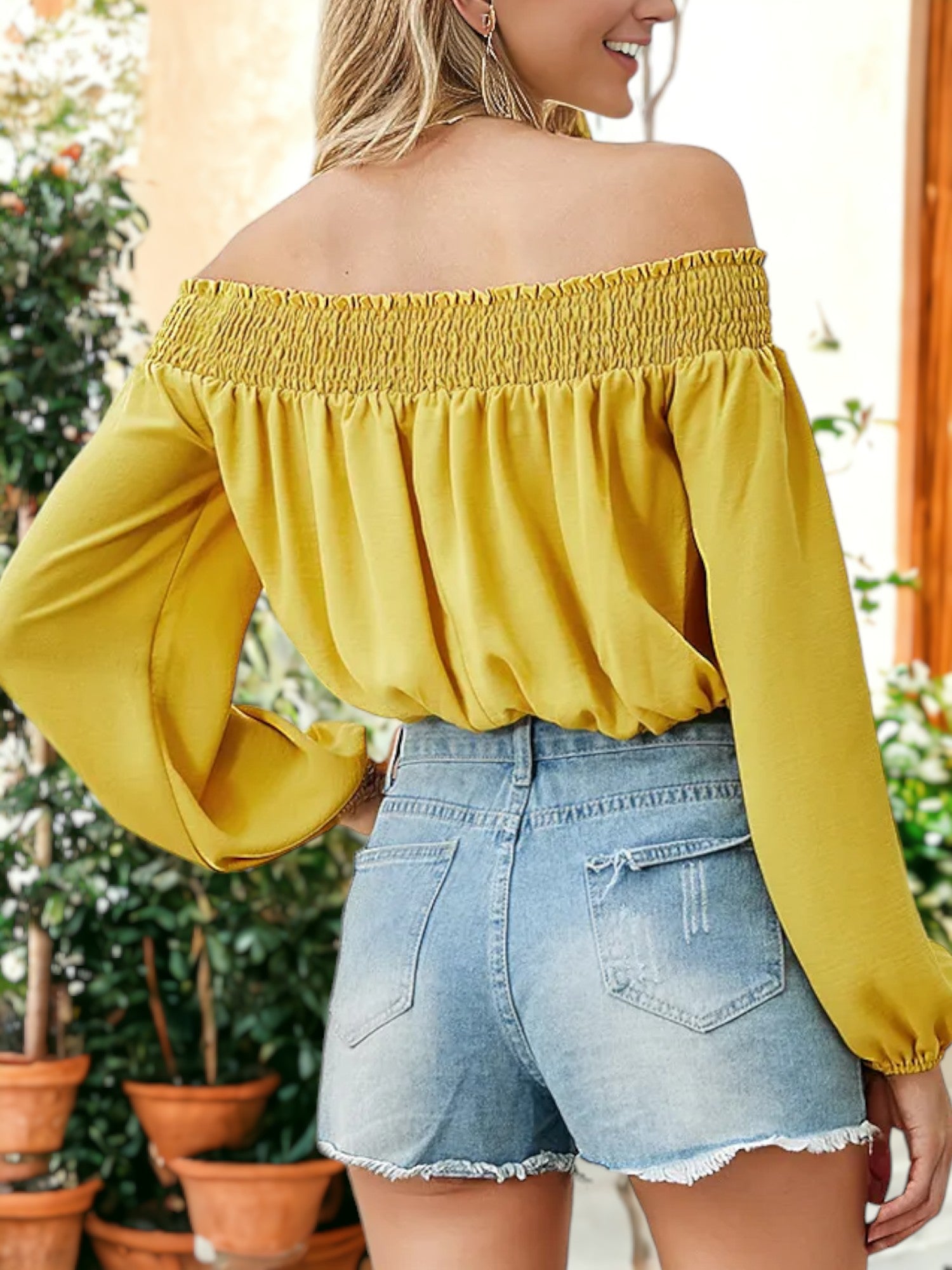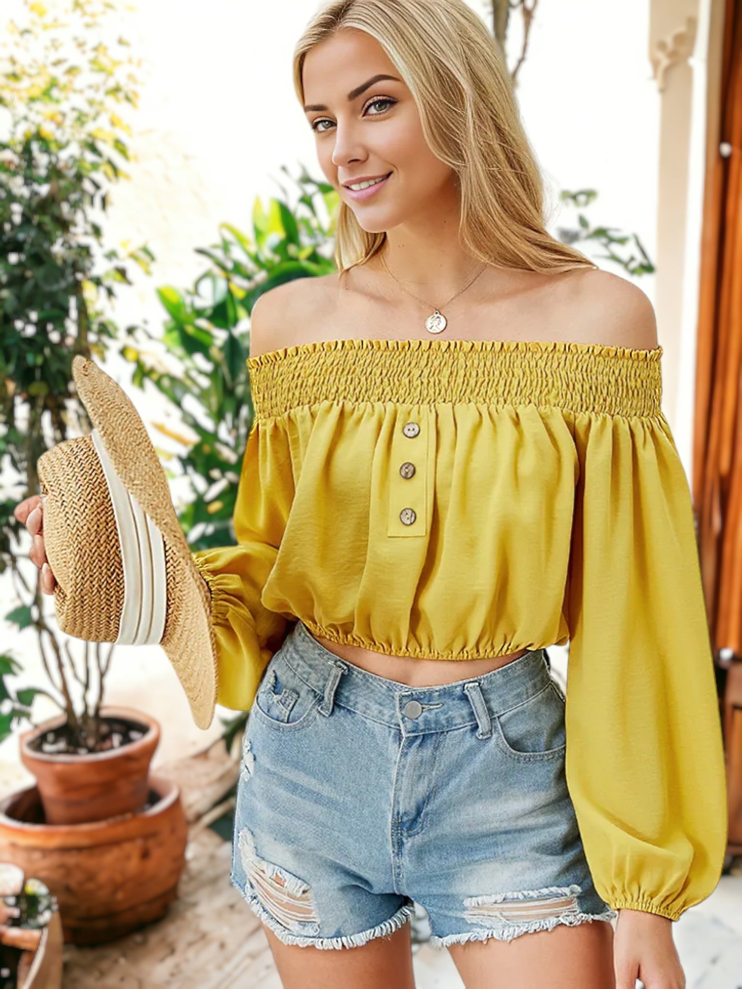 Ponte a la moda con el top Anna-Kaci, que luce un divertido escote fruncido en los hombros para darle un toque coqueto. Este top, confeccionado en un color liso y con medio botón en la parte delantera, tiene mangas abullonadas, un corte holgado y un largo corto moderno. Perfecto para lucir un estilo informal, combínalo con jeans de cintura alta y zapatillas para realzar tu conjunto informal.