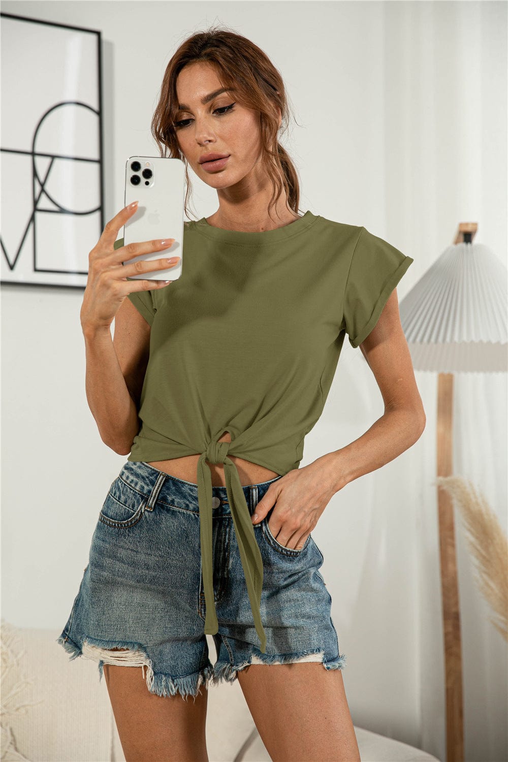 La camisa Anna-Kaci tiene un diseño único de dobladillo anudado. Tiene cuello redondo, color liso, mangas cortas y corte regular. Combínala con pantalones cortos de mezclilla desgastados y botas para lograr un estilo elegante.