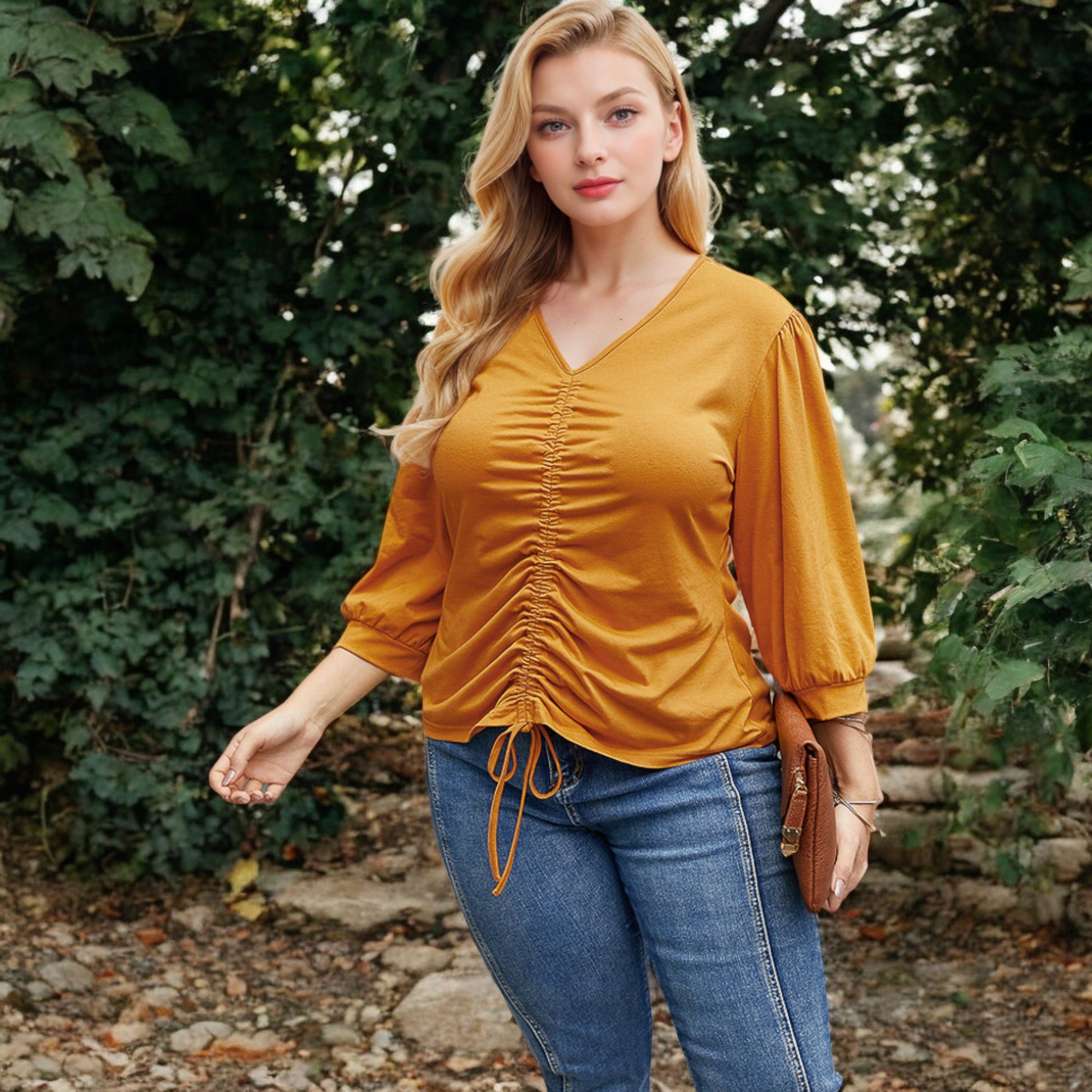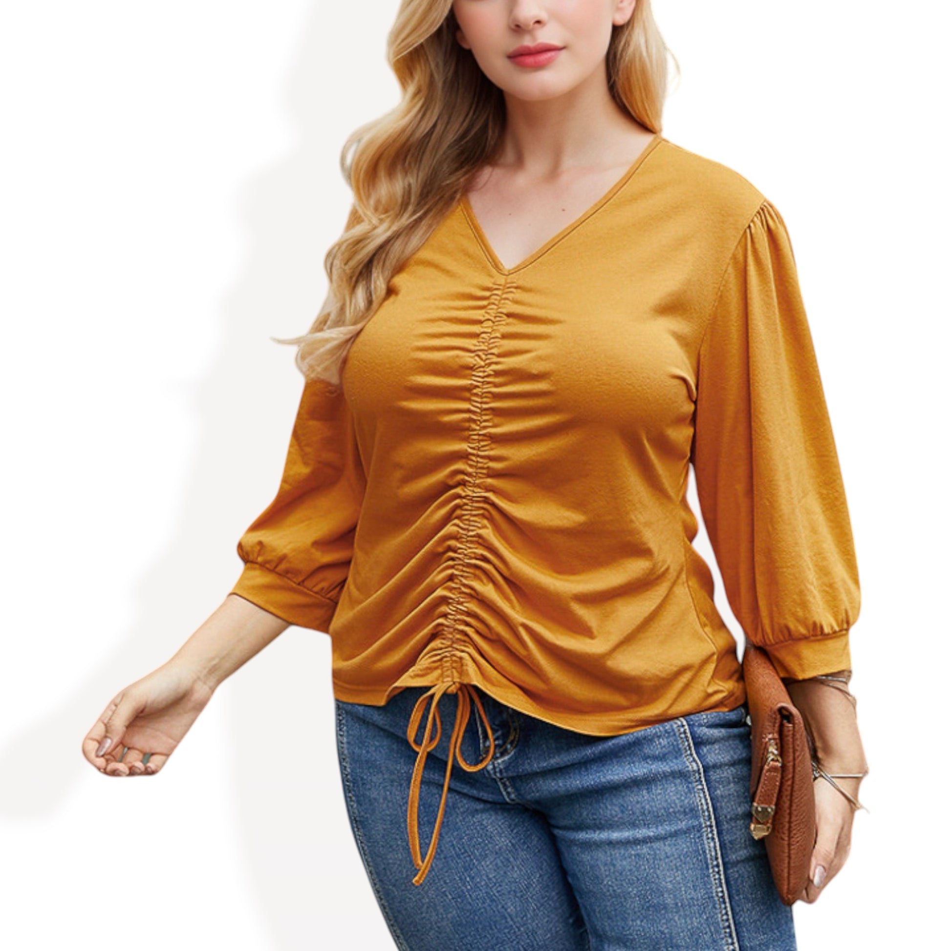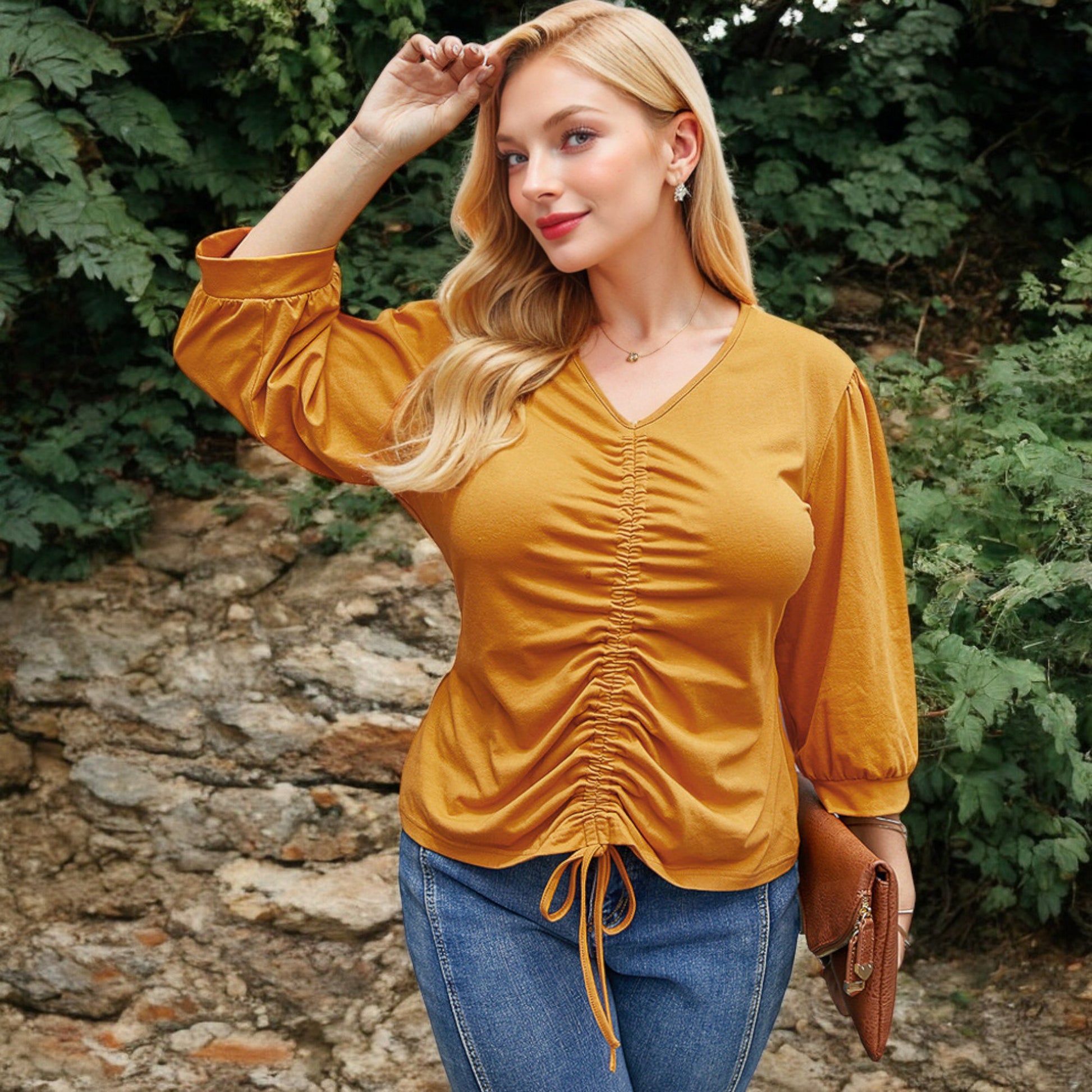 Anna-Kaci Women's Long Sleeve Blouse with V-Neck and Drawstring Detail