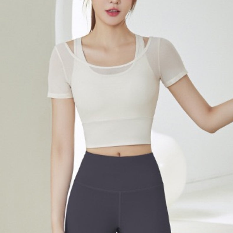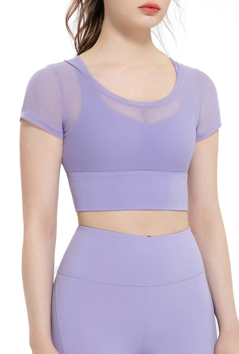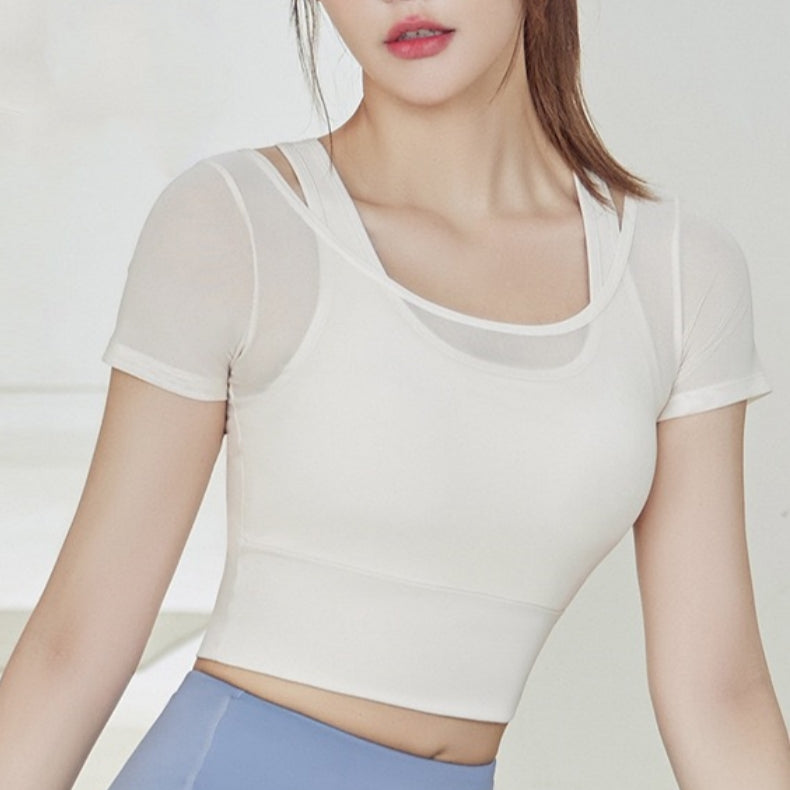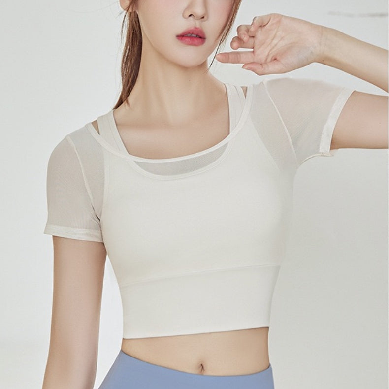 La parte superior Anna-Kaci presenta una cubierta de malla y un sujetador deportivo incorporado debajo. Tiene un escote redondo, largo corto y manga corta. Combínala con leggings para lograr un estilo rápido y elegante para el gimnasio o la calle.