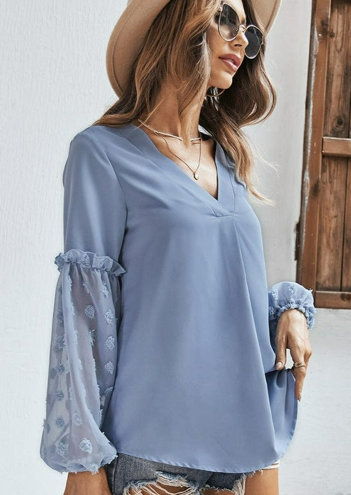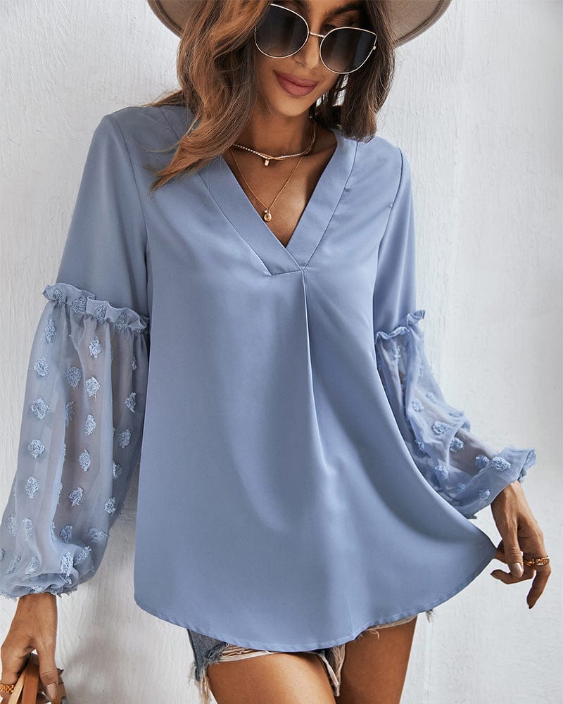 La blusa Anna-Kaci tiene una fabulosa manga transparente con lunares suizos. Tiene escote en V, color liso y corte holgado. Combínala con capris blancos y sandalias para lograr un hermoso look.