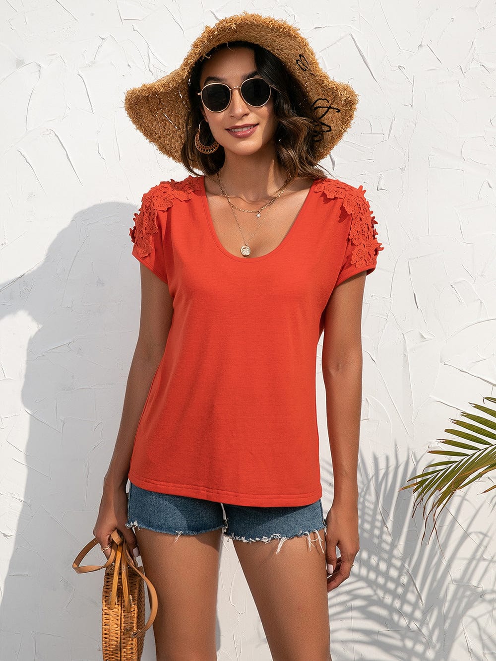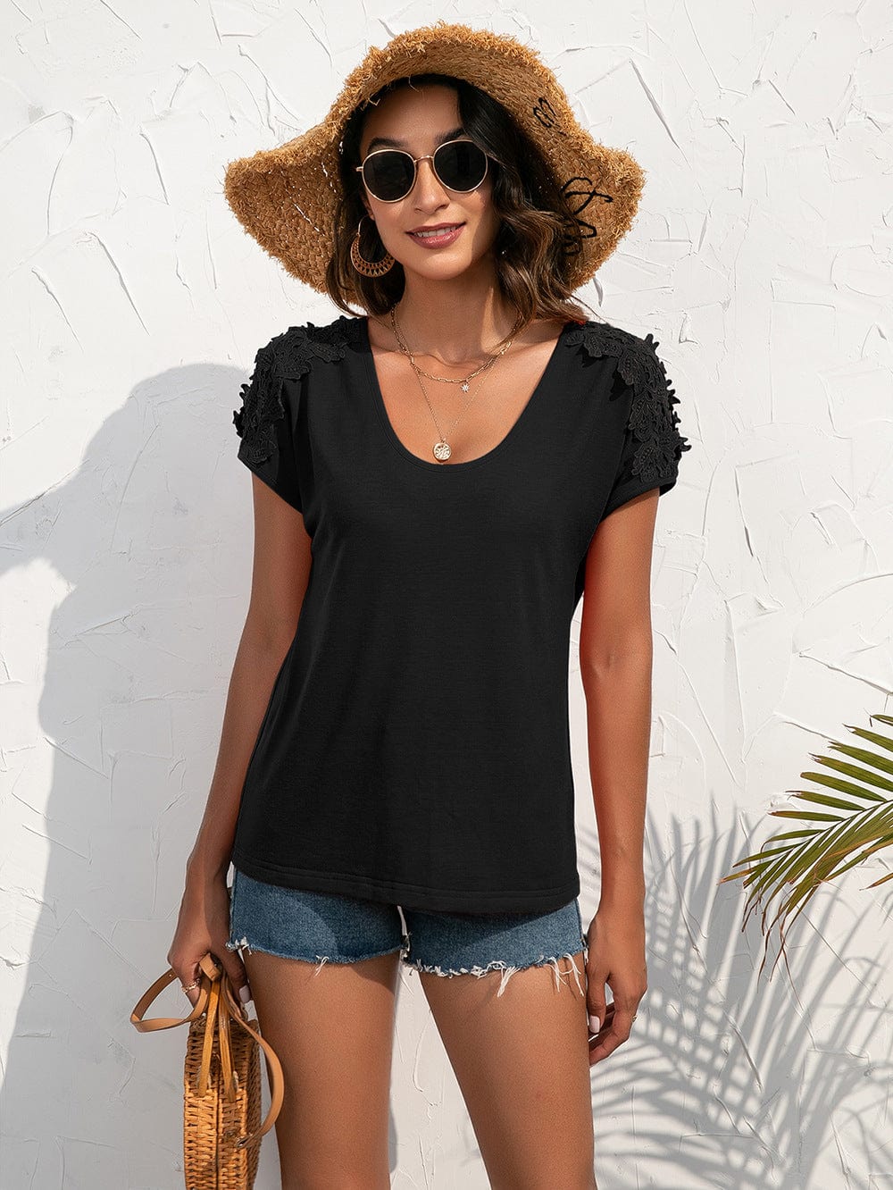 La camisa Anna-Kaci tiene un coqueto corte en el hombro. Tiene escote redondo, detalles de apliques de encaje, mangas cortas y corte regular. Combínala con shorts de mezclilla y sandalias para lograr un look divertido.