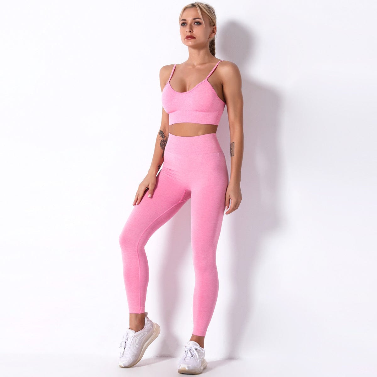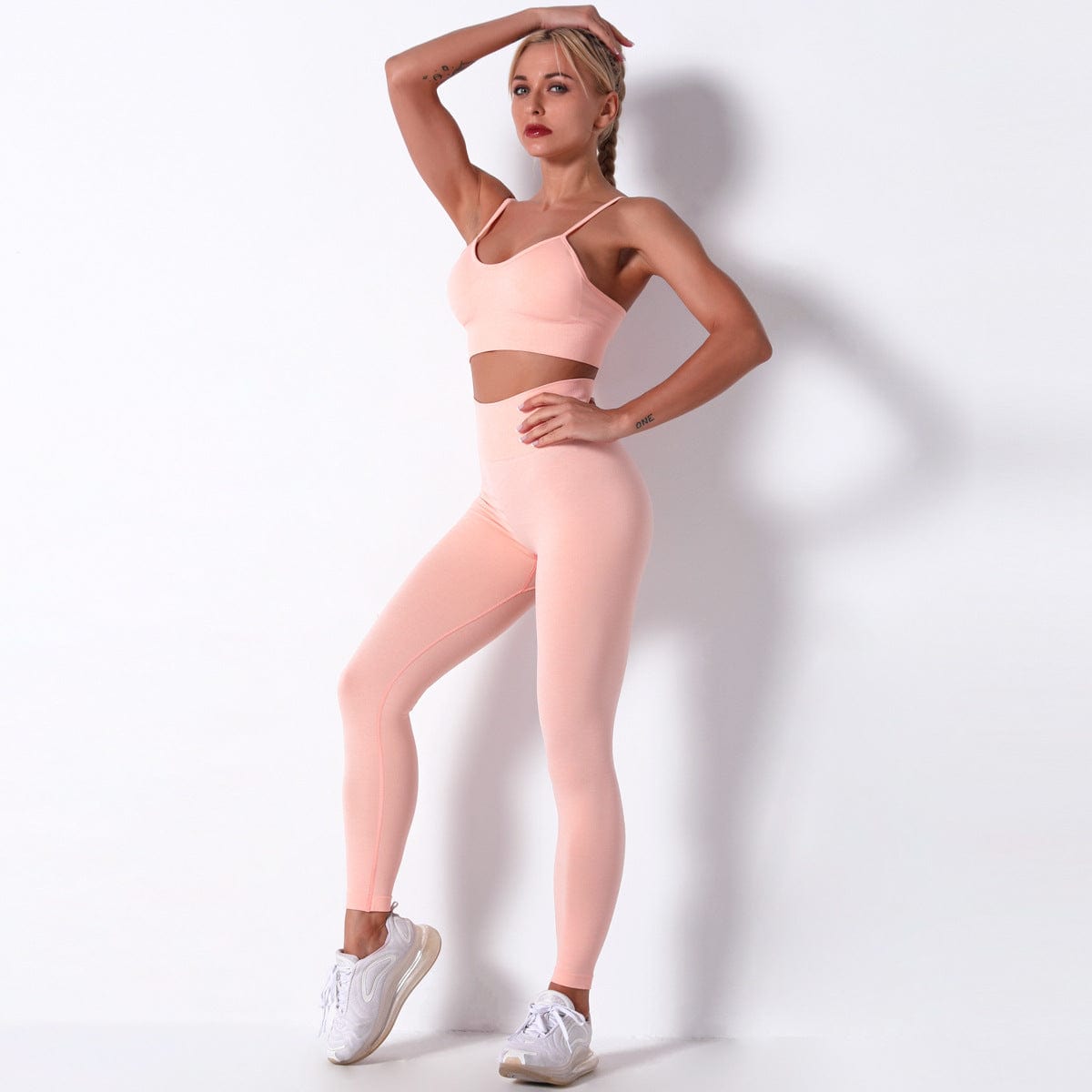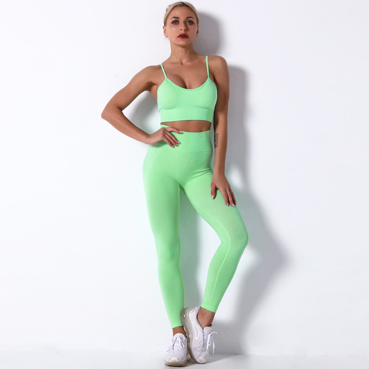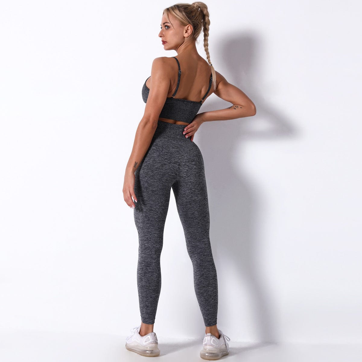El conjunto de dos piezas Anna-Kaci incluye una parte superior e inferior de un solo color a juego. El sujetador deportivo tiene un escote redondo y un diseño de espalda cruzada. Las mallas tienen cintura alta con una costura elevada y contorneada que se ajusta cómodamente a las piernas.