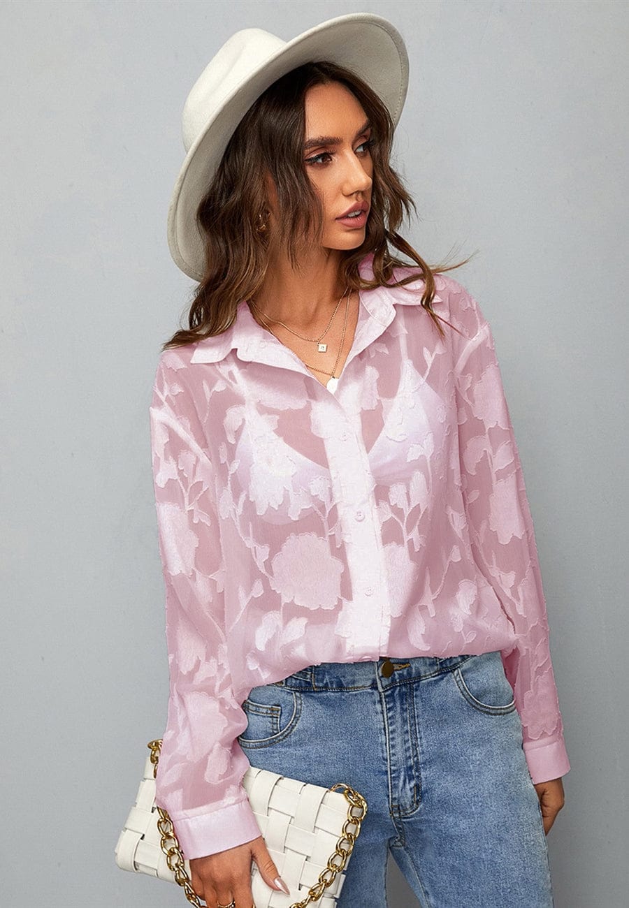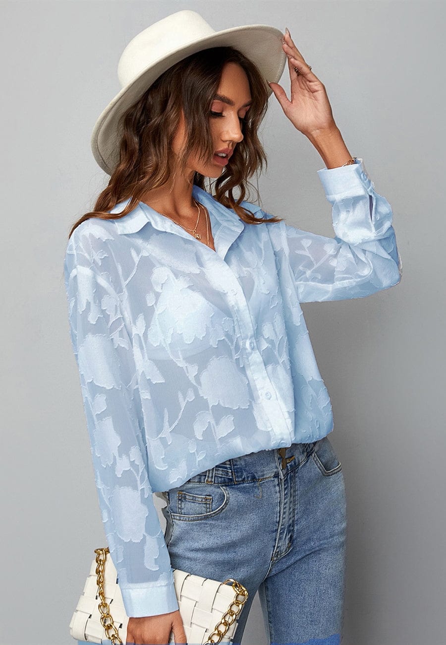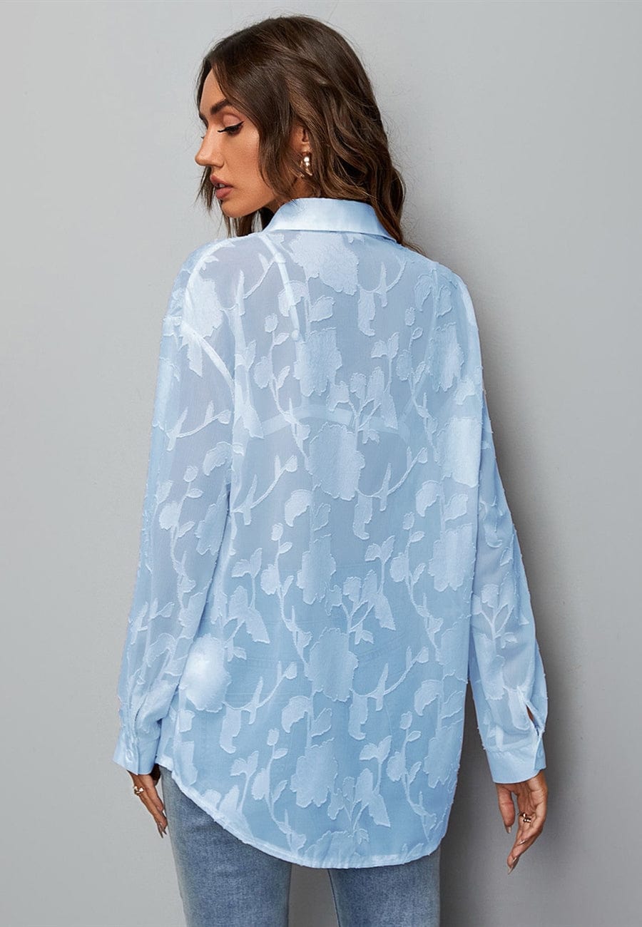 La blusa Anna-Kaci presenta un hermoso diseño de tela con textura floral. Tiene un material transparente, cuello, mangas largas, cierre con botones y un corte holgado. Combínala con pantalones y mocasines para lograr un look sofisticado.