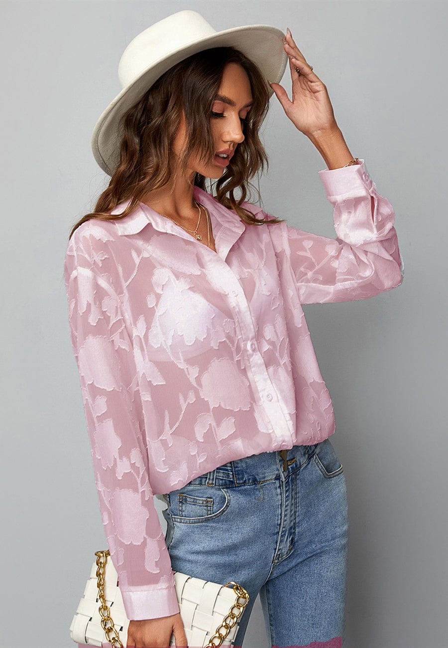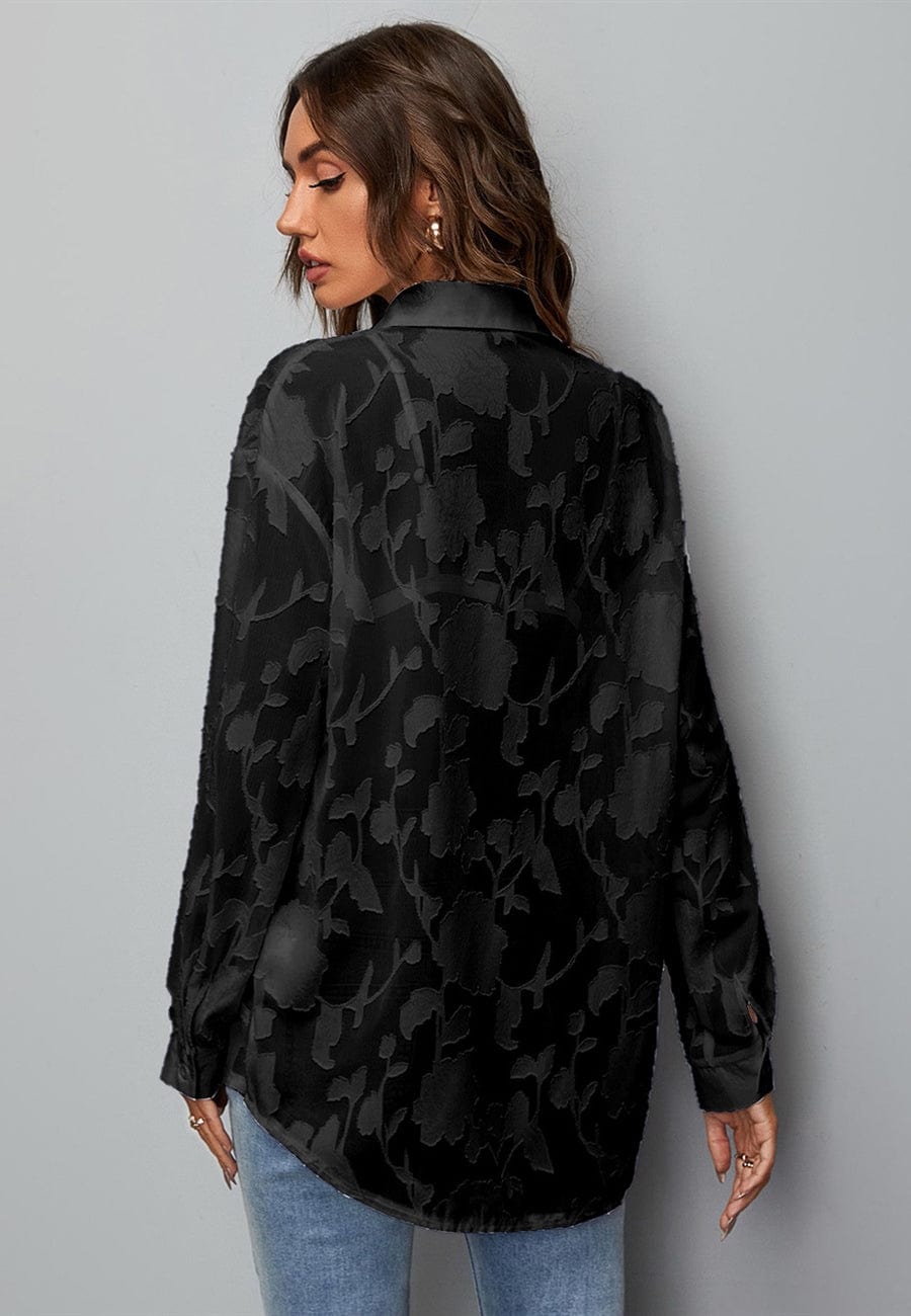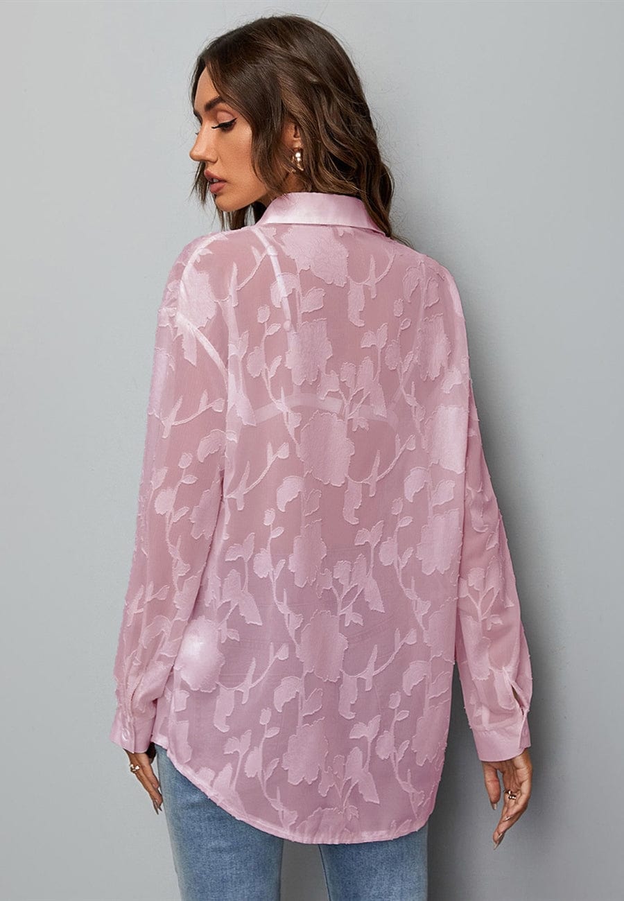 La blusa Anna-Kaci presenta un hermoso diseño de tela con textura floral. Tiene un material transparente, cuello, mangas largas, cierre con botones y un corte holgado. Combínala con pantalones y mocasines para lograr un look sofisticado.