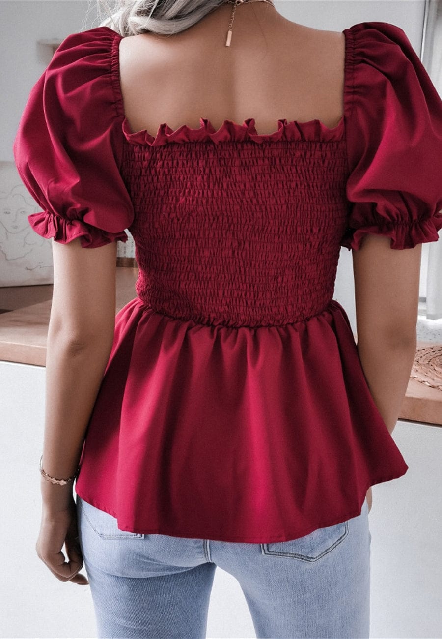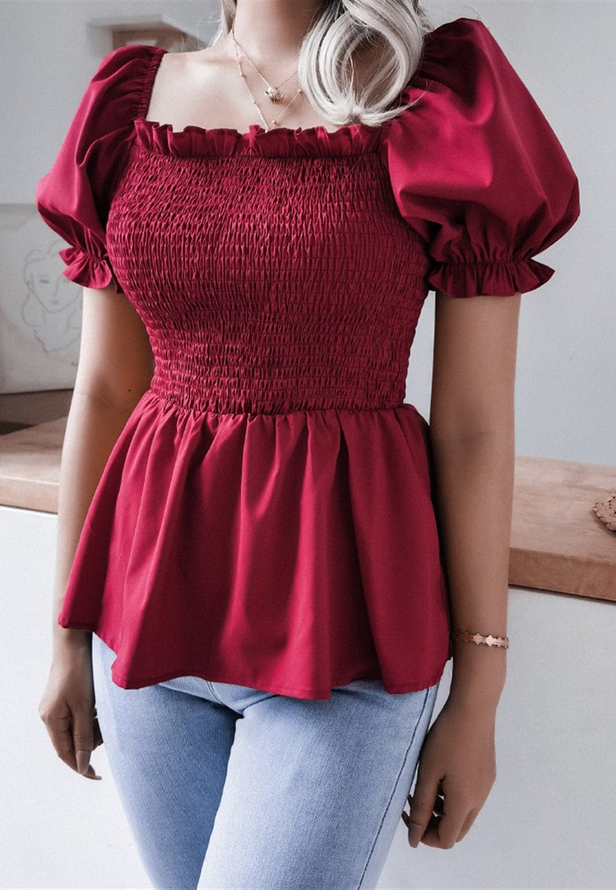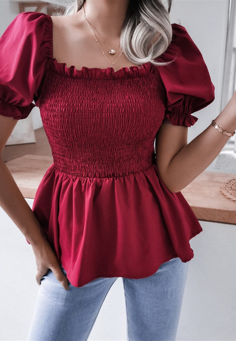 La blusa Anna-Kaci tiene lindas mangas abullonadas. Tiene un color liso, escote cuadrado, corpiño fruncido y dobladillo peplum. Combínala con tus jeans y tacones favoritos para lograr un look magnífico.