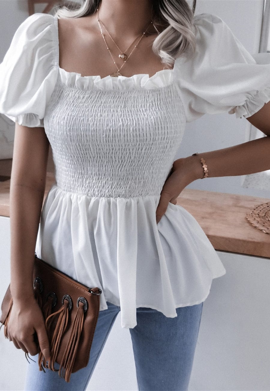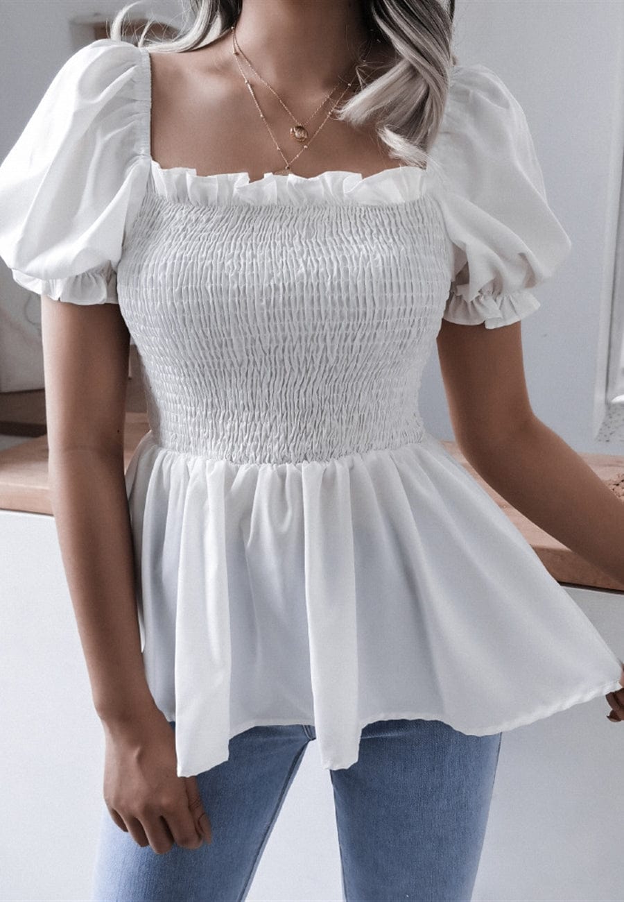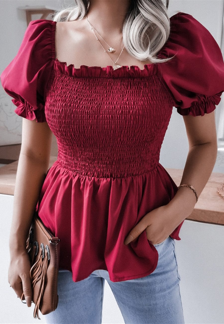La blusa Anna-Kaci tiene lindas mangas abullonadas. Tiene un color liso, escote cuadrado, corpiño fruncido y dobladillo peplum. Combínala con tus jeans y tacones favoritos para lograr un look magnífico.