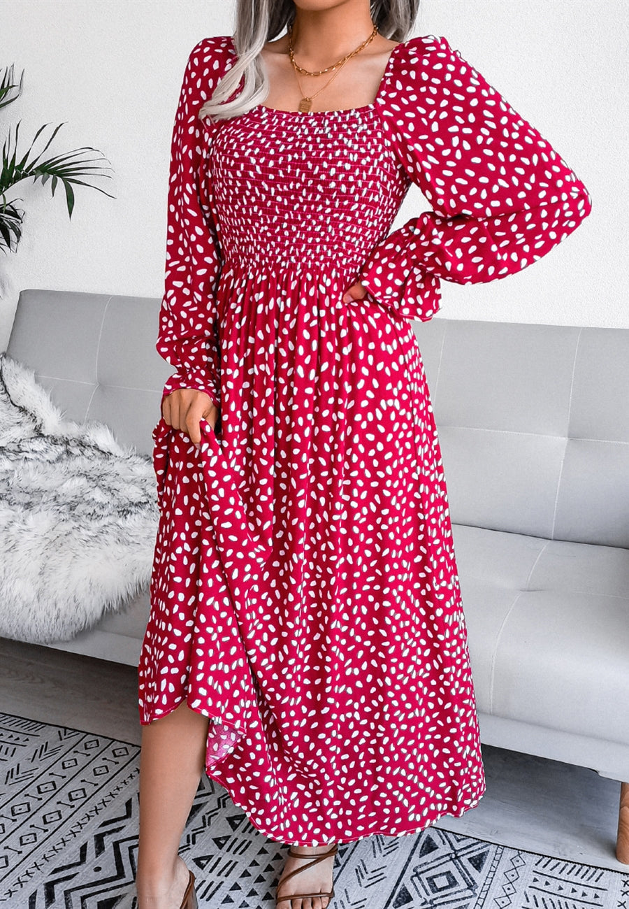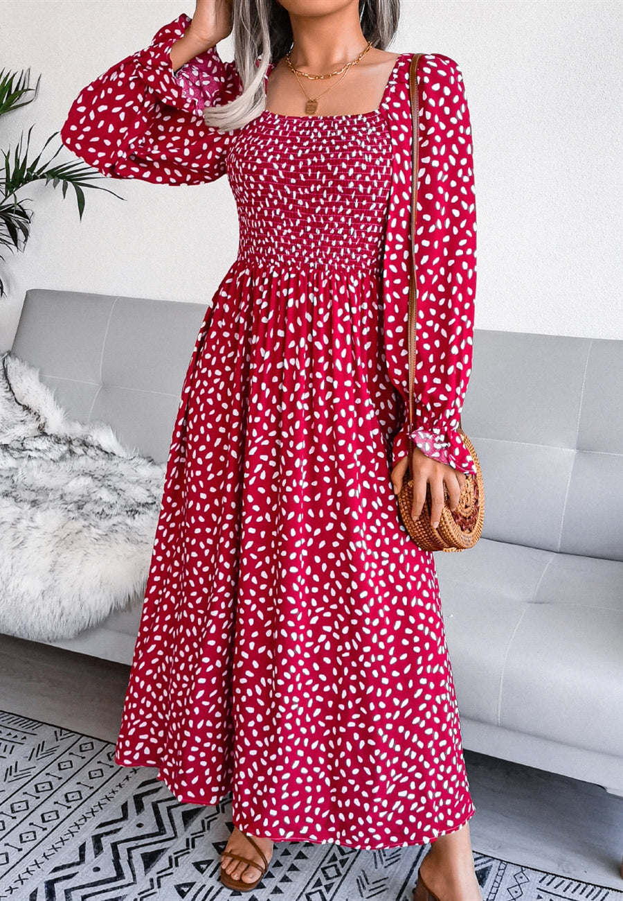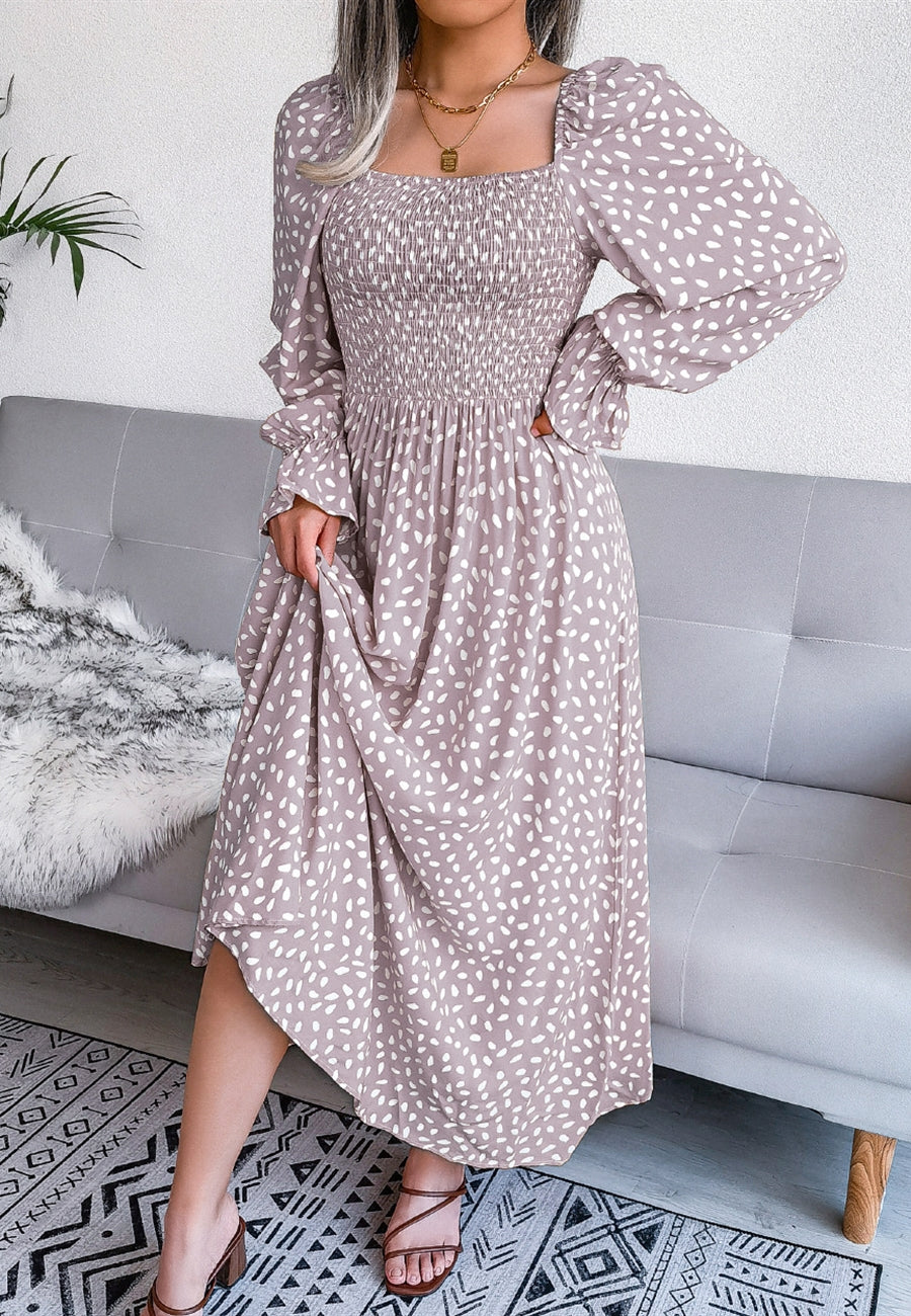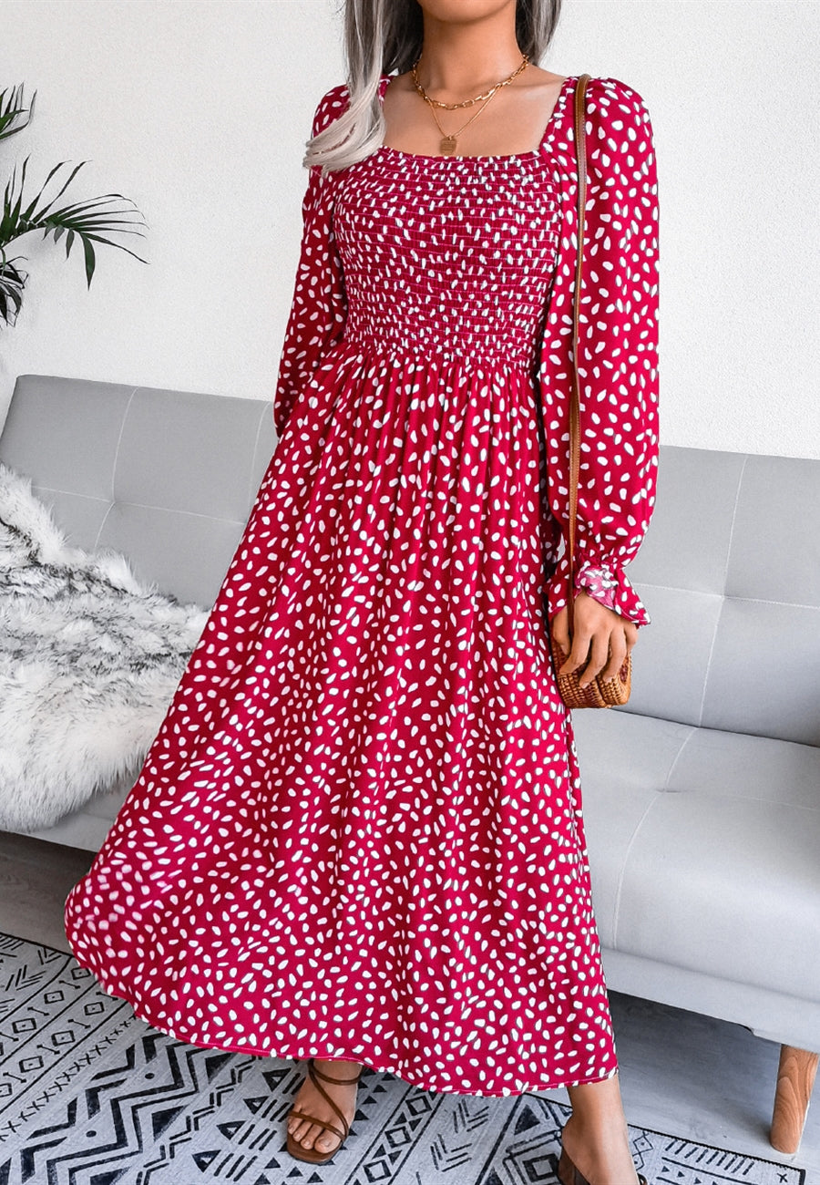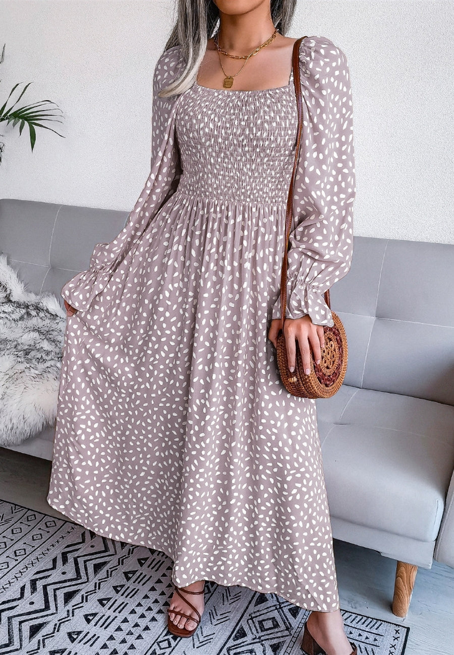 El vestido Anna-Kaci tiene un estampado llamativo de lunares. Tiene escote cuadrado, corpiño fruncido, mangas largas, falda vaporosa y largo por encima del tobillo. Combínalo con una boina y sandalias para lograr un estilo parisino.