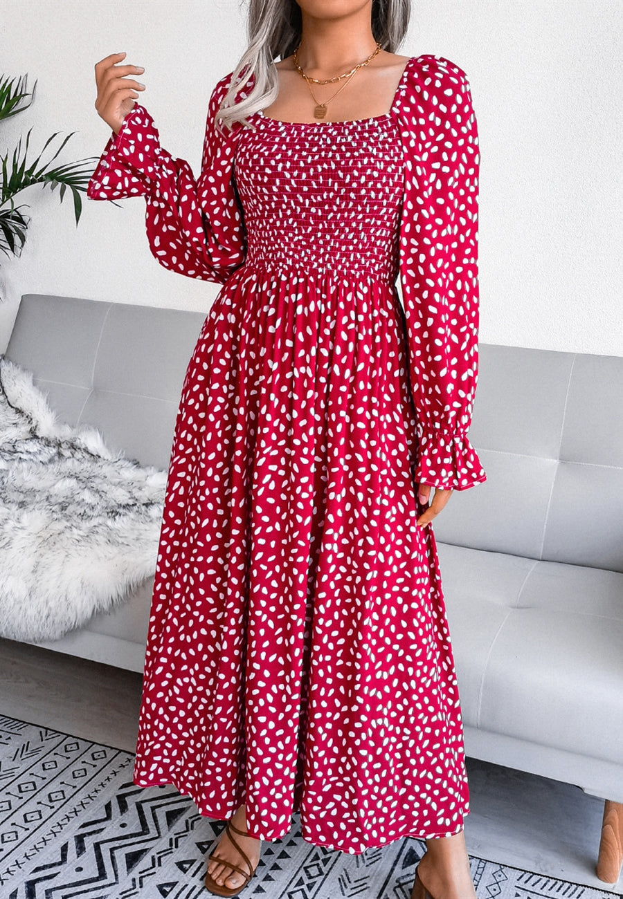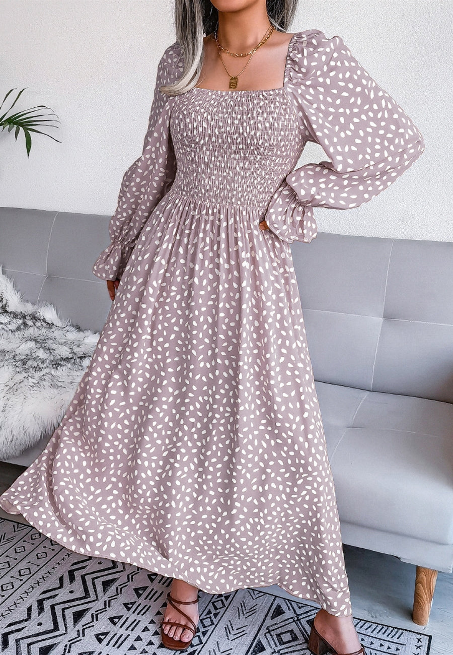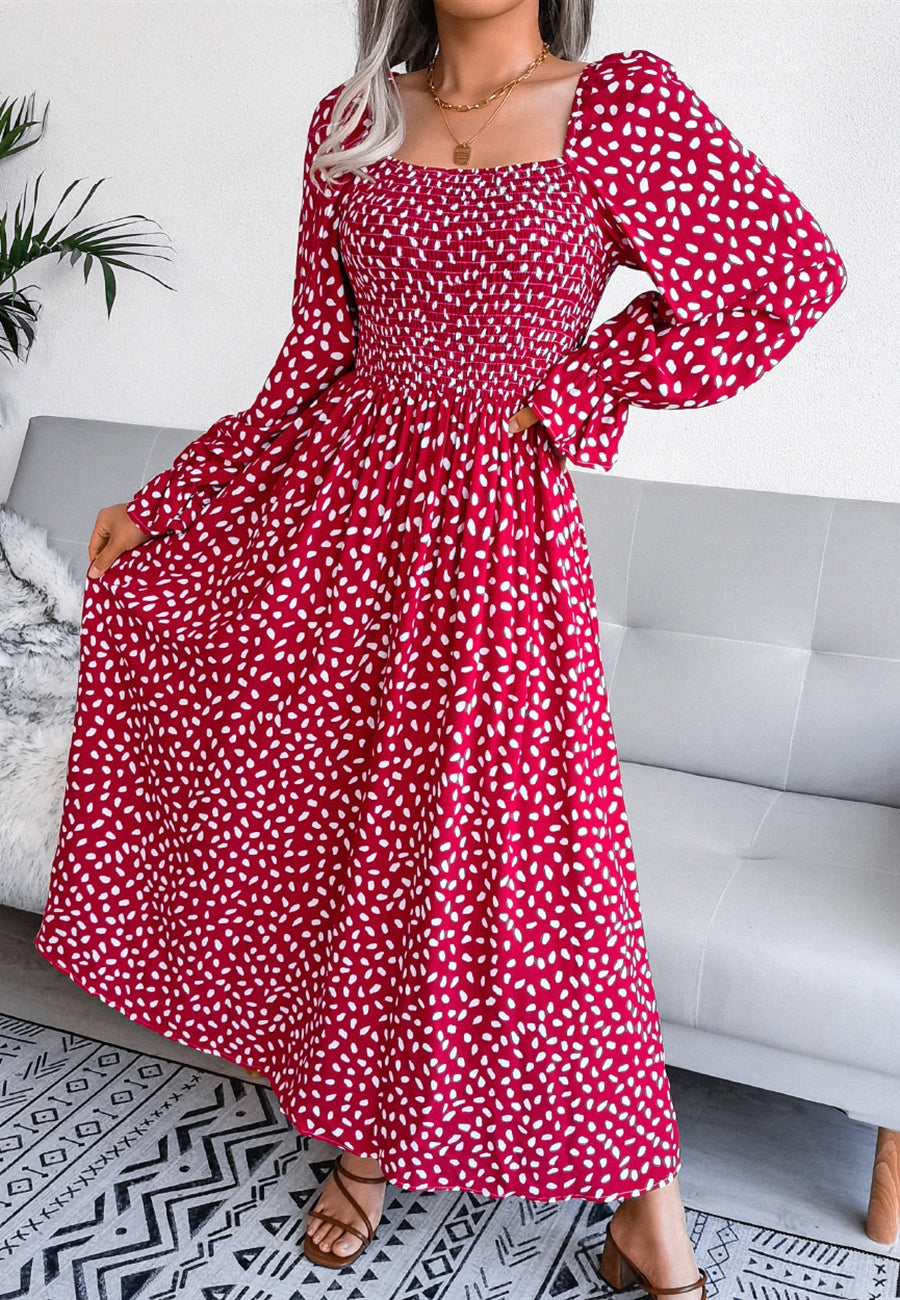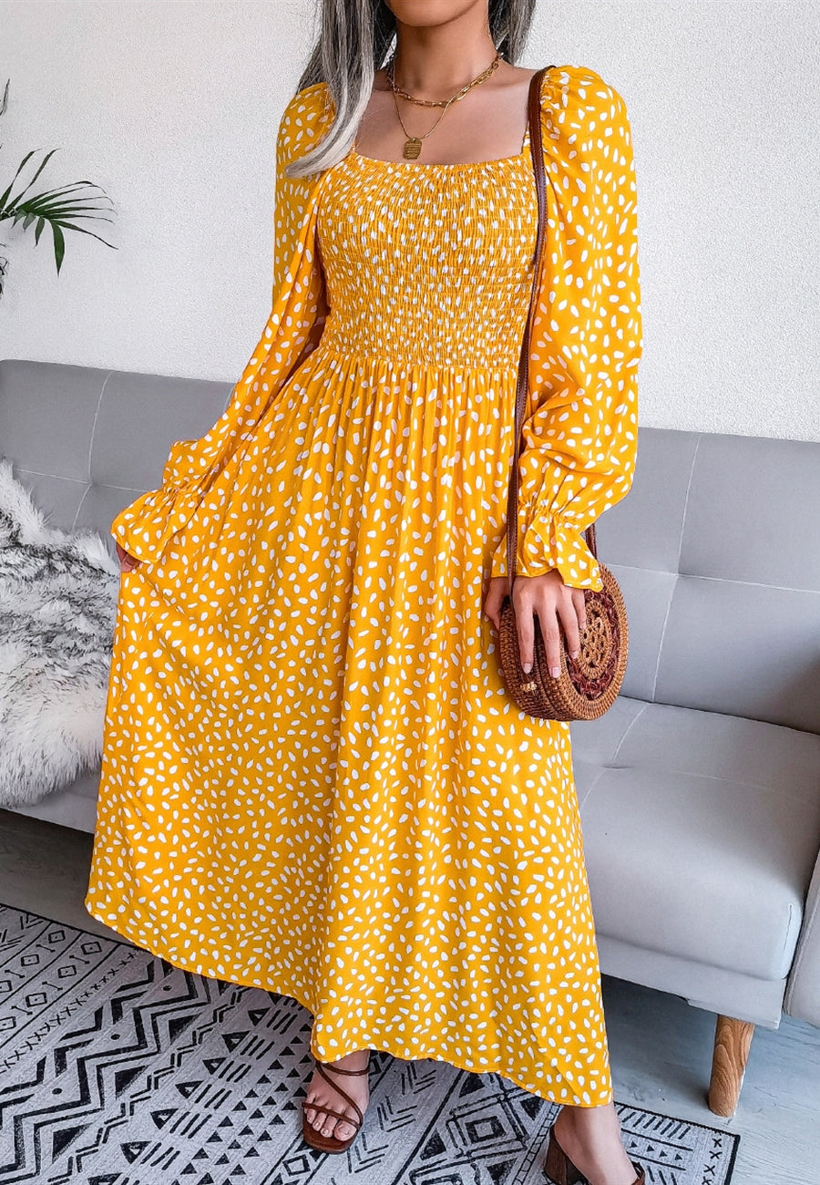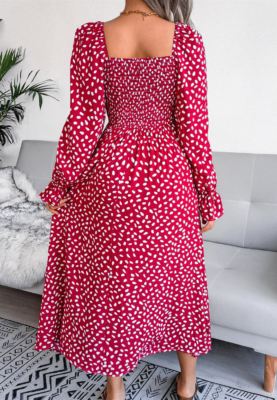 El vestido Anna-Kaci tiene un estampado llamativo de lunares. Tiene escote cuadrado, corpiño fruncido, mangas largas, falda vaporosa y largo por encima del tobillo. Combínalo con una boina y sandalias para lograr un estilo parisino.