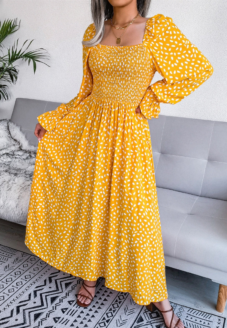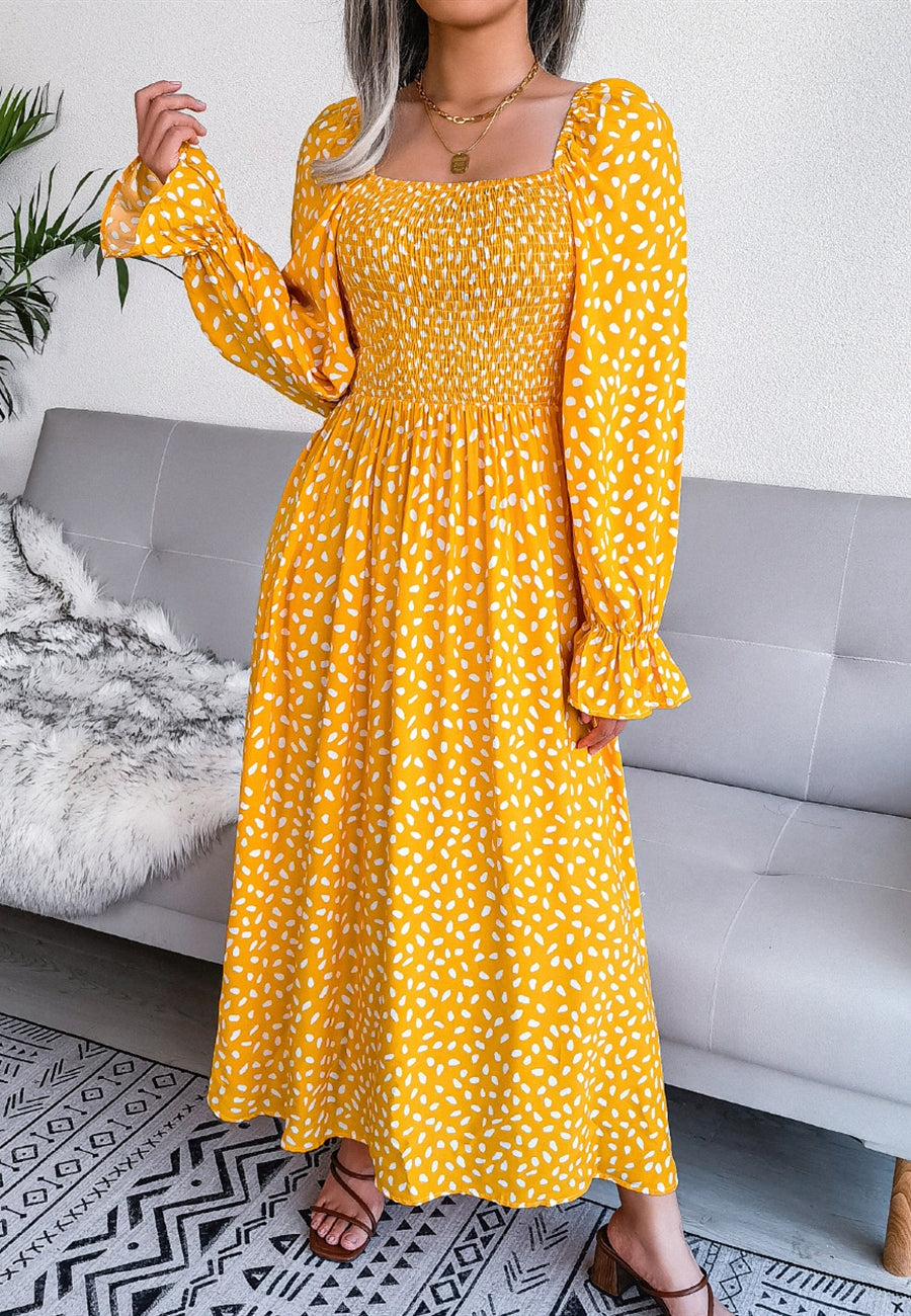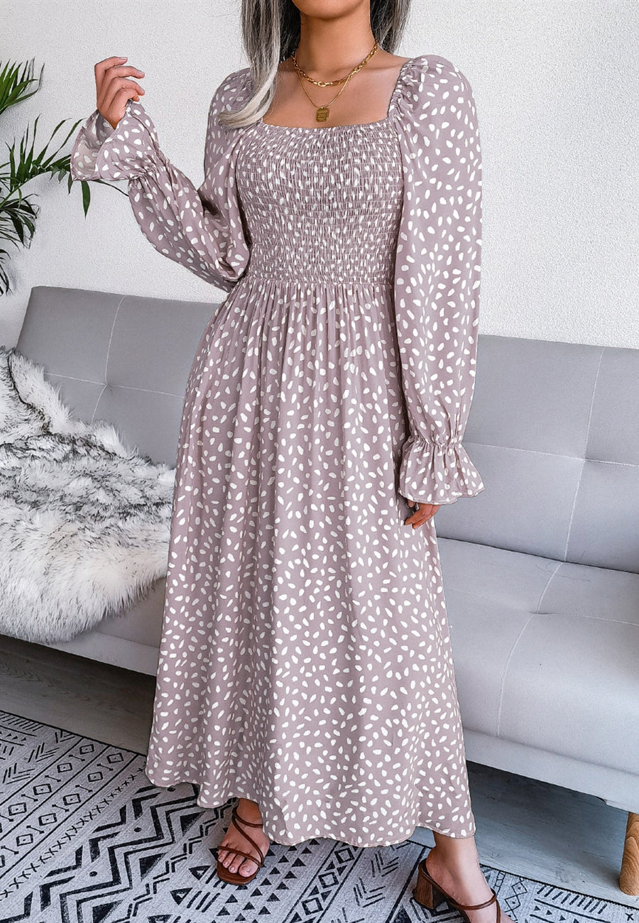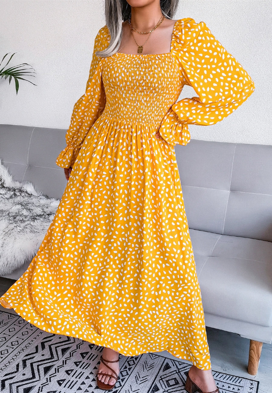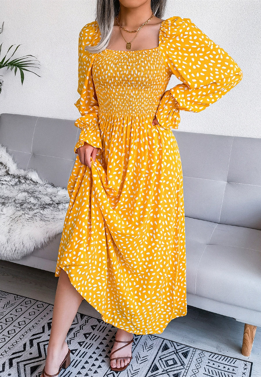 El vestido Anna-Kaci tiene un estampado llamativo de lunares. Tiene escote cuadrado, corpiño fruncido, mangas largas, falda vaporosa y largo por encima del tobillo. Combínalo con una boina y sandalias para lograr un estilo parisino.