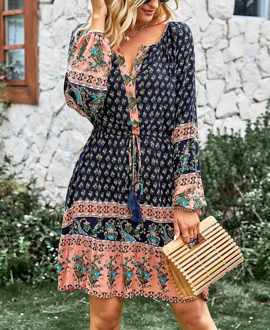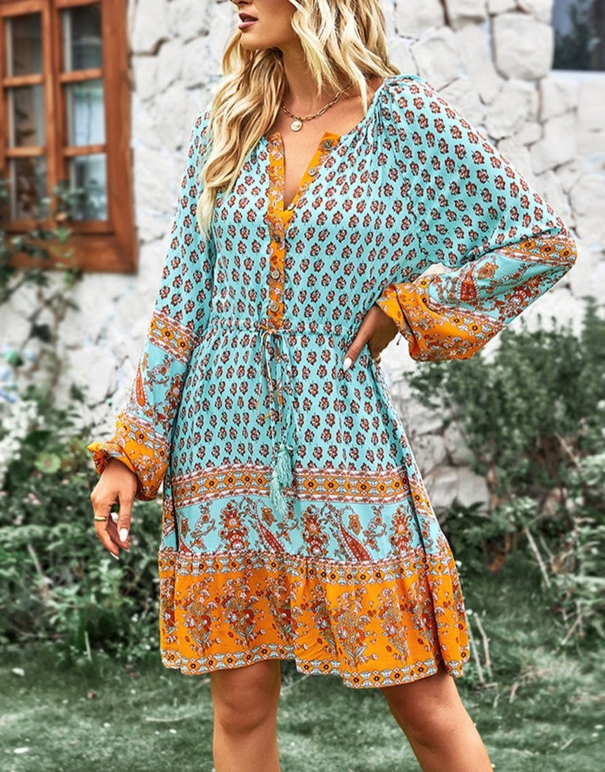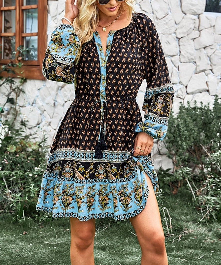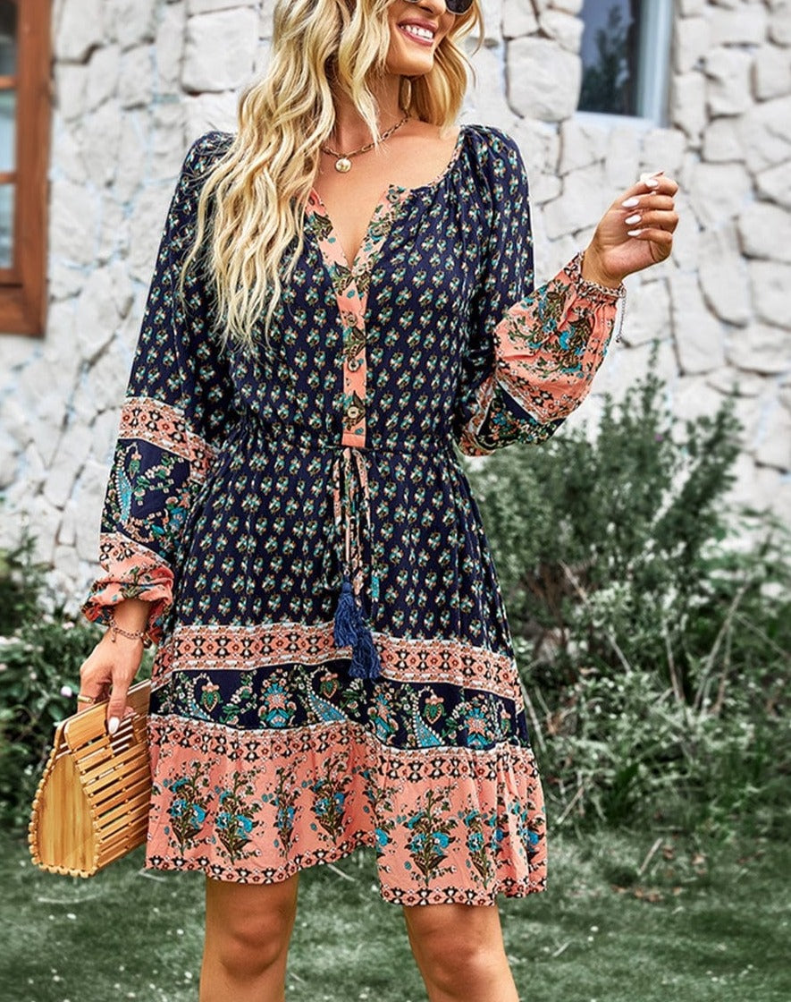El vestido Anna-Kaci tiene un bonito lazo con borlas en la cintura. Tiene escote redondo, detalle de botones, mangas largas, estampados bohemios, falda vaporosa y largo por encima de la rodilla. Combínalo con botas y gafas de sol para lograr un look elegante.