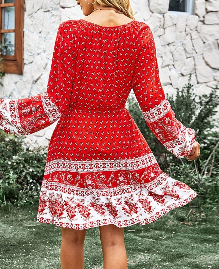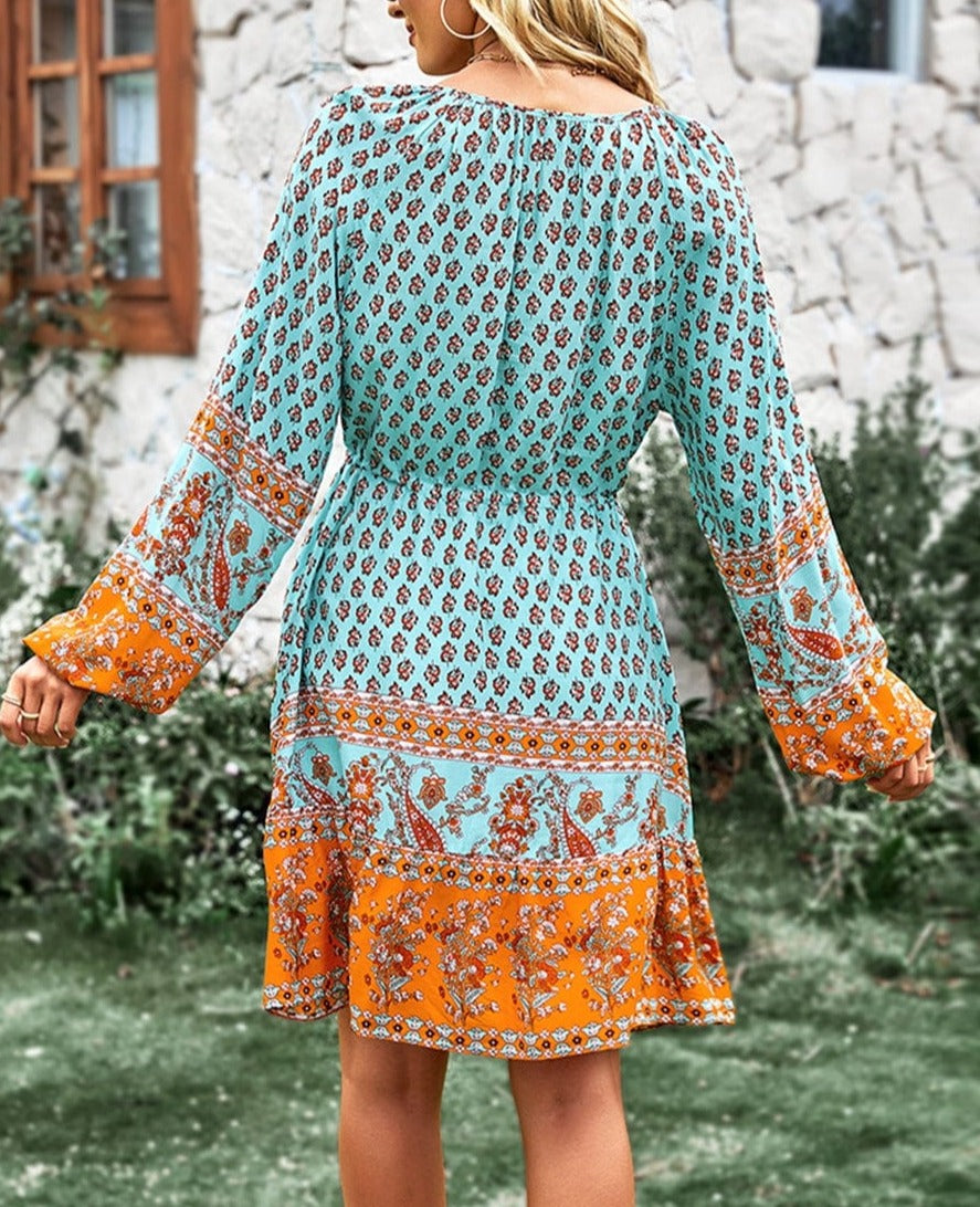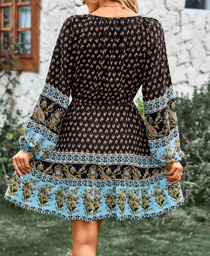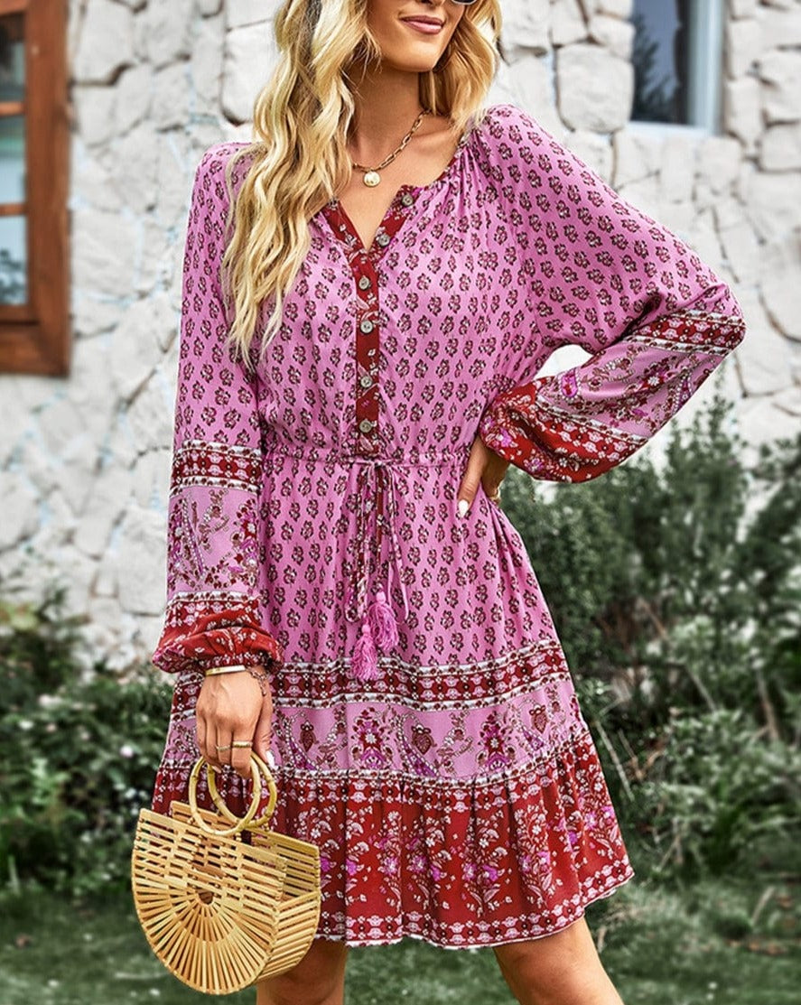 El vestido Anna-Kaci tiene un bonito lazo con borlas en la cintura. Tiene escote redondo, detalle de botones, mangas largas, estampados bohemios, falda vaporosa y largo por encima de la rodilla. Combínalo con botas y gafas de sol para lograr un look elegante.