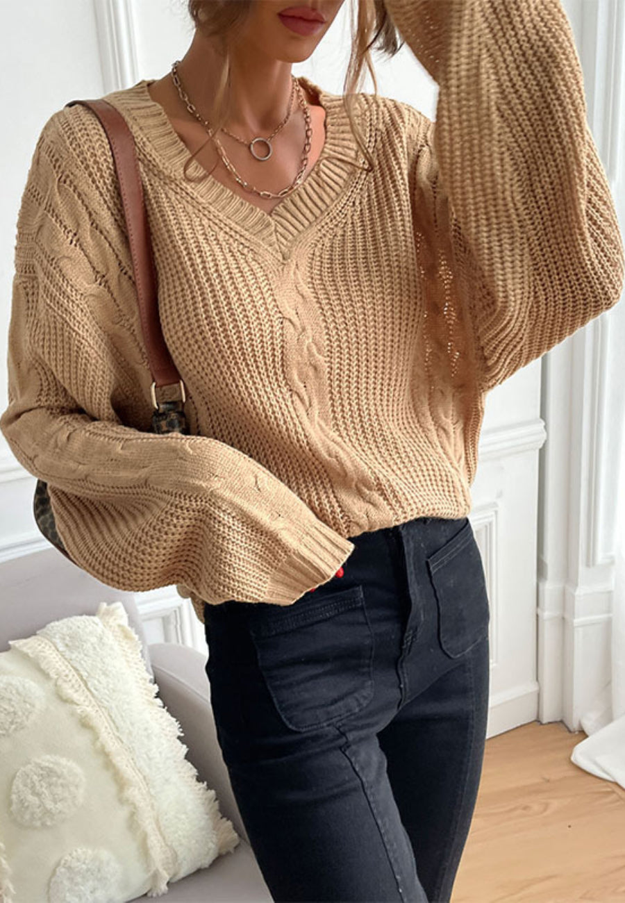 El suéter Anna-Kaci está elaborado con un tejido de cable clásico. Tiene un color liso, escote en V, hombros caídos, mangas largas, corte regular y largo. Combínalo con jeans y botas para lograr un look acogedor.