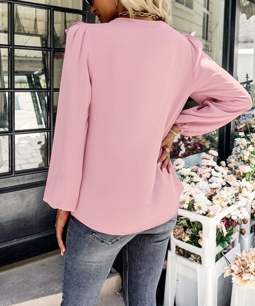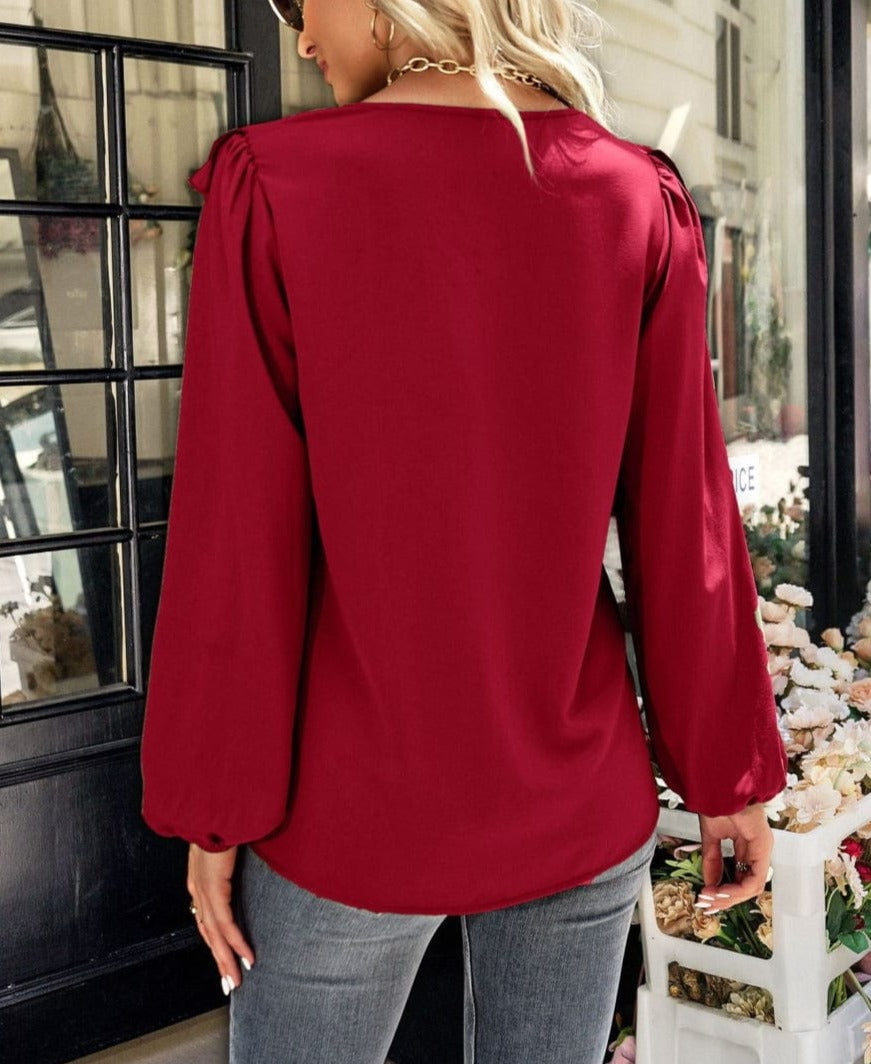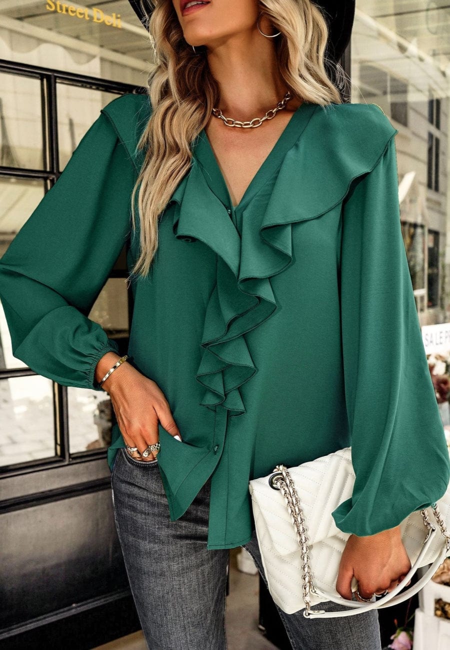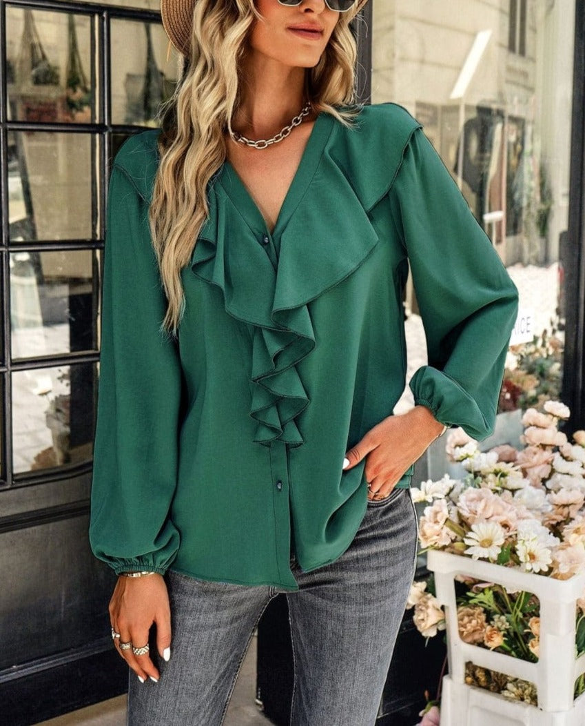 La blusa Anna-Kaci tiene un hermoso volante en la parte delantera. Es de color liso, tiene escote en V, mangas abullonadas y un corte regular. Combínala con pantalones y mocasines para lograr un estilo elegante.