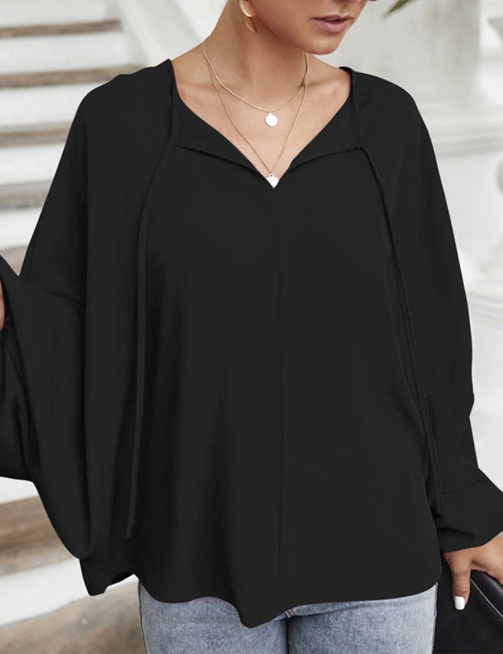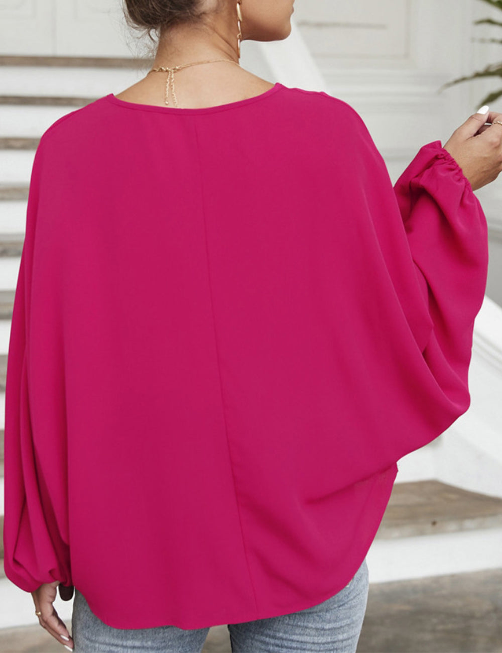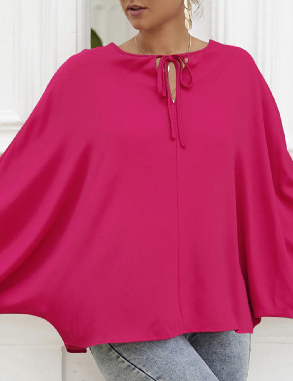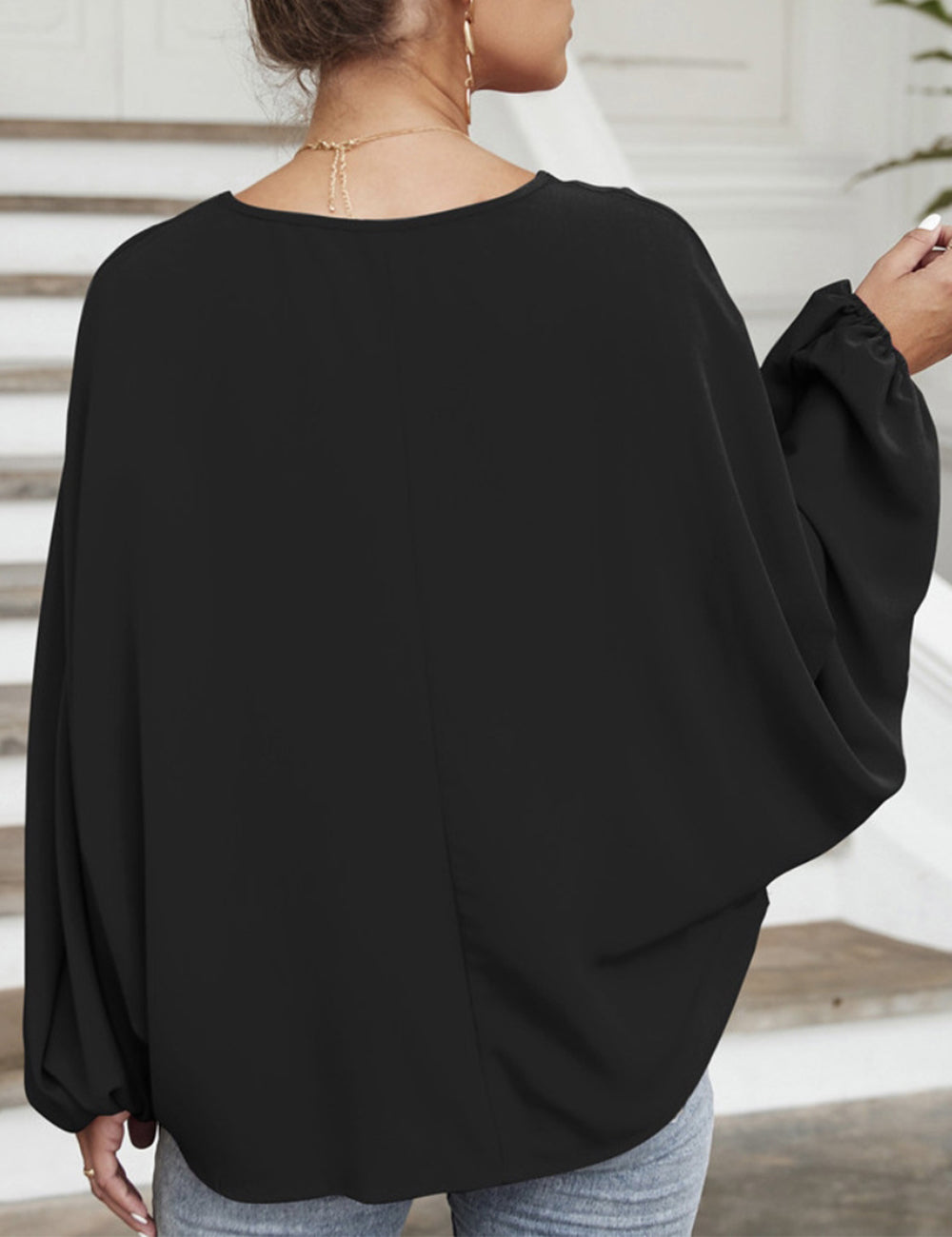 La blusa Anna-Kaci tiene mangas dolman únicas. Tiene un escote redondo con lazo, un color liso y un corte holgado. Combínala con una falda vaquera y botas para lograr un look fabuloso.