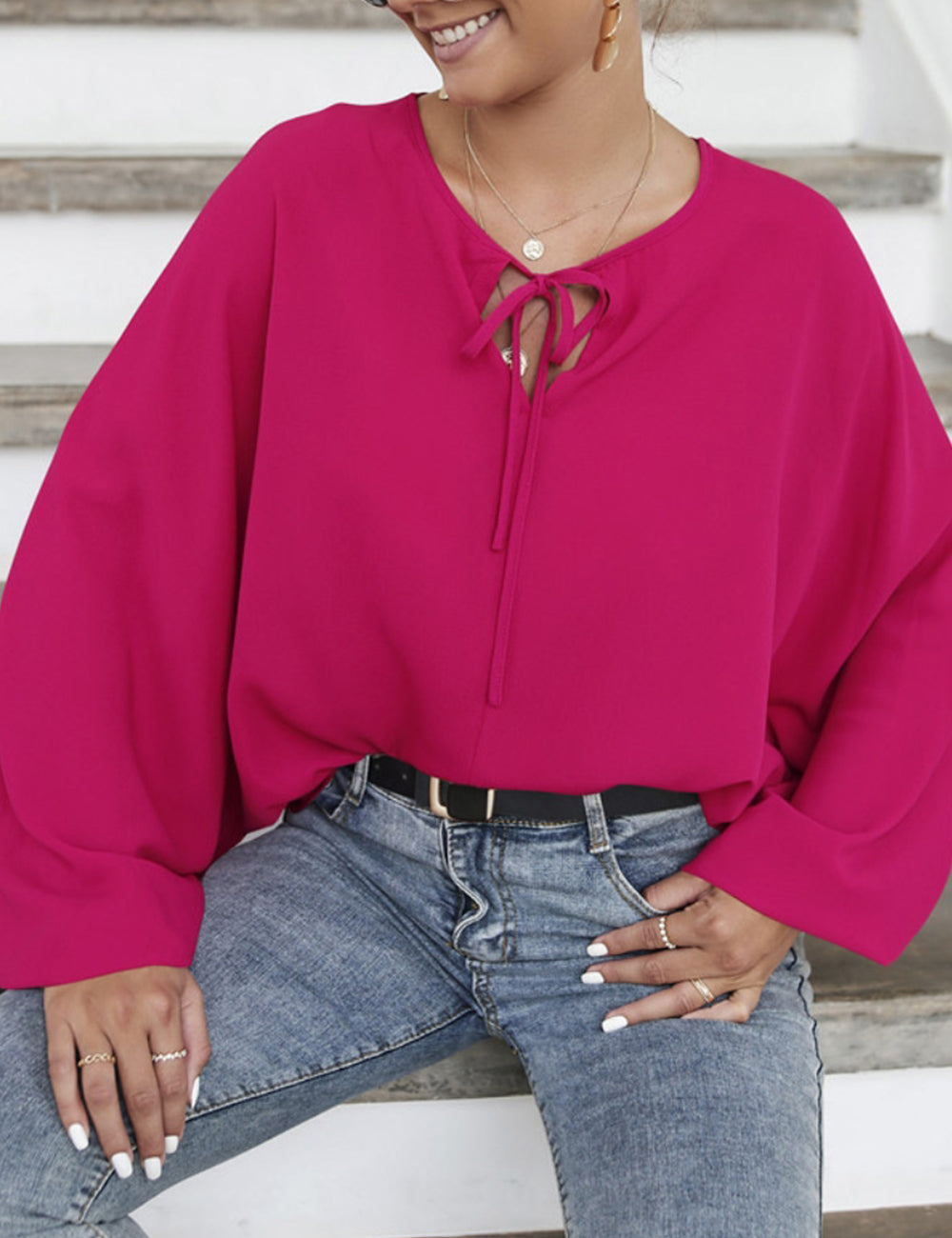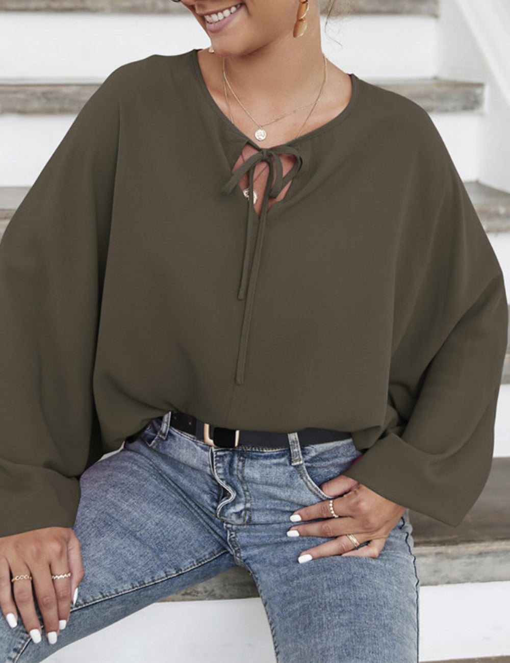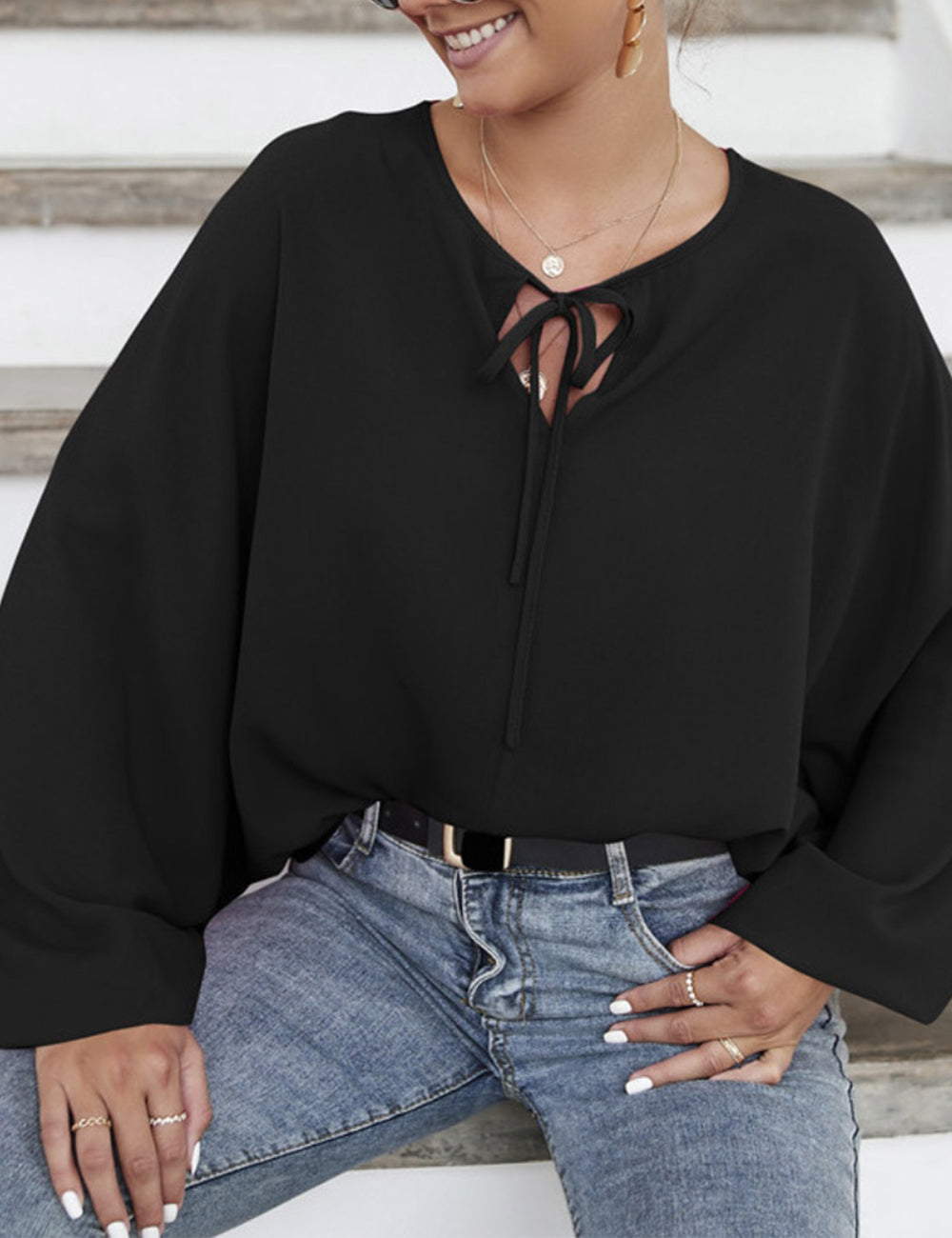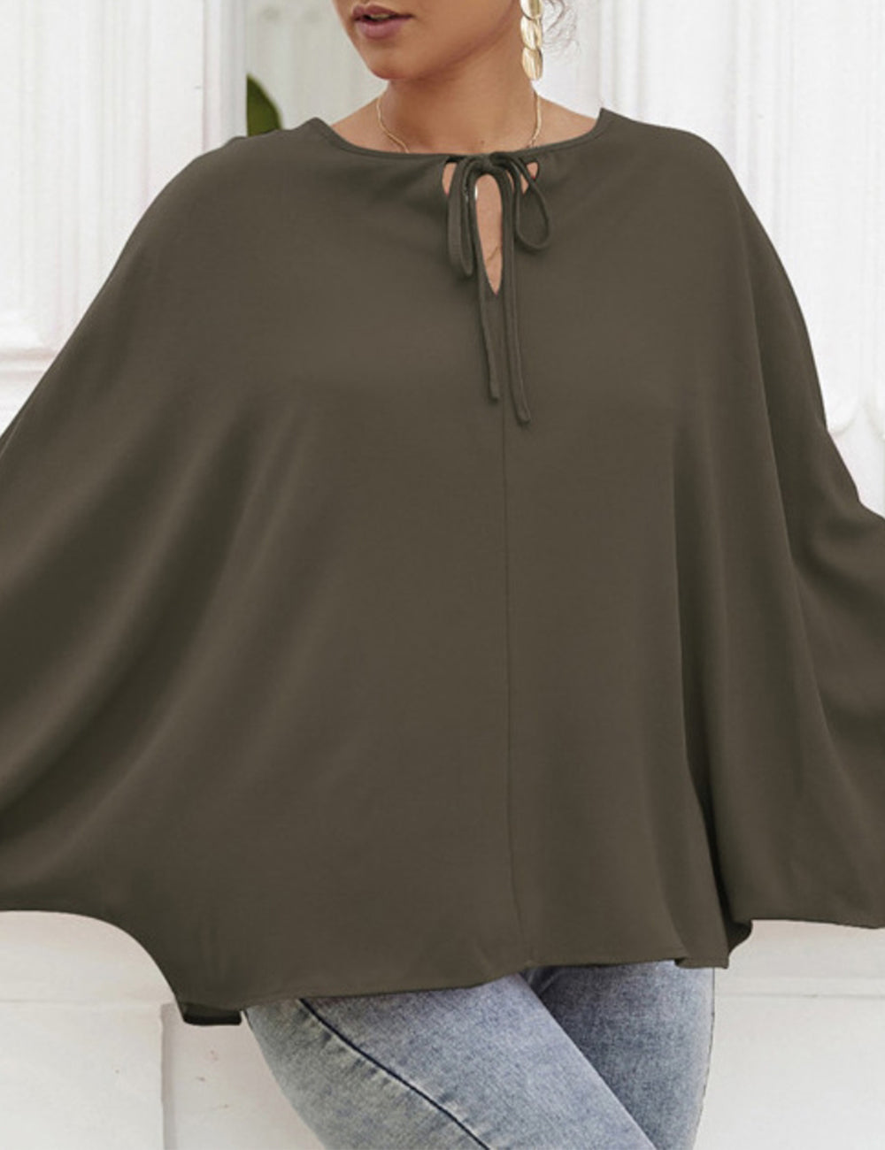 La blusa Anna-Kaci tiene mangas dolman únicas. Tiene un escote redondo con lazo, un color liso y un corte holgado. Combínala con una falda vaquera y botas para lograr un look fabuloso.