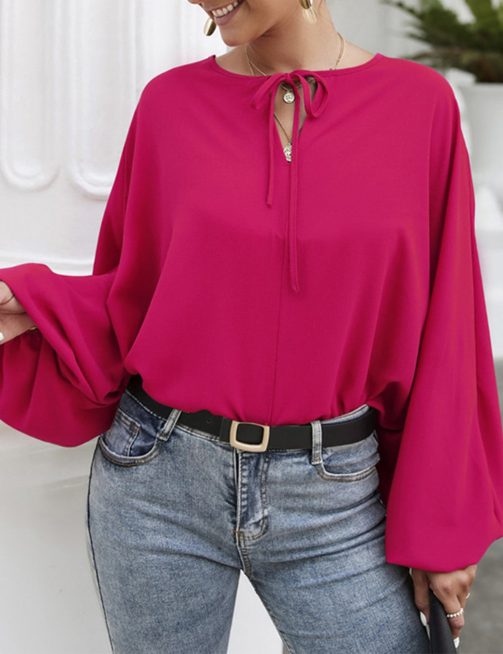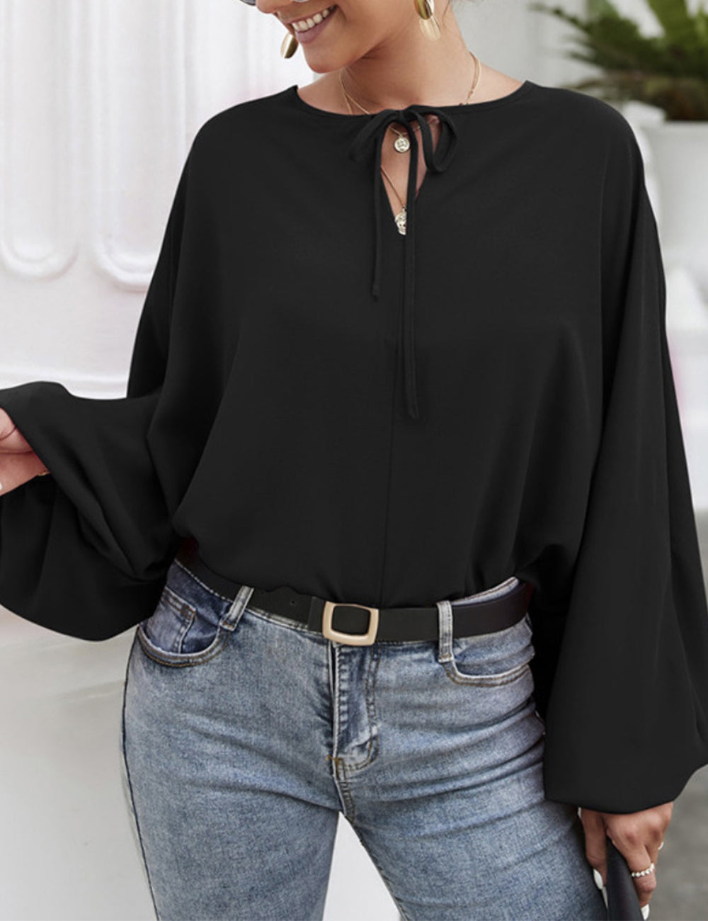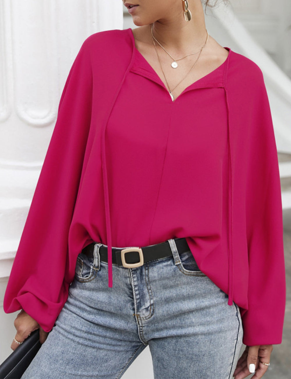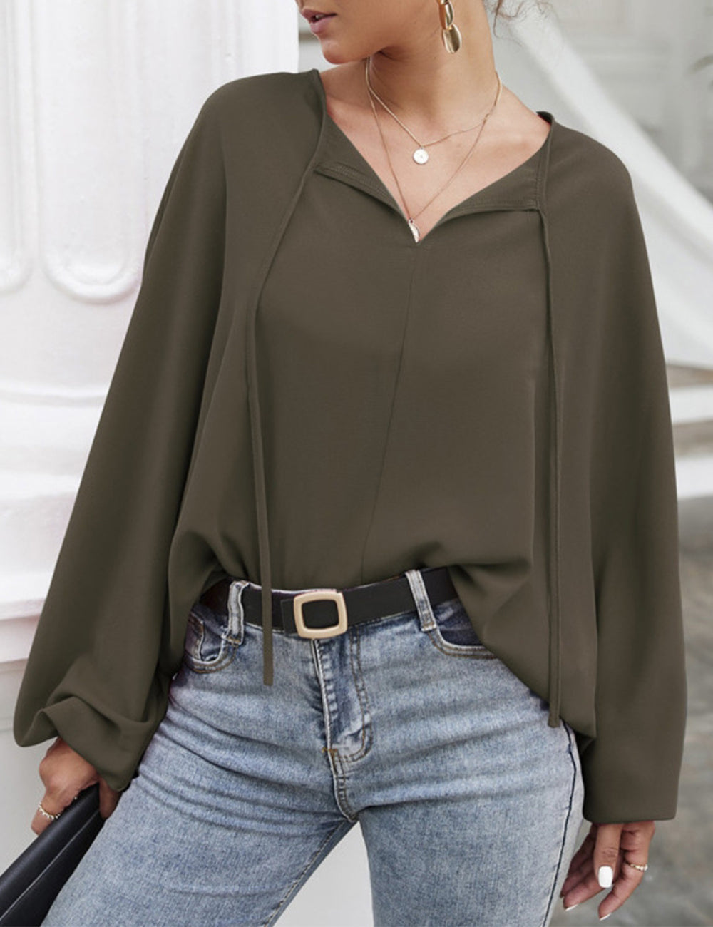 La blusa Anna-Kaci tiene mangas dolman únicas. Tiene un escote redondo con lazo, un color liso y un corte holgado. Combínala con una falda vaquera y botas para lograr un look fabuloso.