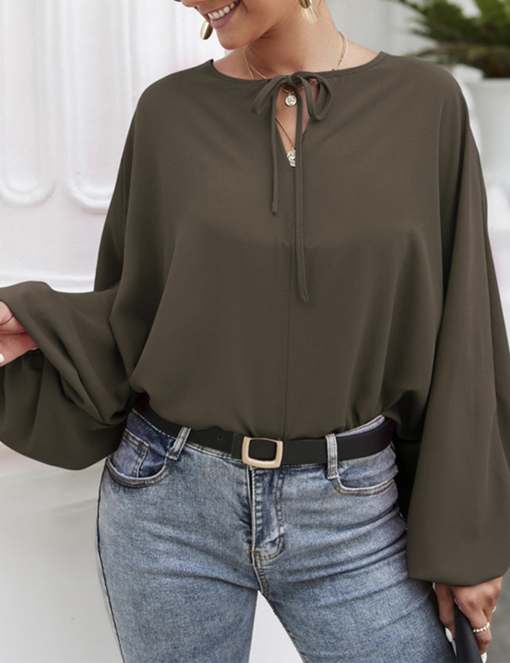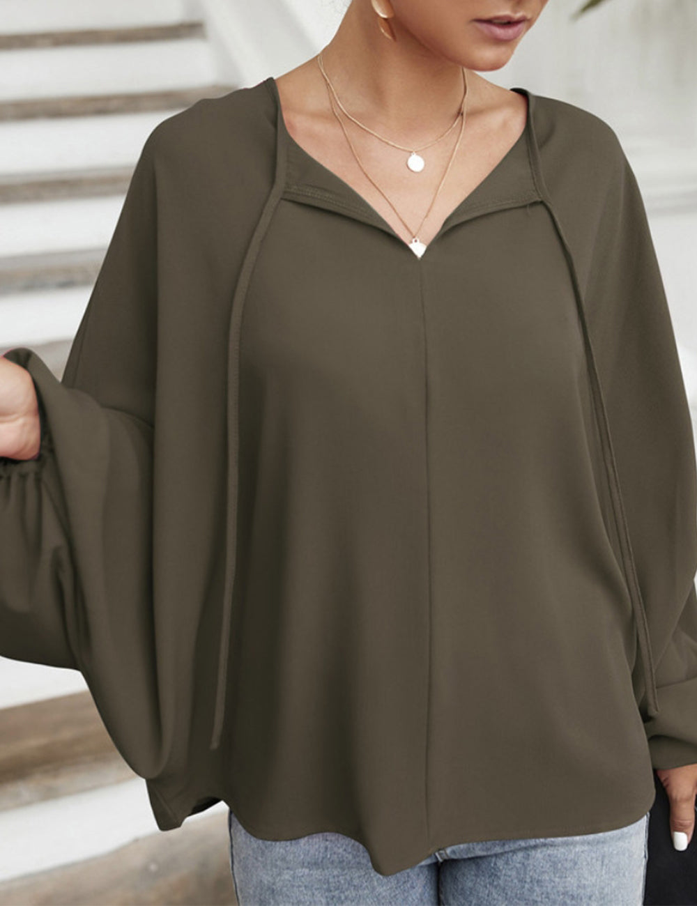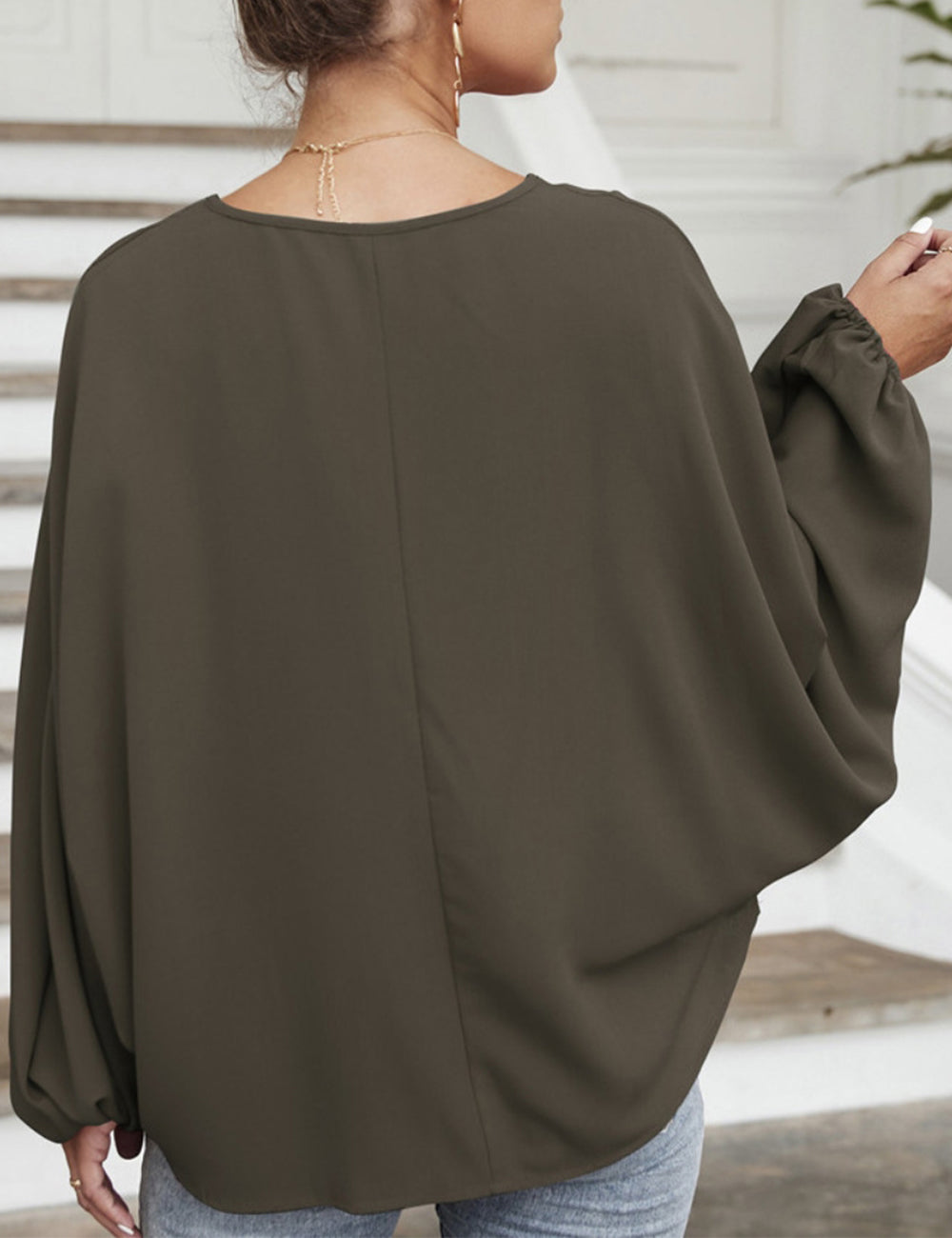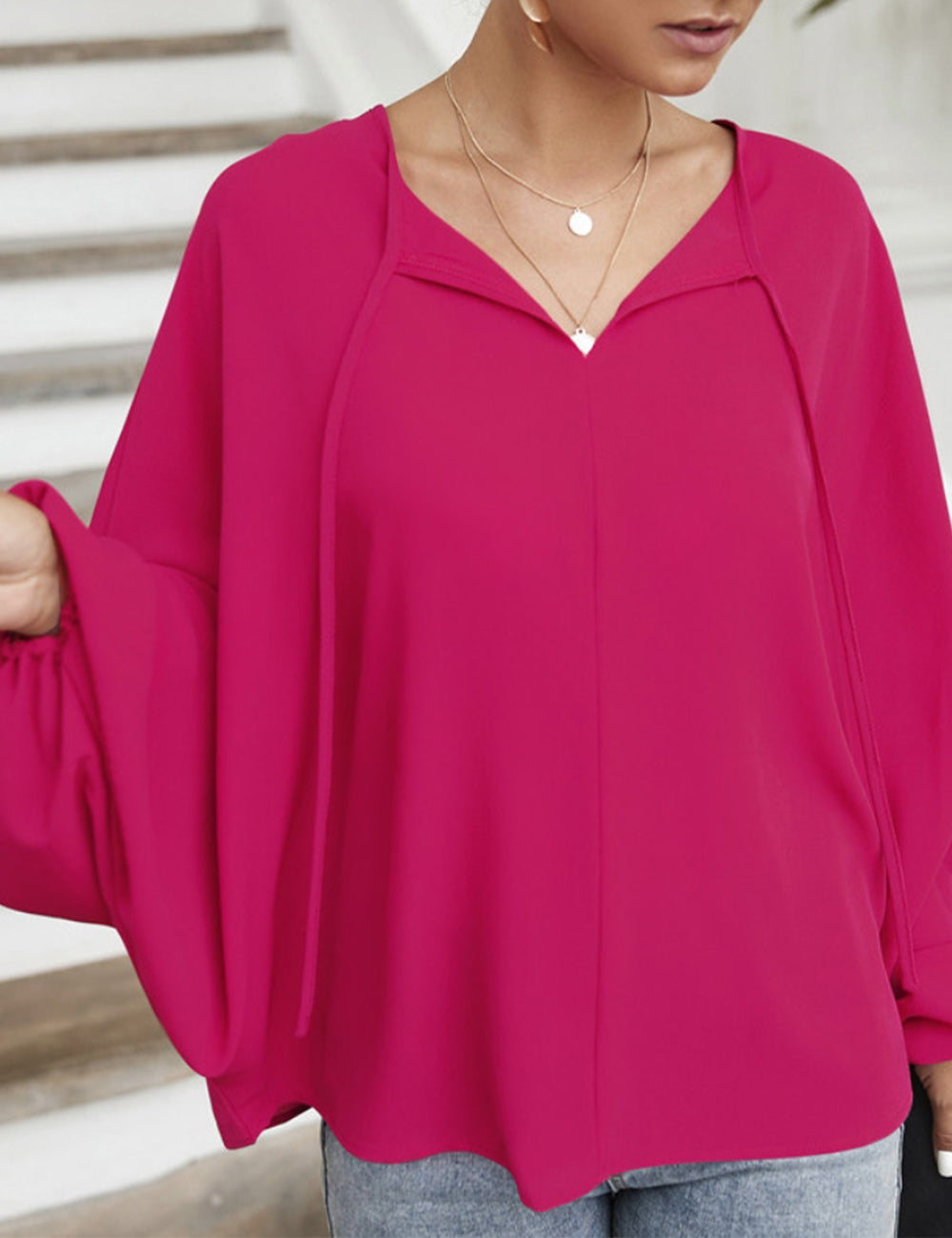 La blusa Anna-Kaci tiene mangas dolman únicas. Tiene un escote redondo con lazo, un color liso y un corte holgado. Combínala con una falda vaquera y botas para lograr un look fabuloso.