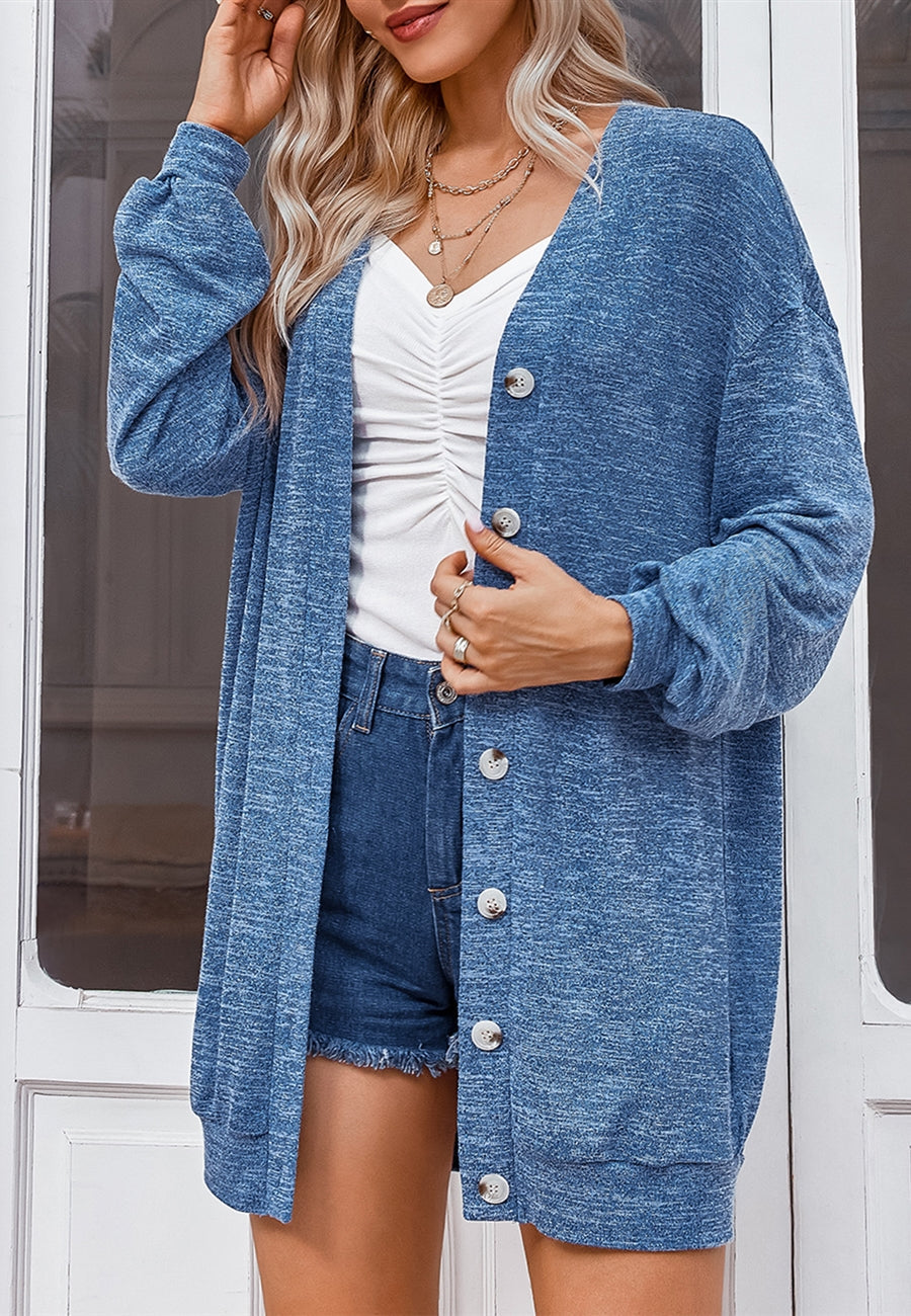 El cárdigan Anna-Kaci está elaborado con un tejido de punto teñido espacial. Tiene botones en la parte delantera, hombros caídos, mangas largas, corte regular y largo largo. Llévalo encima de una camiseta básica y pantalones cortos para lograr un look fantástico.