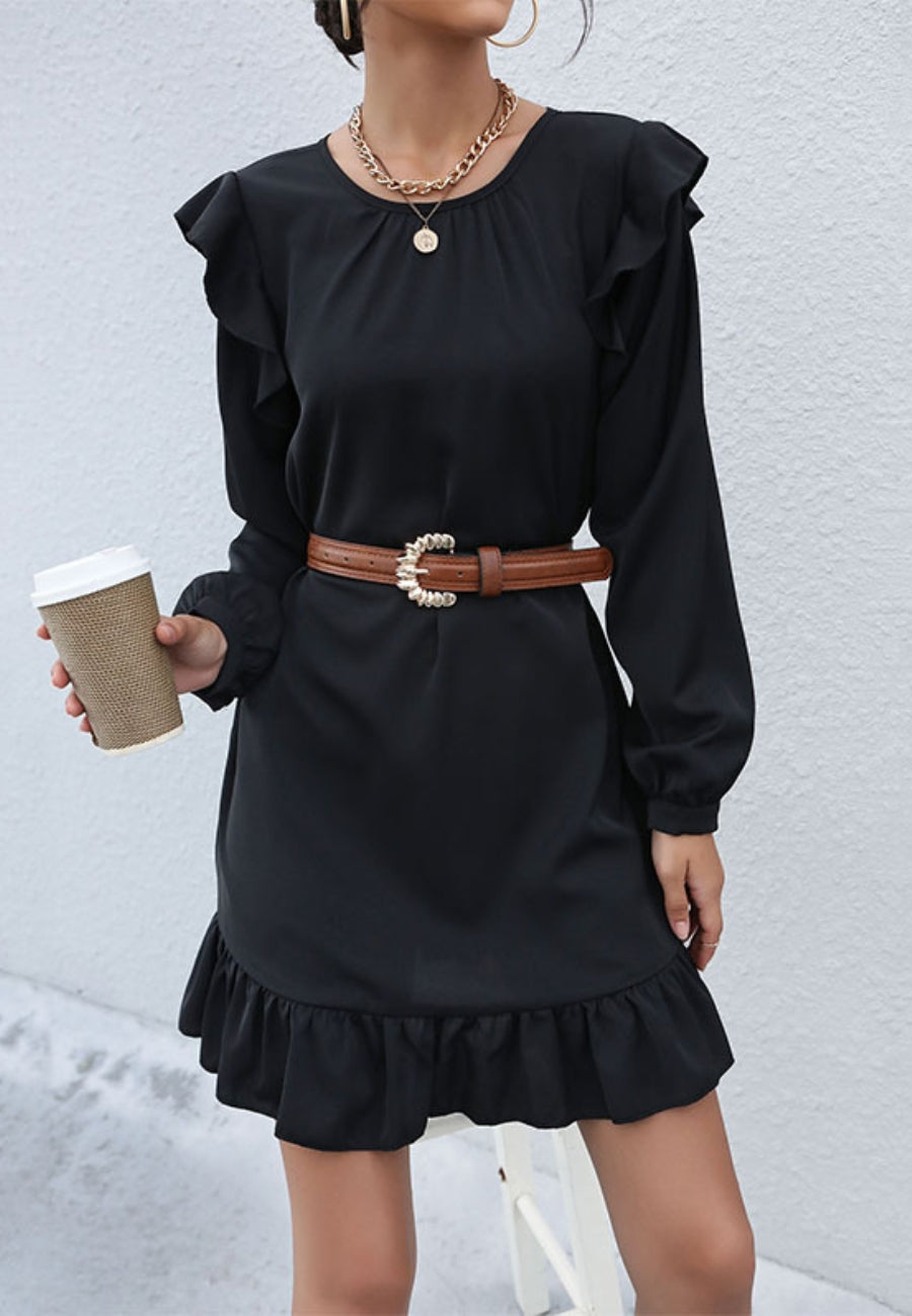 El vestido Anna-Kaci tiene un detalle de volantes en los hombros. Tiene escote redondo, mangas largas, silueta de vestido recto, dobladillo con volantes, detalle de lazo en la espalda y largo por encima de la rodilla. Combínalo con un cinturón y tacones de aguja para lograr un look atrevido.