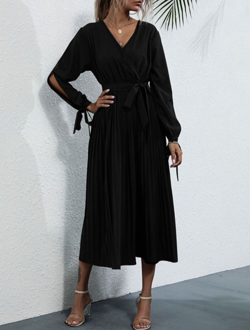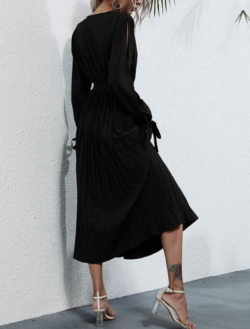 El vestido Anna-Kaci tiene un detalle único de abertura en las mangas. Tiene escote cruzado, mangas largas, falda plisada, detalle de lazo en la cintura y largo hasta la mitad de la pantorrilla. Combínalo con tacones de aguja y un clutch para lograr un look sofisticado.