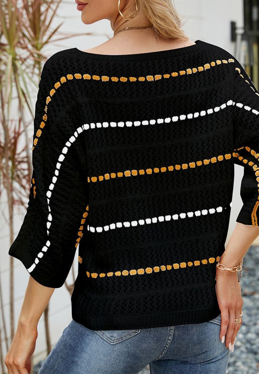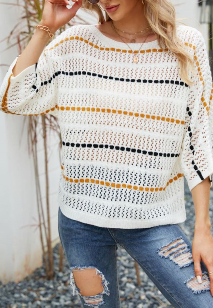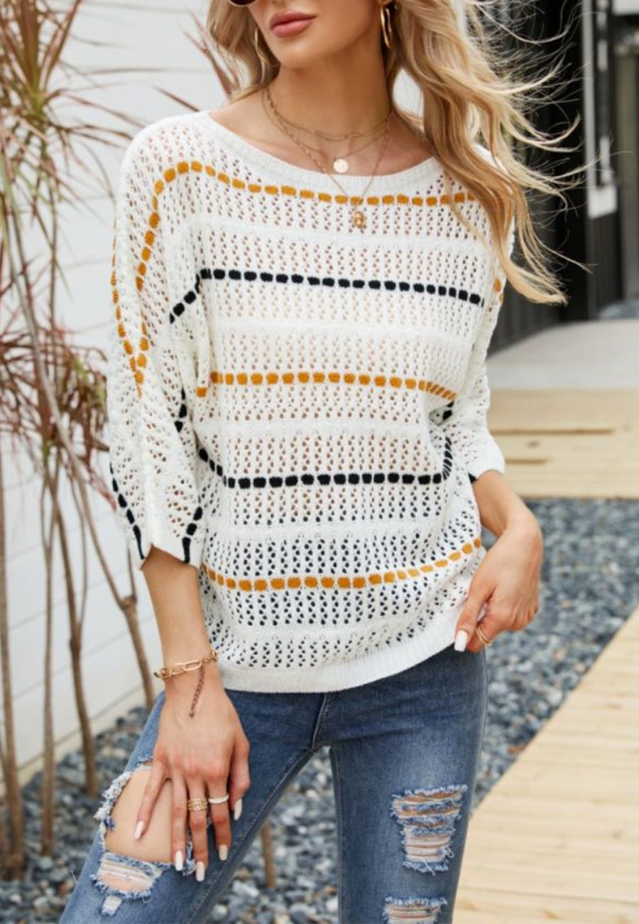 El suéter Anna-Kaci está elaborado con un tejido de punto a rayas. Tiene cuello redondo, mangas tres cuartos y corte regular. Combínalo con jeans desgastados y zapatillas para lograr un look divertido.