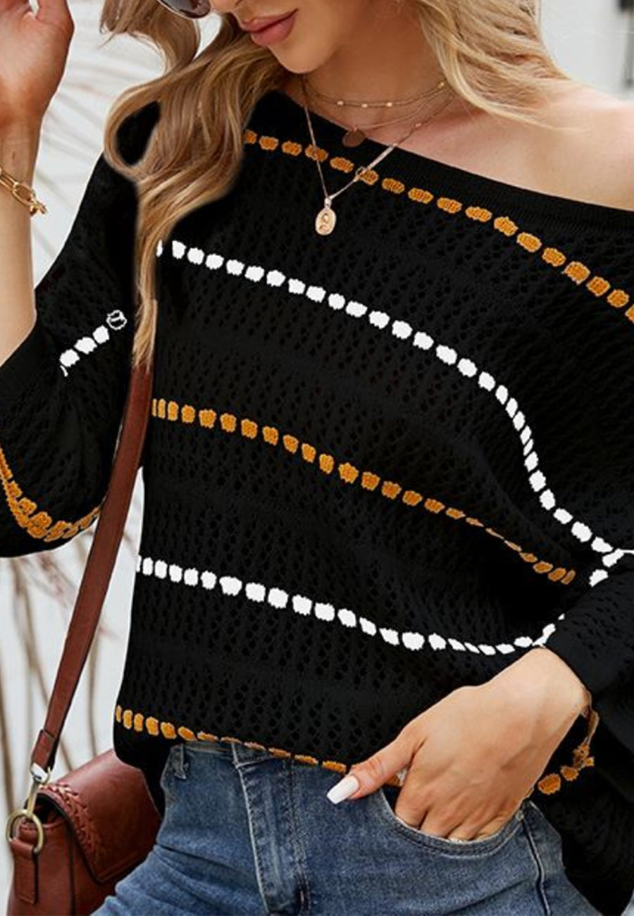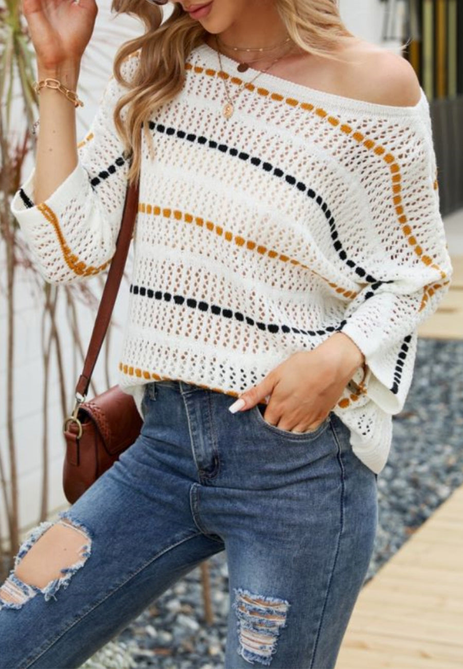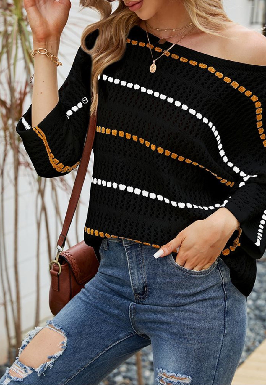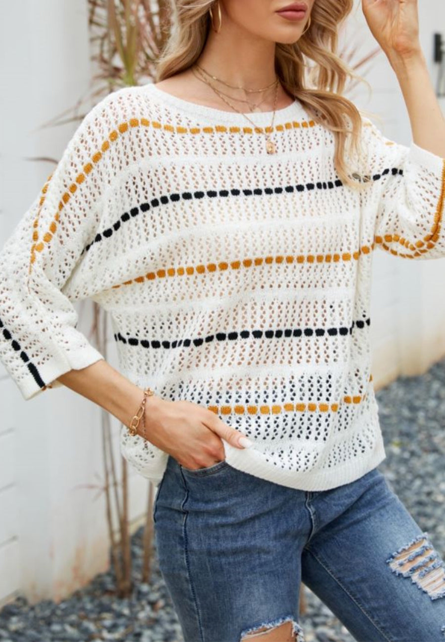 El suéter Anna-Kaci está elaborado con un tejido de punto a rayas. Tiene cuello redondo, mangas tres cuartos y corte regular. Combínalo con jeans desgastados y zapatillas para lograr un look divertido.