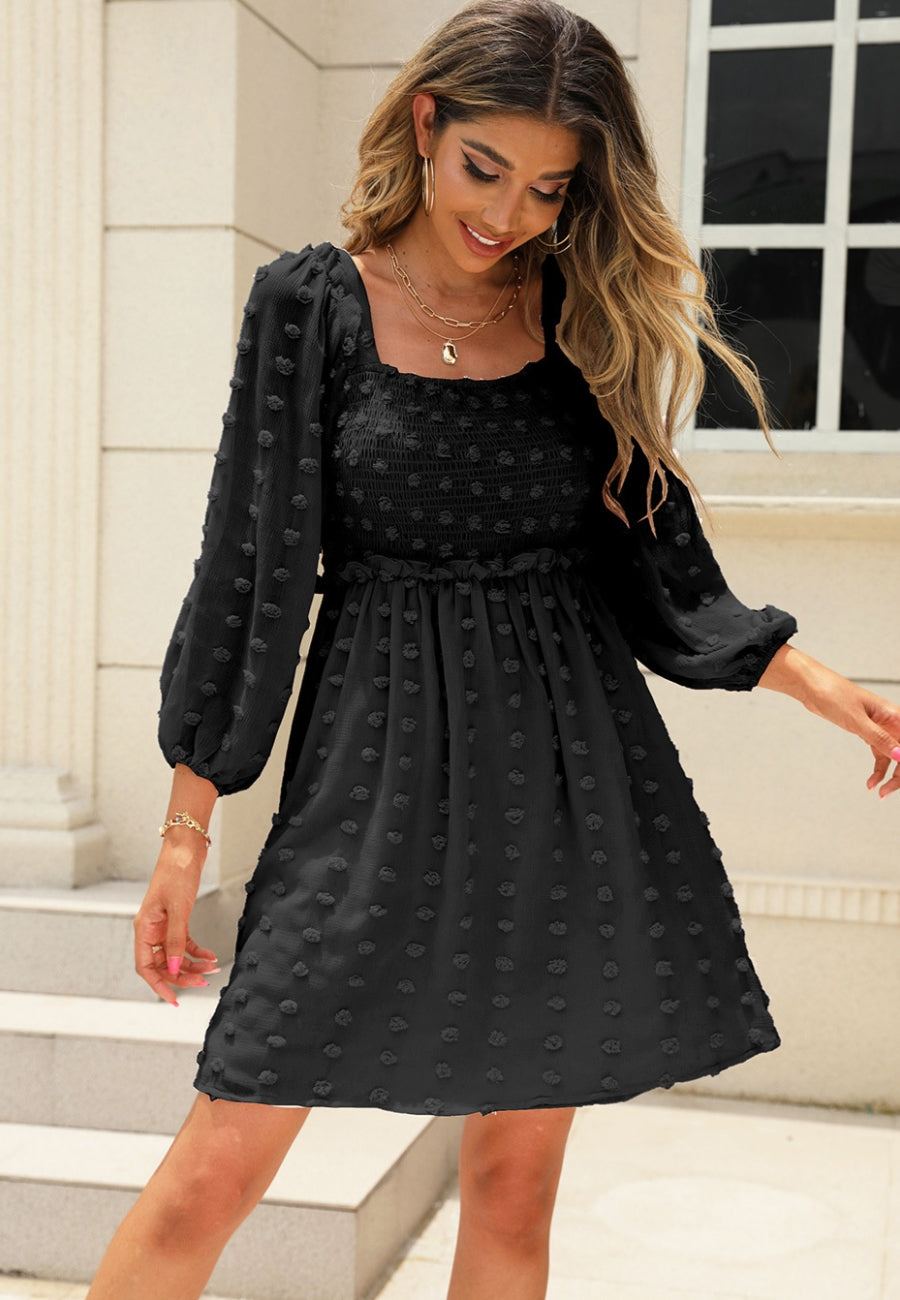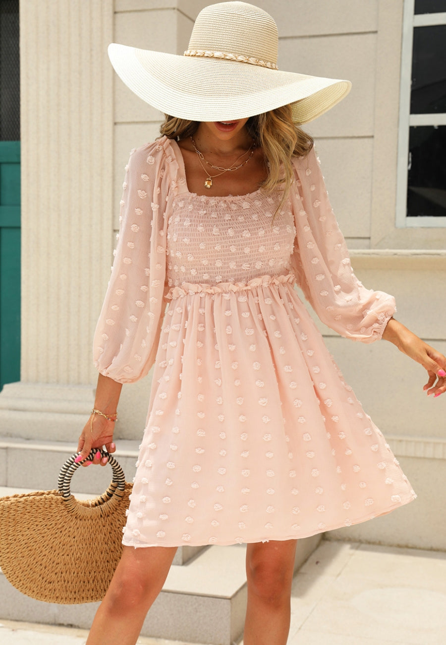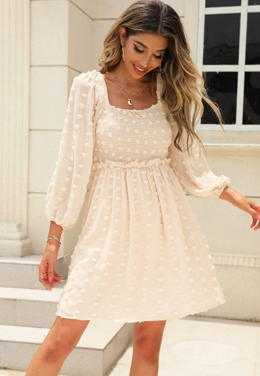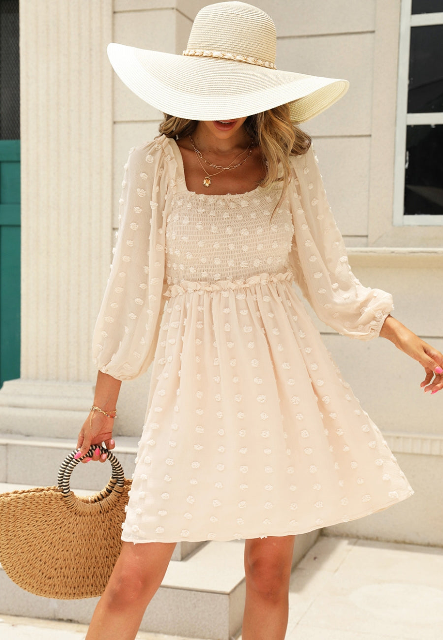 El vestido Anna-Kaci tiene un escote cuadrado clásico. Tiene un diseño de lunares con pinzas, corpiño fruncido, mangas tres cuartos, falda vaporosa y largo por encima de la rodilla. Combínalo con un collar y sandalias para lograr un look lindo.