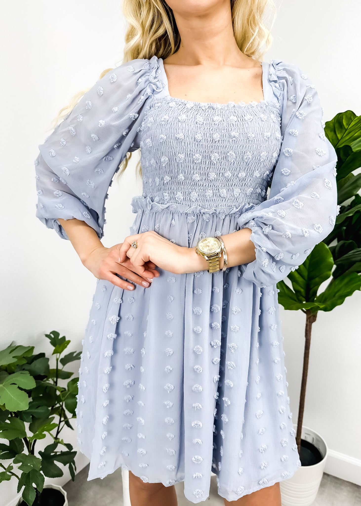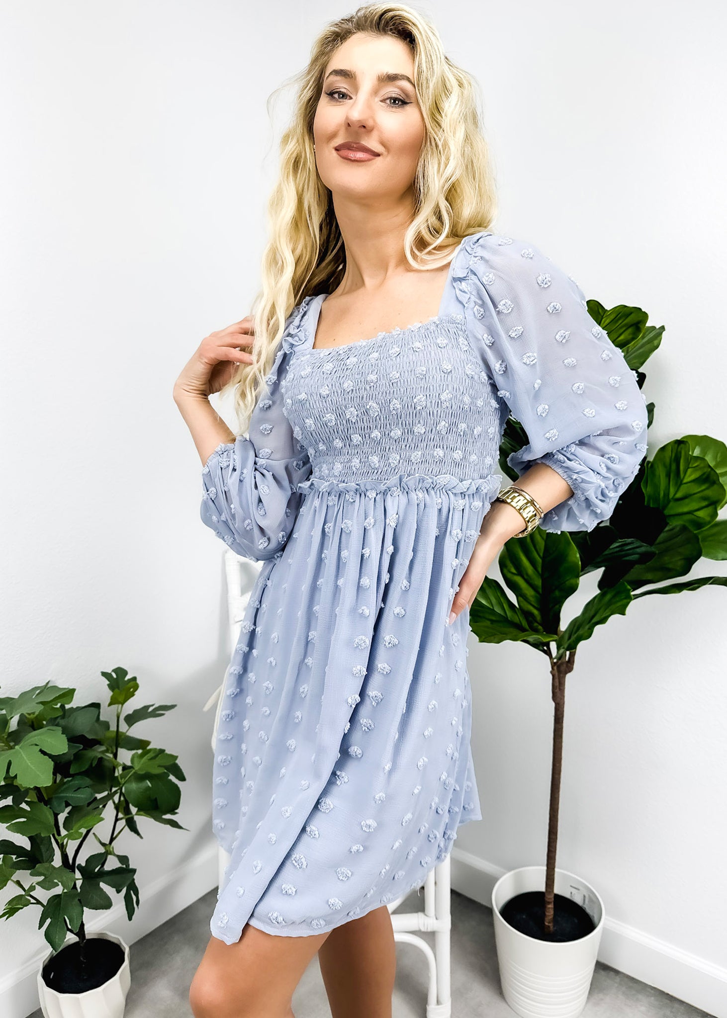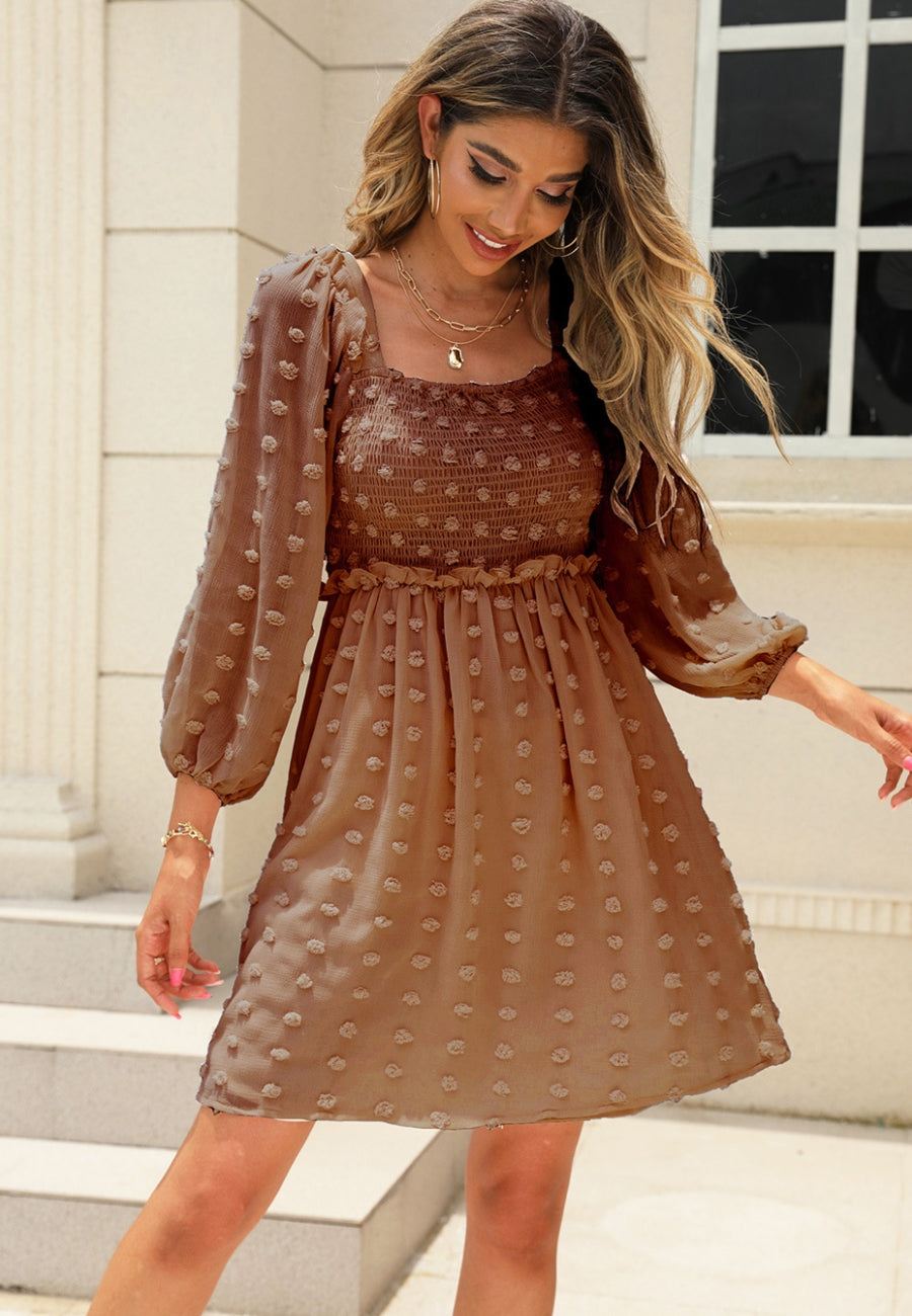 El vestido Anna-Kaci tiene un escote cuadrado clásico. Tiene un diseño de lunares con pinzas, corpiño fruncido, mangas tres cuartos, falda vaporosa y largo por encima de la rodilla. Combínalo con un collar y sandalias para lograr un look lindo.