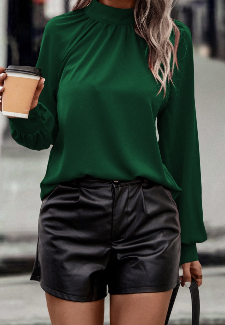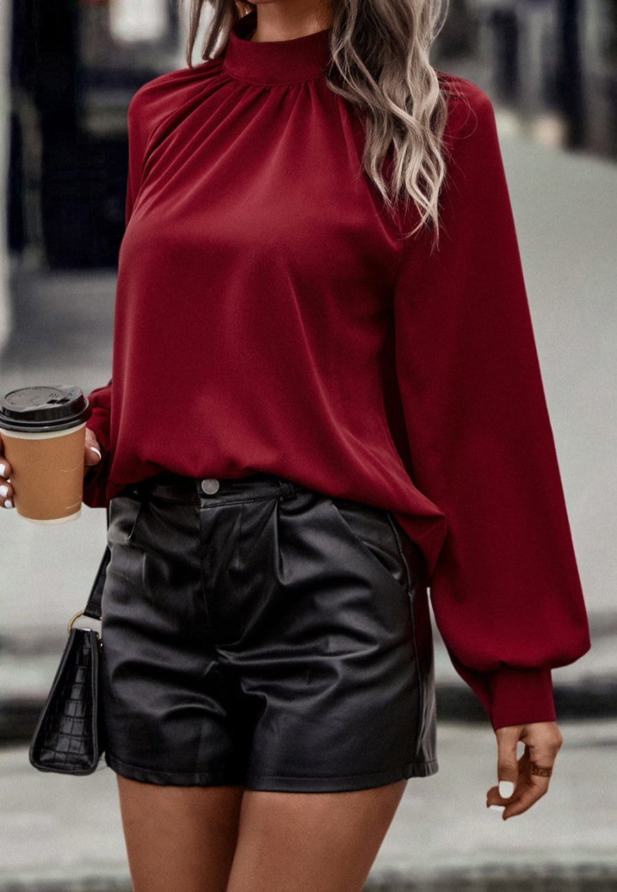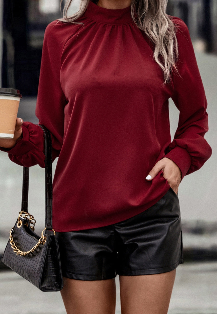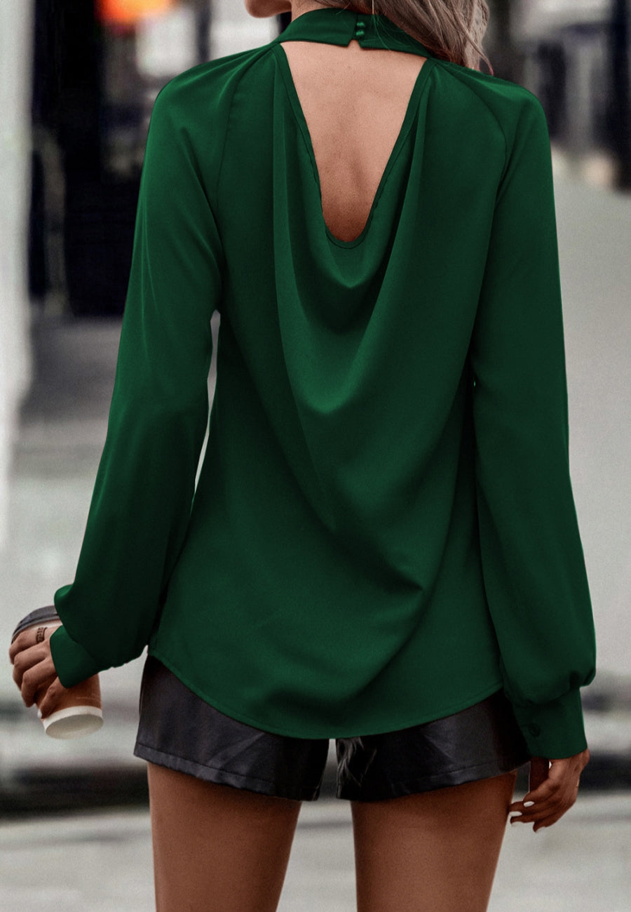 La blusa Anna-Kaci tiene un elegante diseño de espalda desbocada. Tiene un color liso, cuello alto, mangas largas y un corte holgado. Combínala con una falda de cuero y botas hasta la rodilla para lograr un look atrevido.