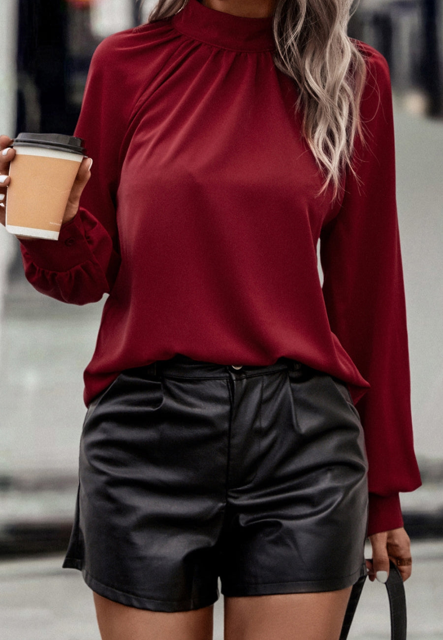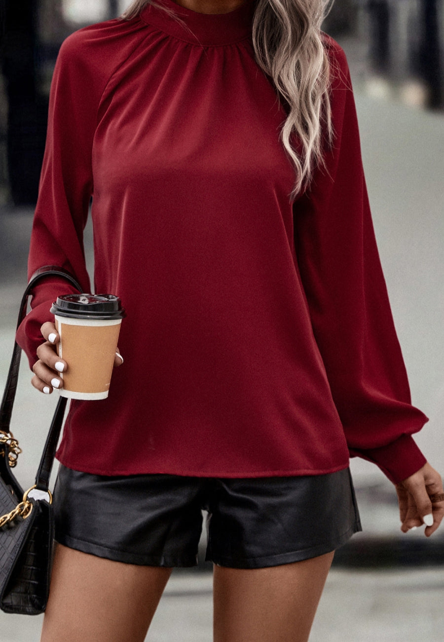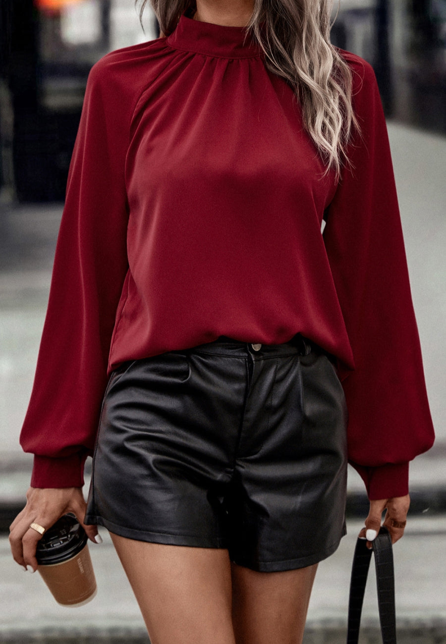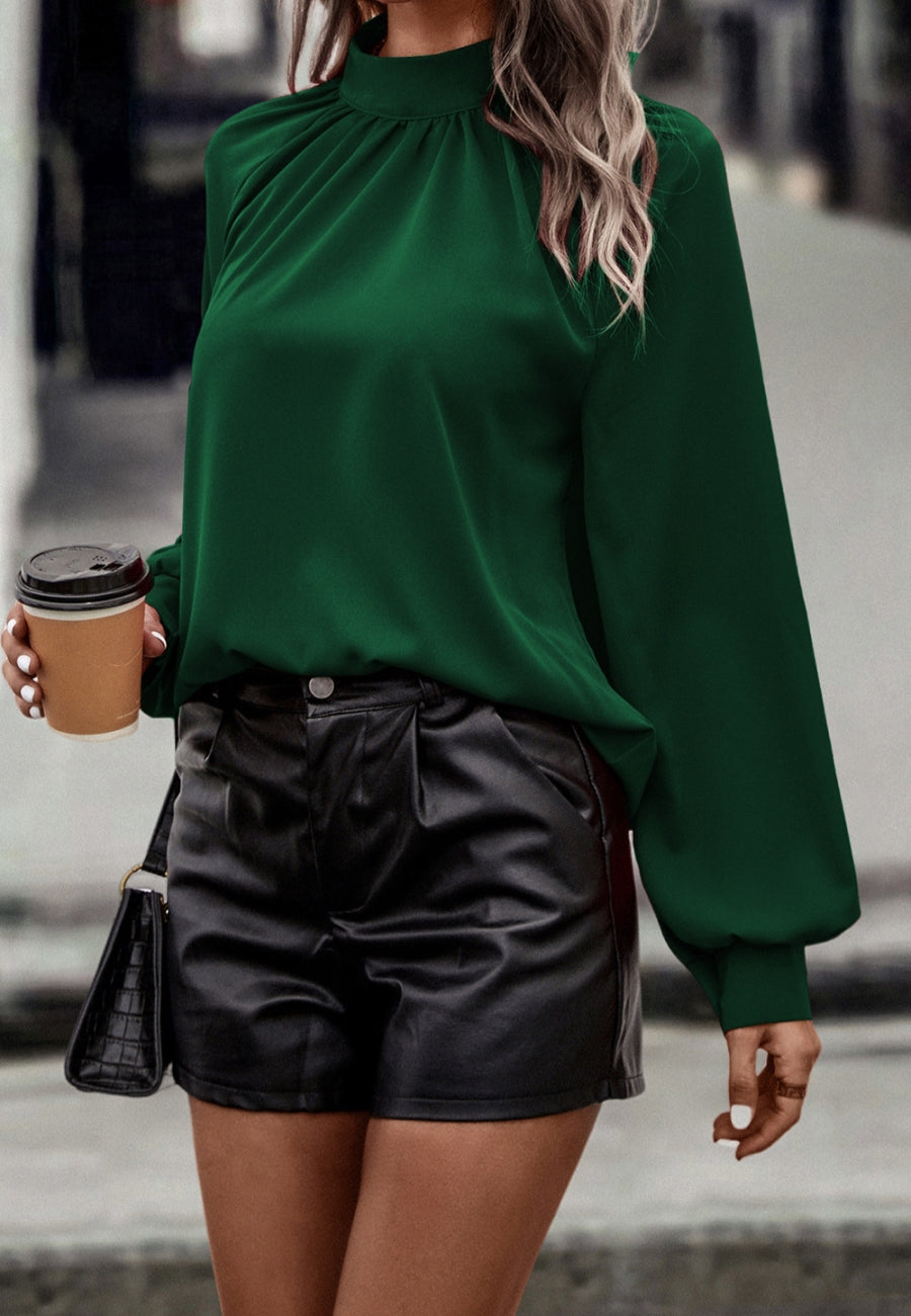 La blusa Anna-Kaci tiene un elegante diseño de espalda desbocada. Tiene un color liso, cuello alto, mangas largas y un corte holgado. Combínala con una falda de cuero y botas hasta la rodilla para lograr un look atrevido.