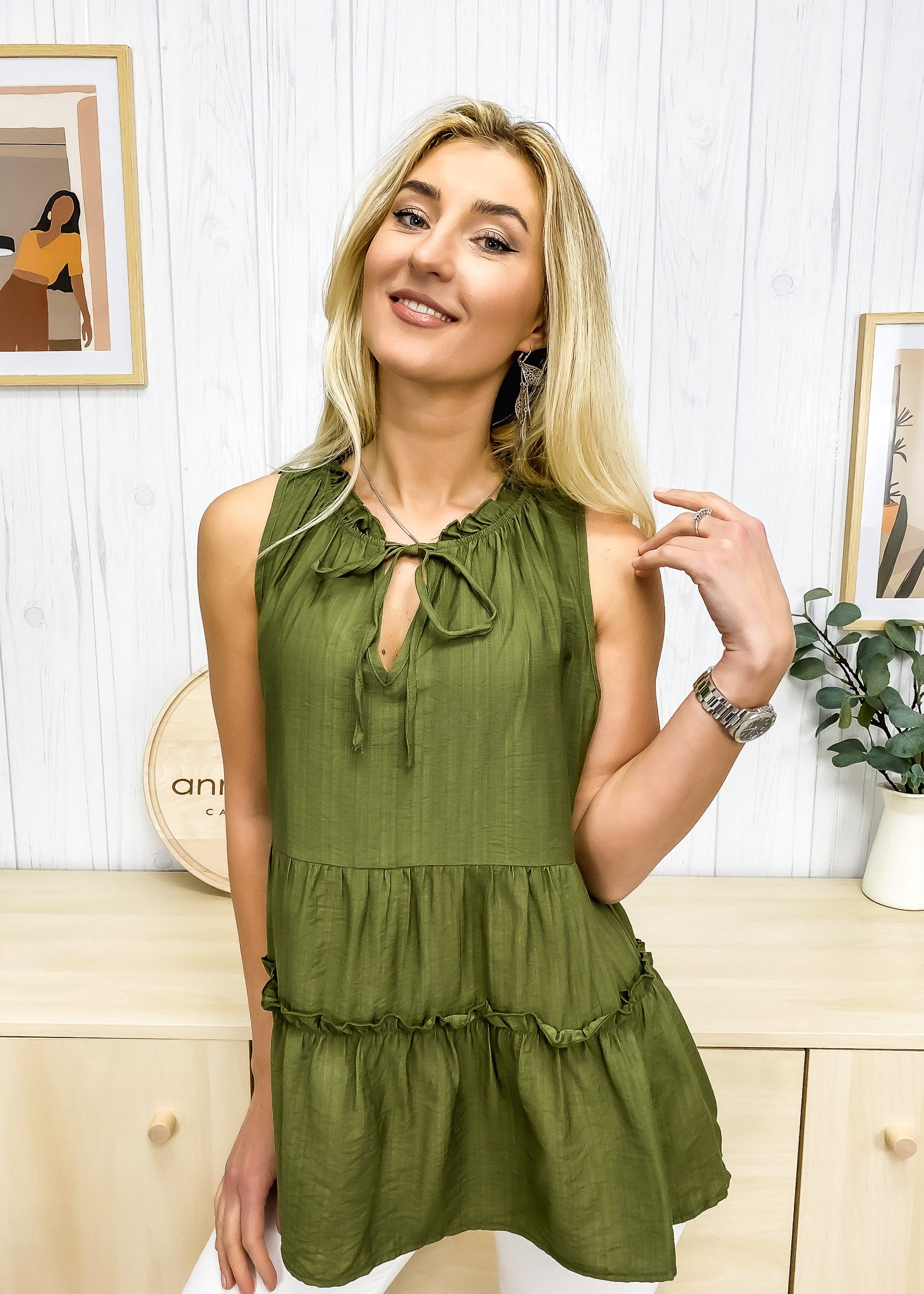 La blusa Anna-Kaci tiene detalles en un color liso clásico. Tiene un escote en V anudado, sin mangas, diseño escalonado y un ajuste fluido. Combínala con pantalones cortos blancos y sandalias para lograr un estilo lindo.