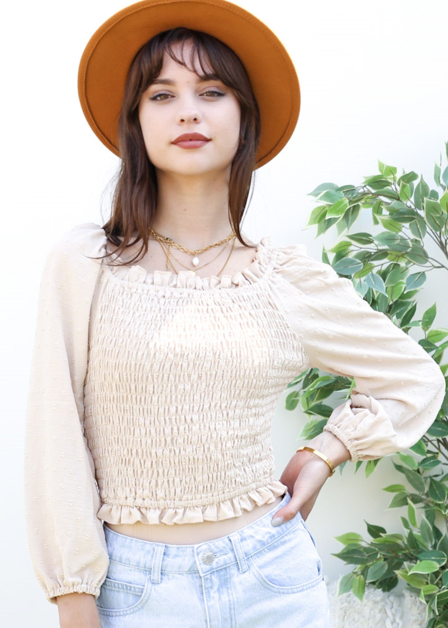 La blusa Anna-Kaci tiene un favorecedor escote fruncido. Tiene un color liso, escote cuadrado con volados, mangas largas y silueta ajustada. Combínala con jeans con dobladillo y tacones anchos para lograr un look deslumbrante.