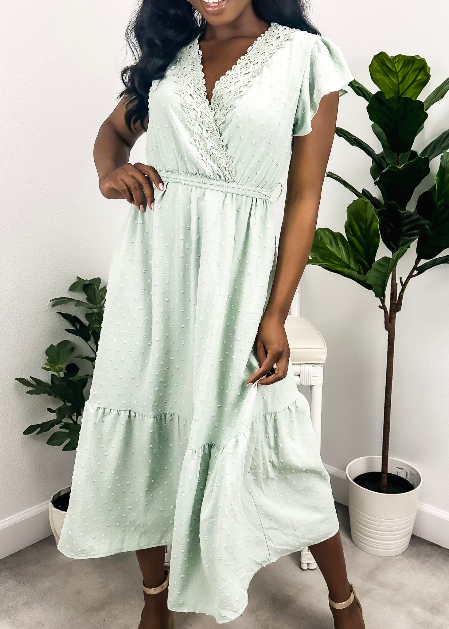 El vestido Anna-Kaci tiene hermosas mangas con vuelo. Tiene escote cruzado, tela de lunares, detalle de lazo en la cintura, silueta en forma de A, dobladillo con volados y largo hasta la mitad de la pantorrilla. Combínalo con collares en capas y sandalias para lograr un look deslumbrante.
