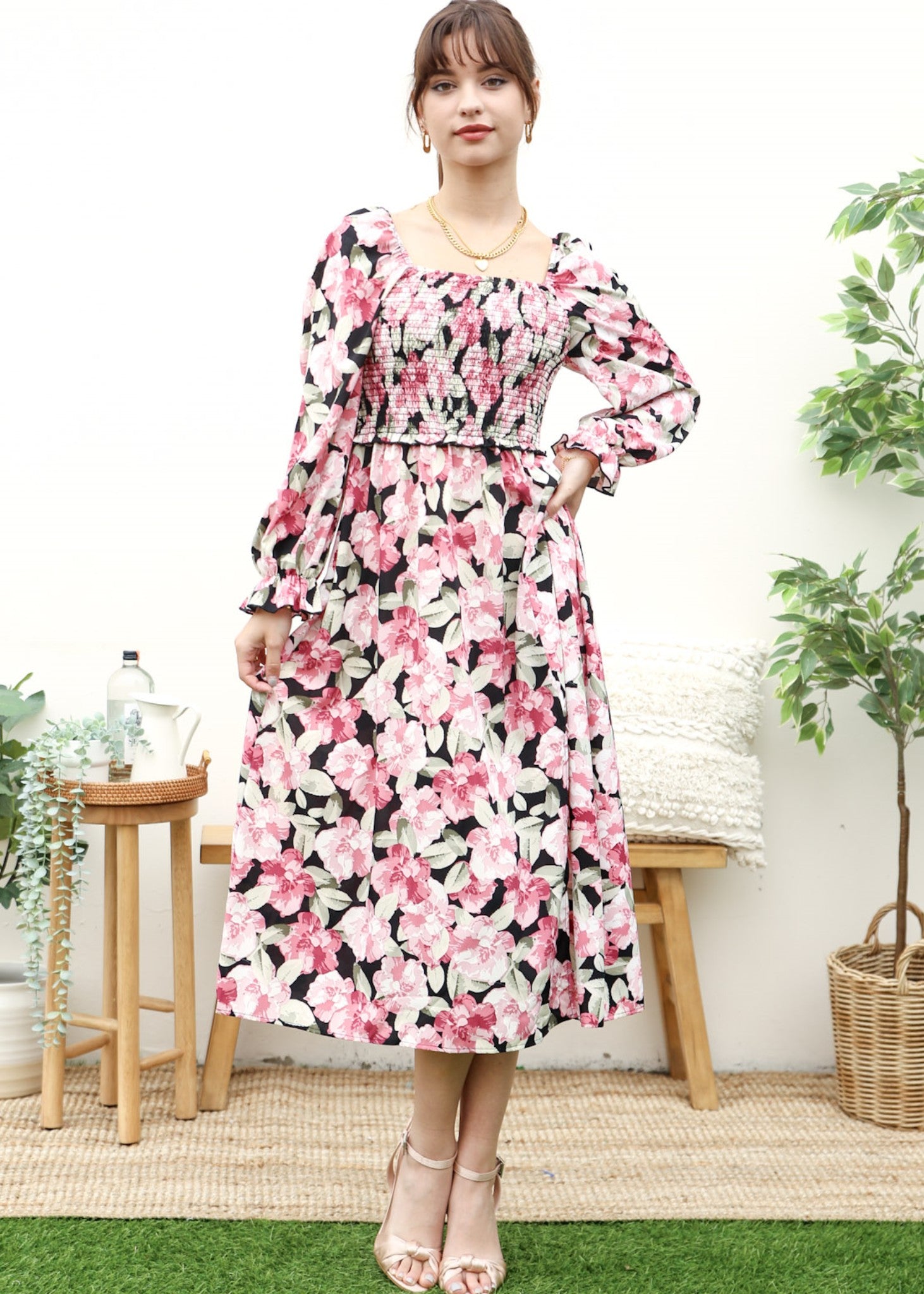 El vestido Anna-Kaci tiene un bonito detalle de volante en la cintura. Tiene un estampado floral, un corpiño fruncido, escote cuadrado, mangas largas, falda vaporosa, abertura lateral y largo hasta la mitad de la pantorrilla. Combínalo con un bolso de mano y botines para lograr un look fabuloso.