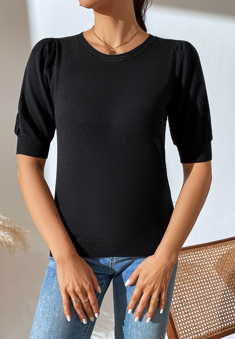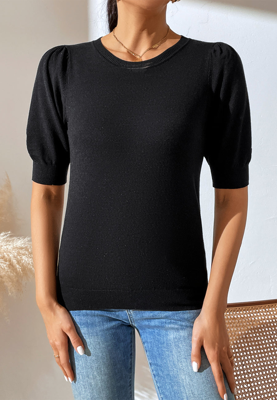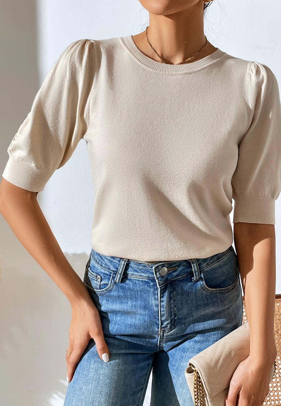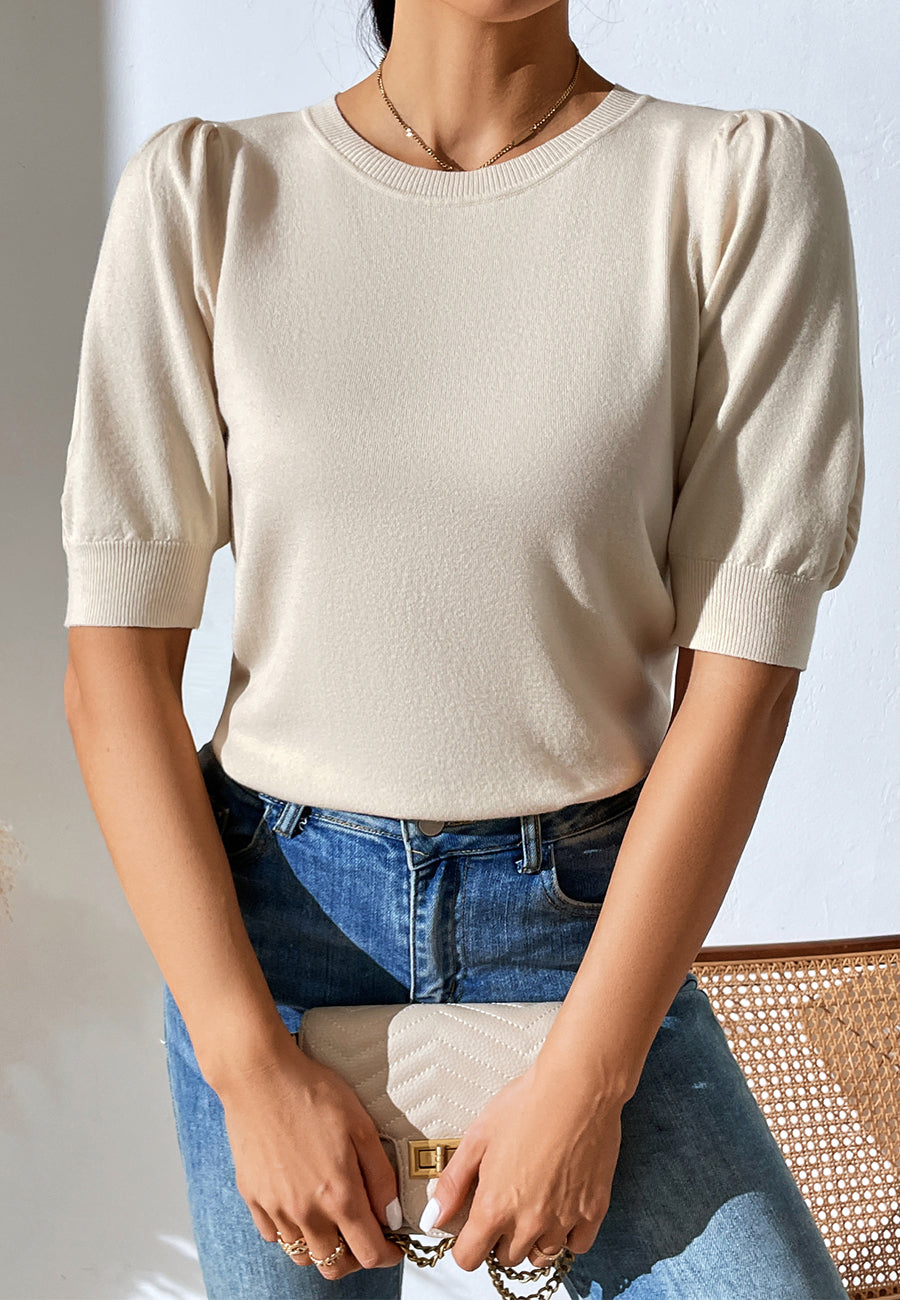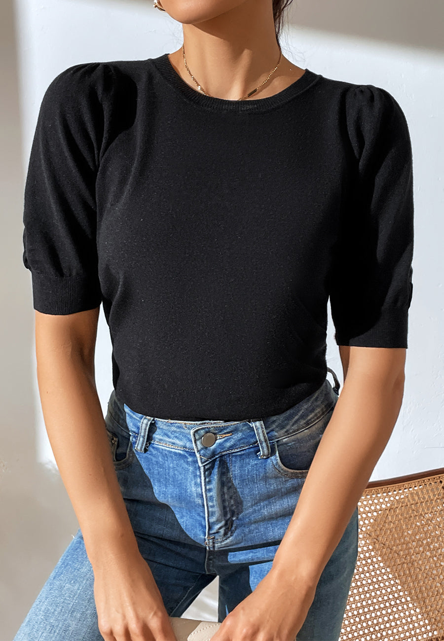 El suéter Anna-Kaci tiene detalles en un color liso clásico. Tiene cuello redondo, mangas abullonadas hasta los codos y un corte regular. Combínalo con tus jeans y sandalias favoritos para lograr un estilo informal.