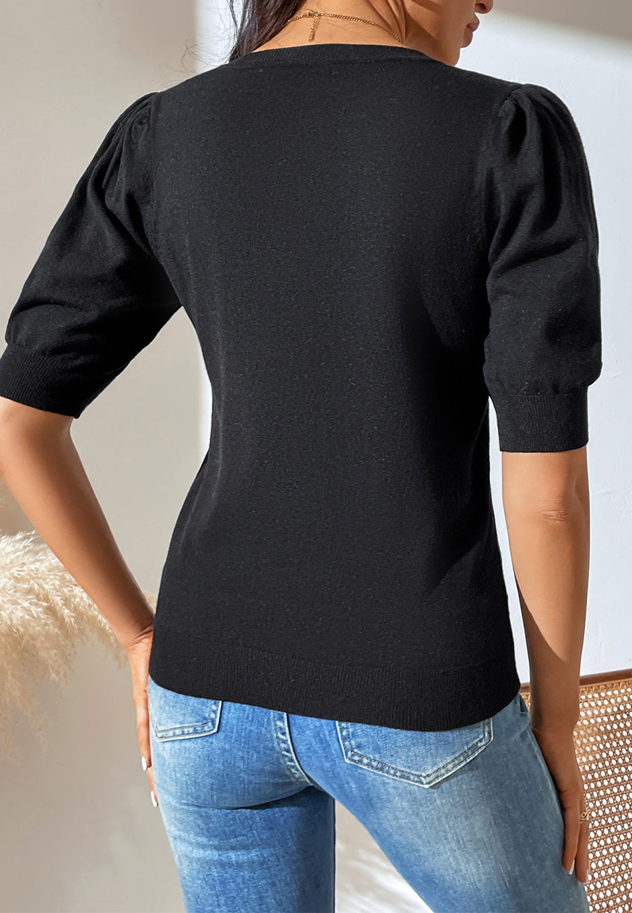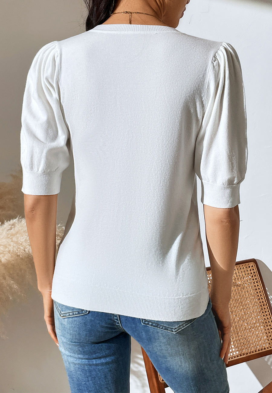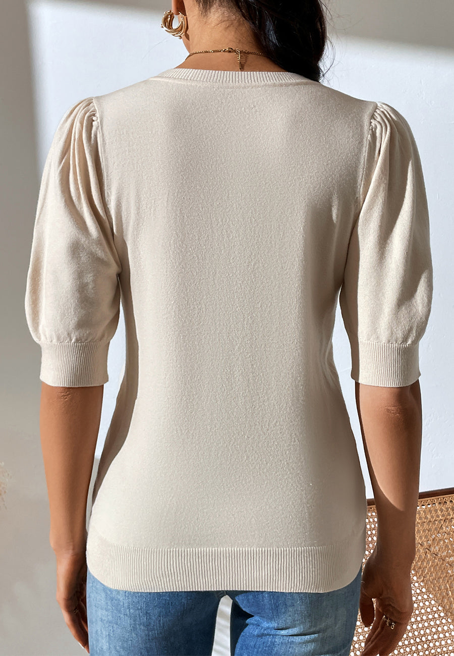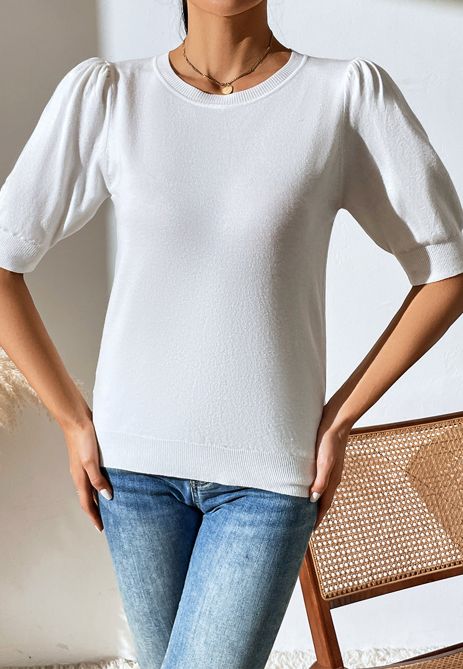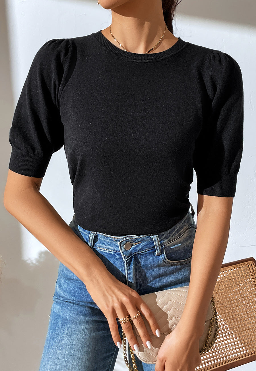 El suéter Anna-Kaci tiene detalles en un color liso clásico. Tiene cuello redondo, mangas abullonadas hasta los codos y un corte regular. Combínalo con tus jeans y sandalias favoritos para lograr un estilo informal.