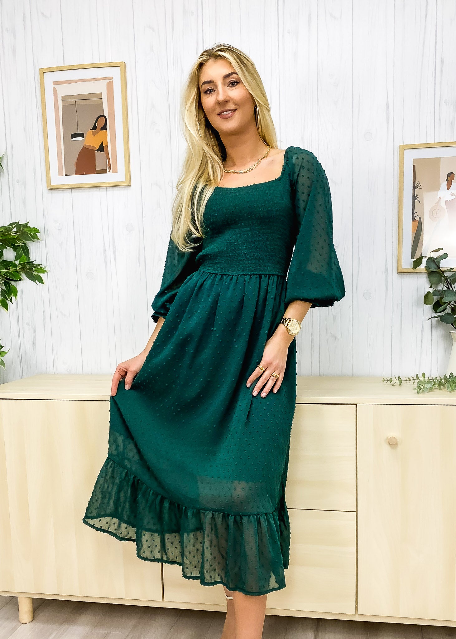 El vestido Anna-Kaci tiene un escote cuadrado elegante. Está confeccionado con un tejido de lunares suizos, un corpiño fruncido, mangas largas, una falda vaporosa, un dobladillo con volados y un largo hasta la mitad de la pantorrilla. Combínalo con tacones de aguja y un clutch para lograr un look elegante.