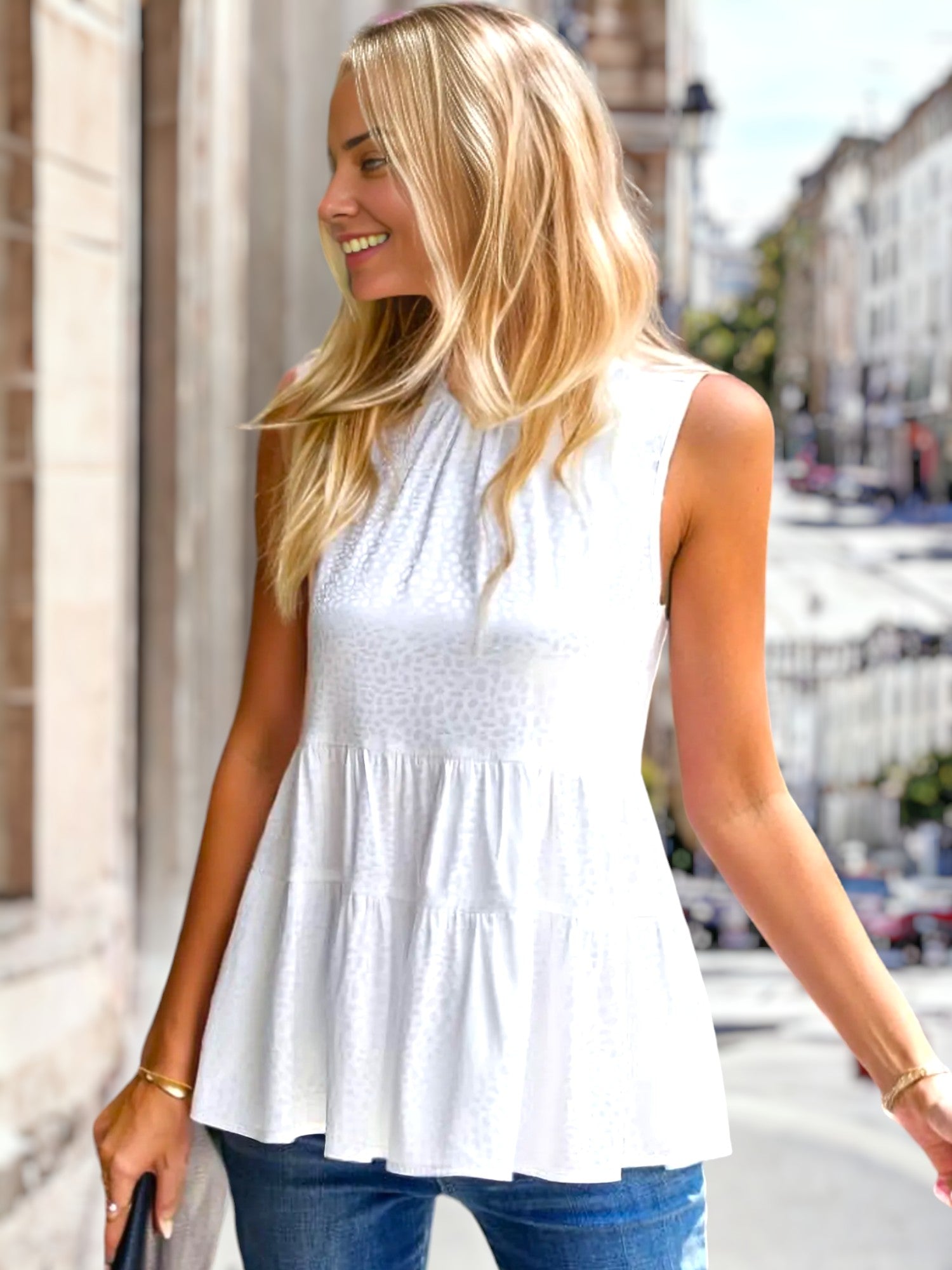 La blusa Anna-Kaci tiene un cuello con volados muy femenino. Tiene estampado de guepardo, sin mangas, diseño de peplum escalonado y un corte holgado. Combínala con jeans con dobladillo y tacones para lograr un look elegante.