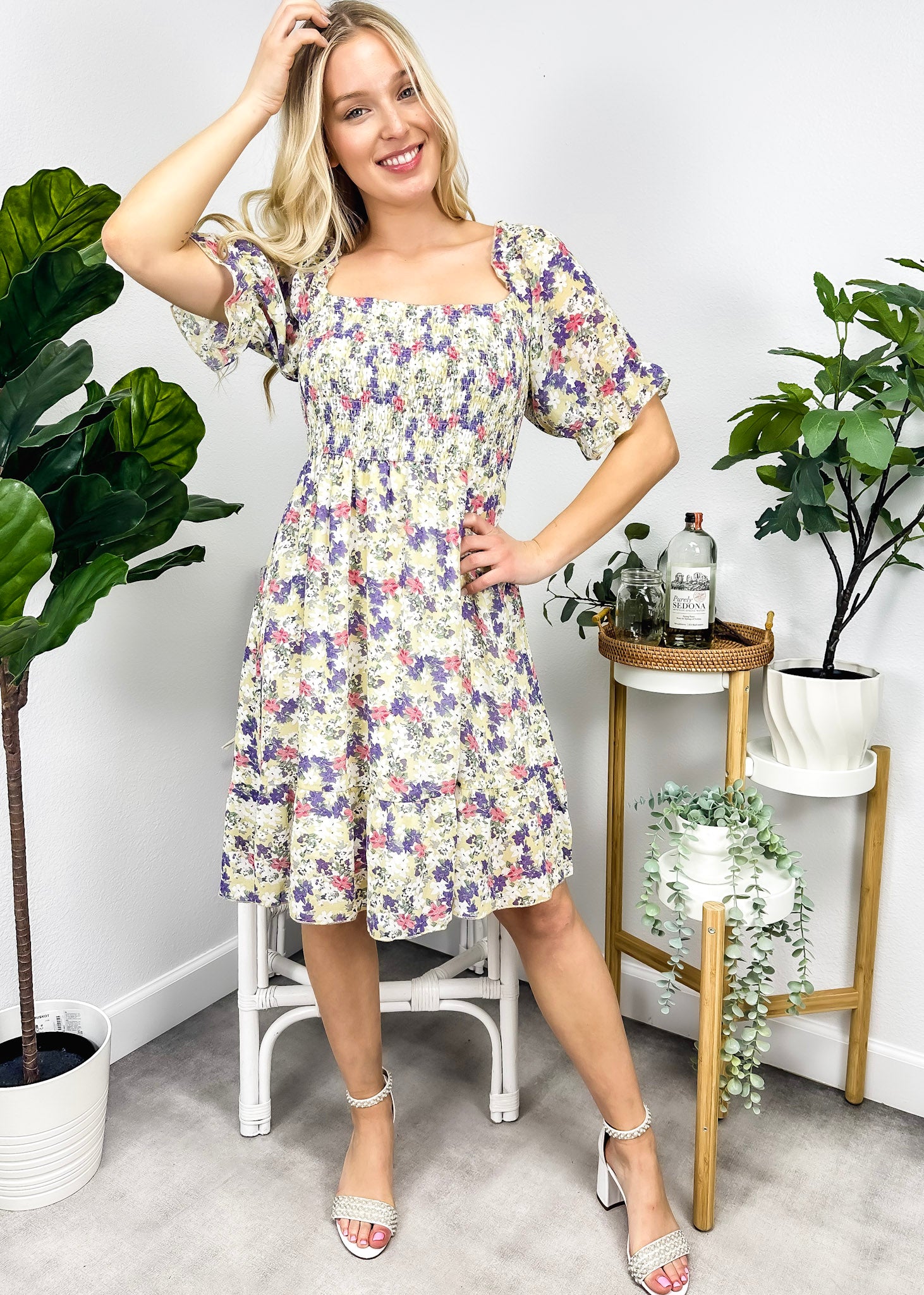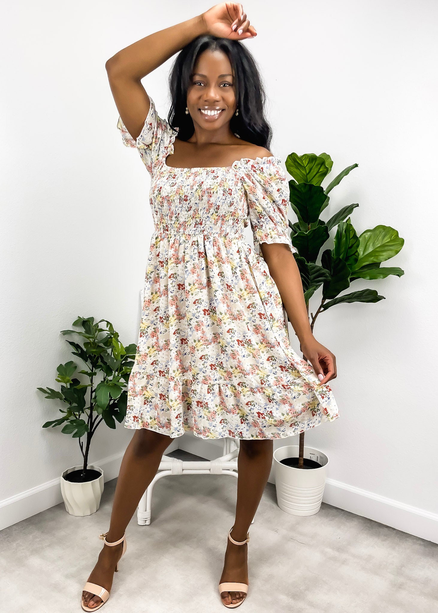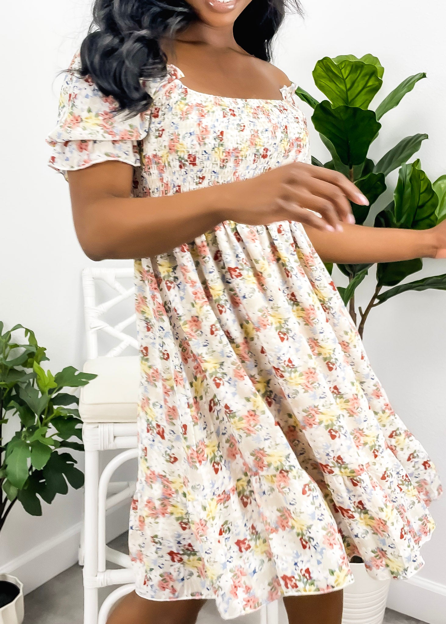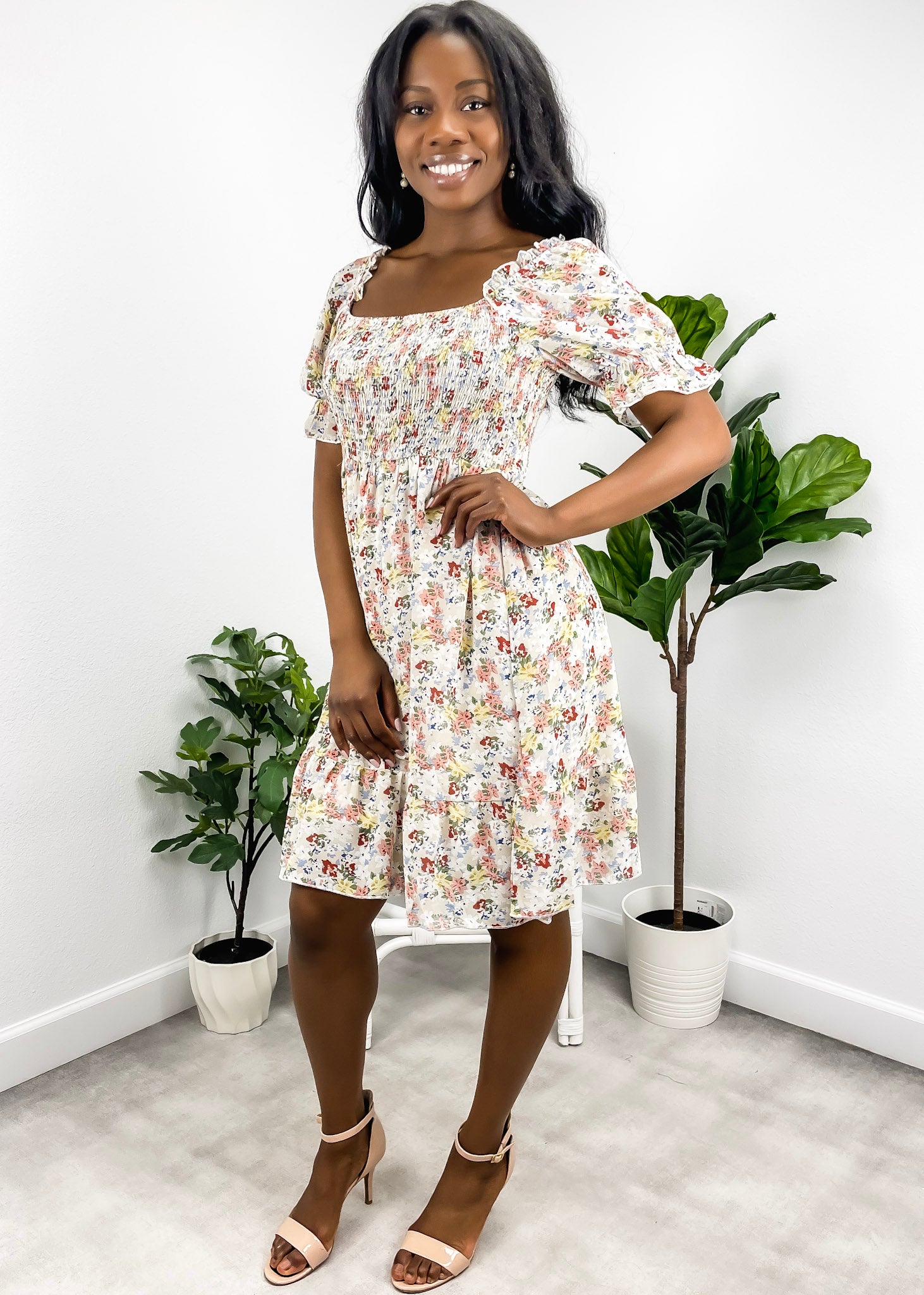 El vestido Anna-Kaci tiene hermosas mangas abullonadas. Tiene escote cuadrado, estampado floral, corpiño fruncido, falda vaporosa, dobladillo con volados y largo por encima de la rodilla. Combínalo con sandalias de tiras y un collar para lograr un look encantador.