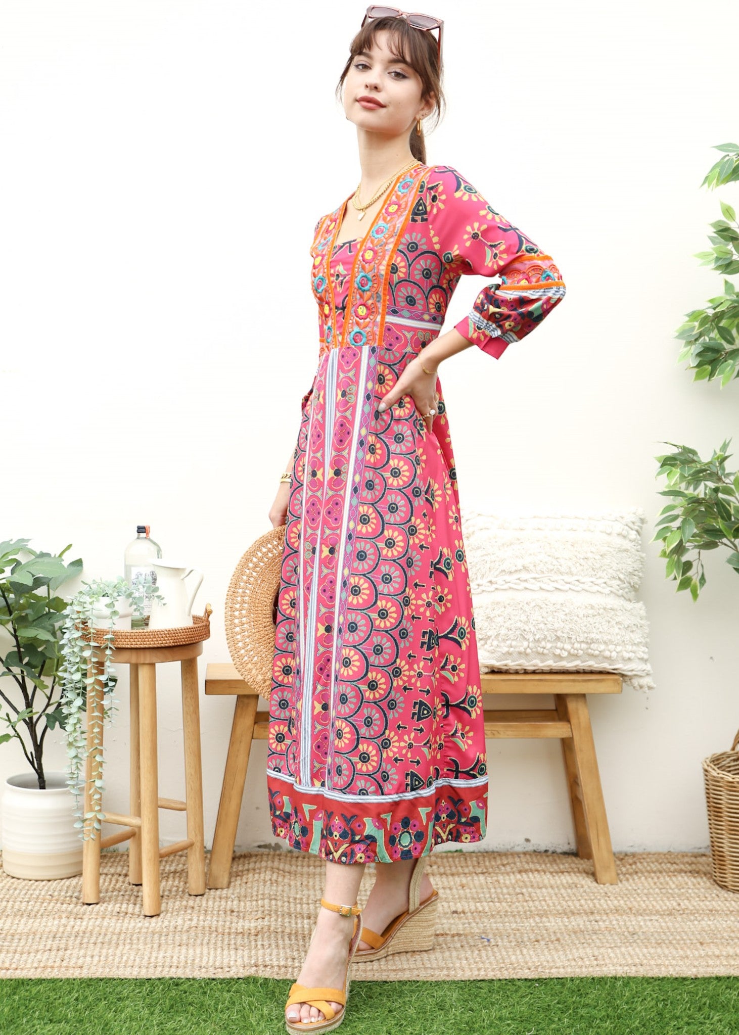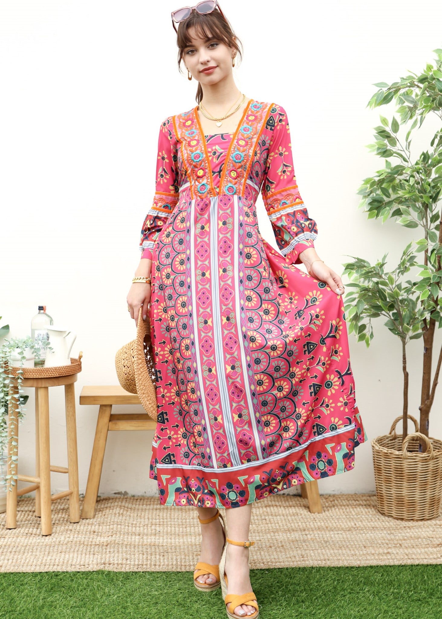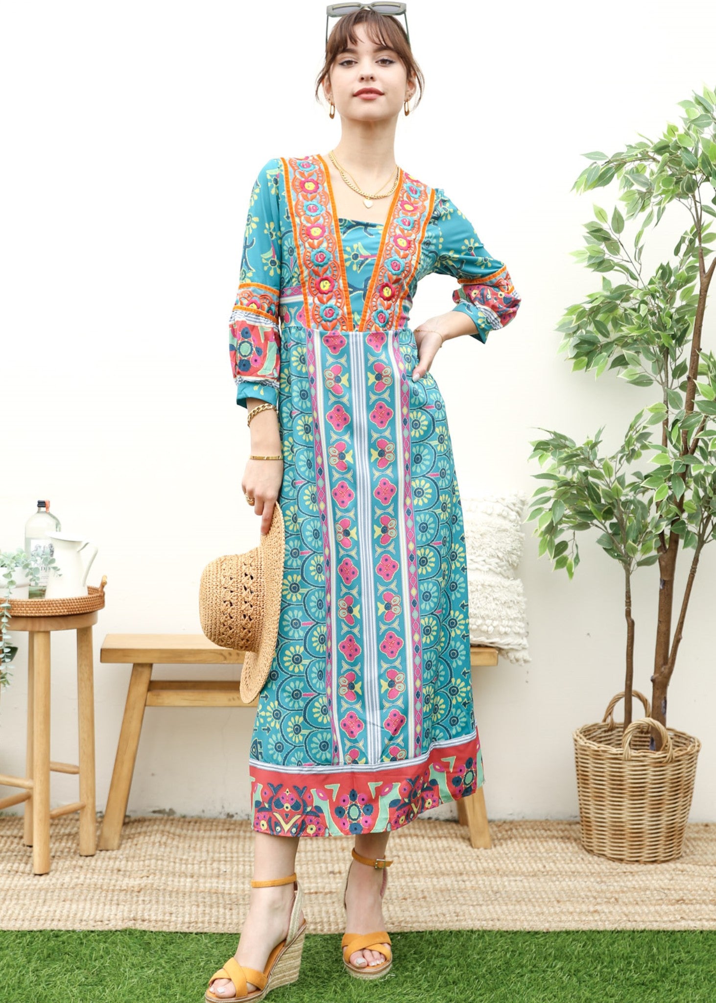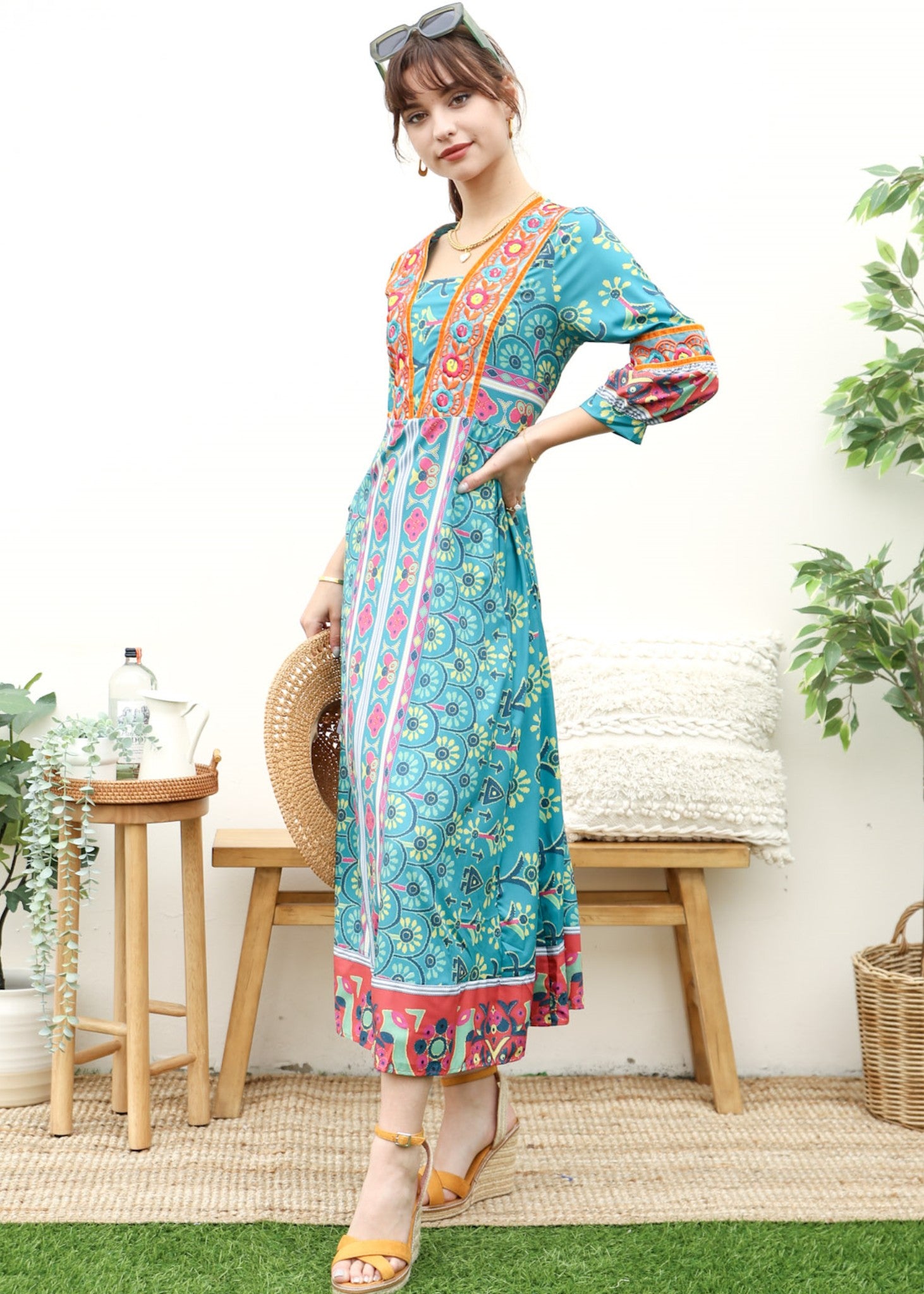 El vestido Anna-Kaci tiene un escote recto clásico, un estampado geométrico, mangas largas, una falda vaporosa y largo hasta el tobillo. Combínalo con aretes llamativos y sandalias para lograr un look fantástico.
