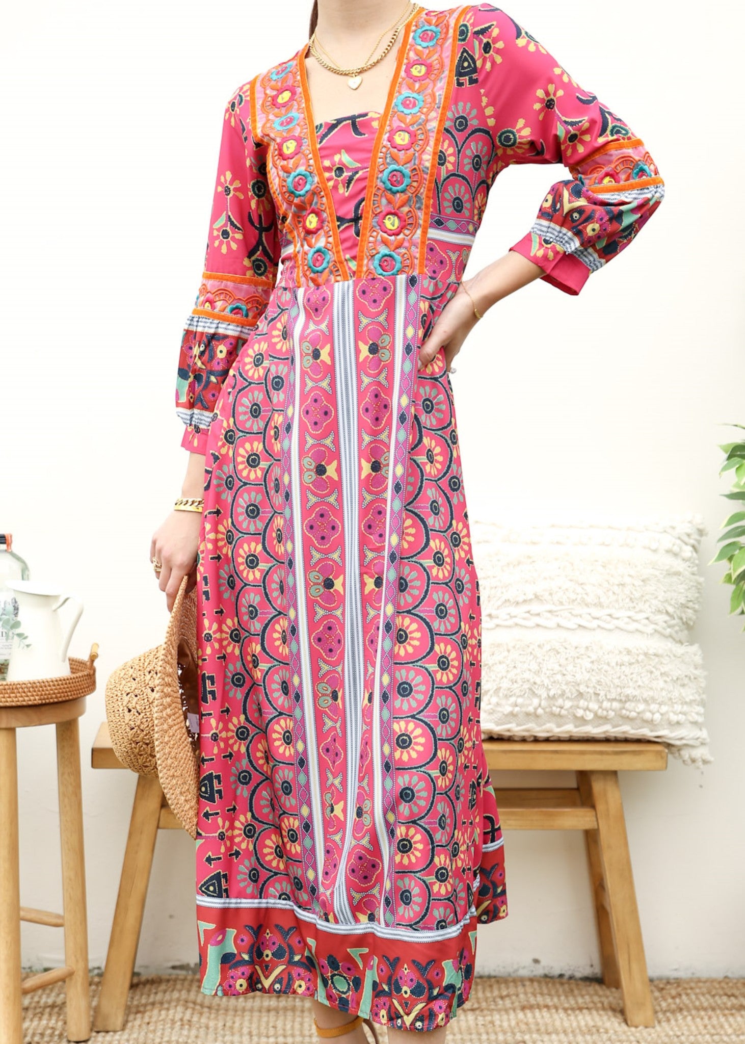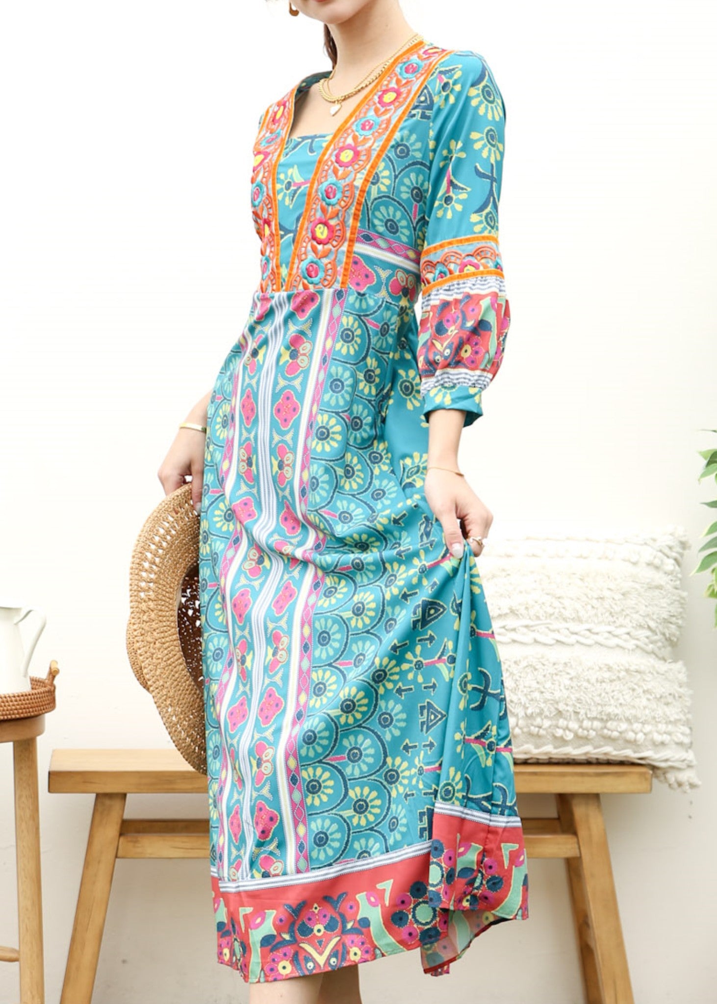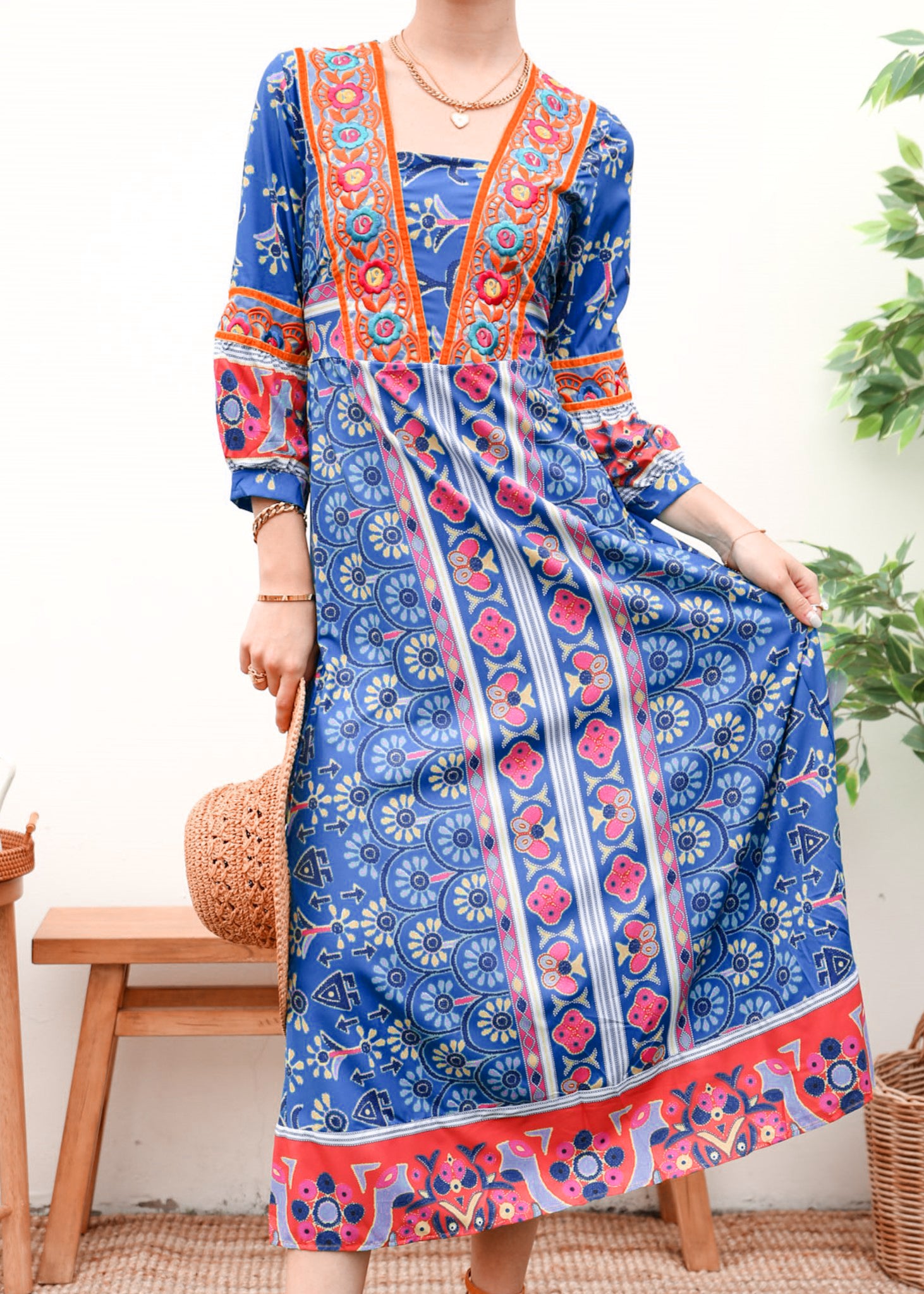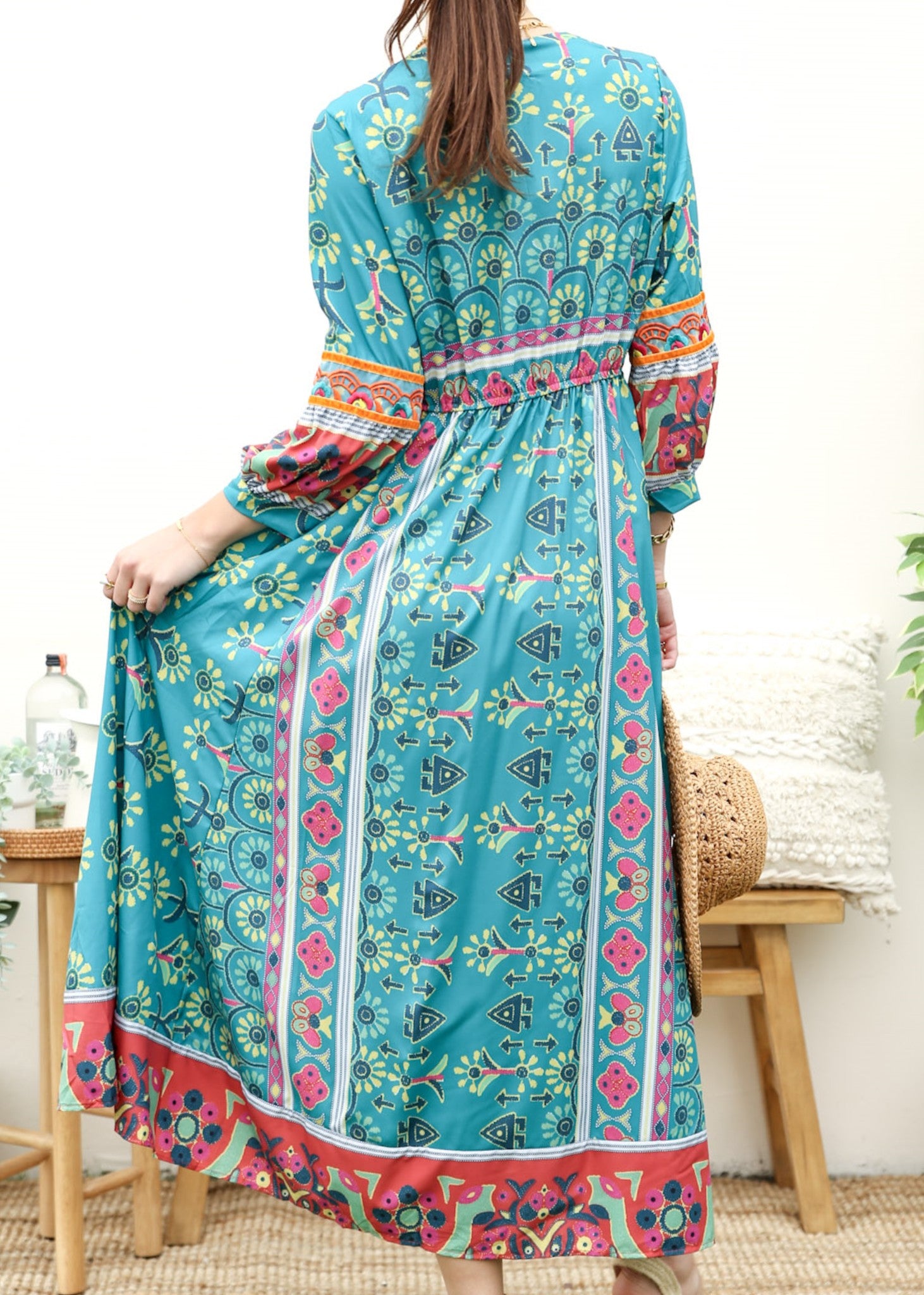 El vestido Anna-Kaci tiene un escote recto clásico, un estampado geométrico, mangas largas, una falda vaporosa y largo hasta el tobillo. Combínalo con aretes llamativos y sandalias para lograr un look fantástico.