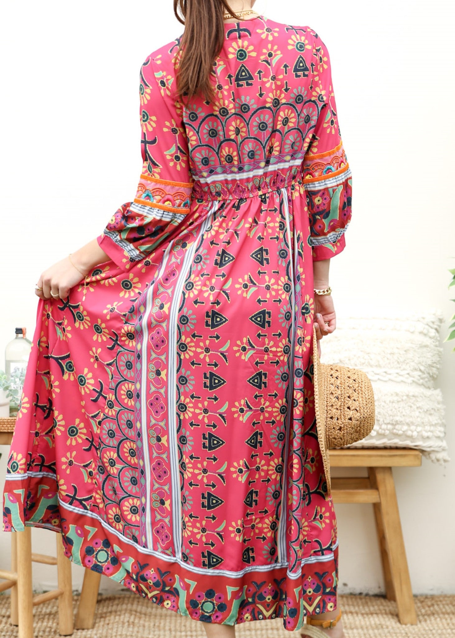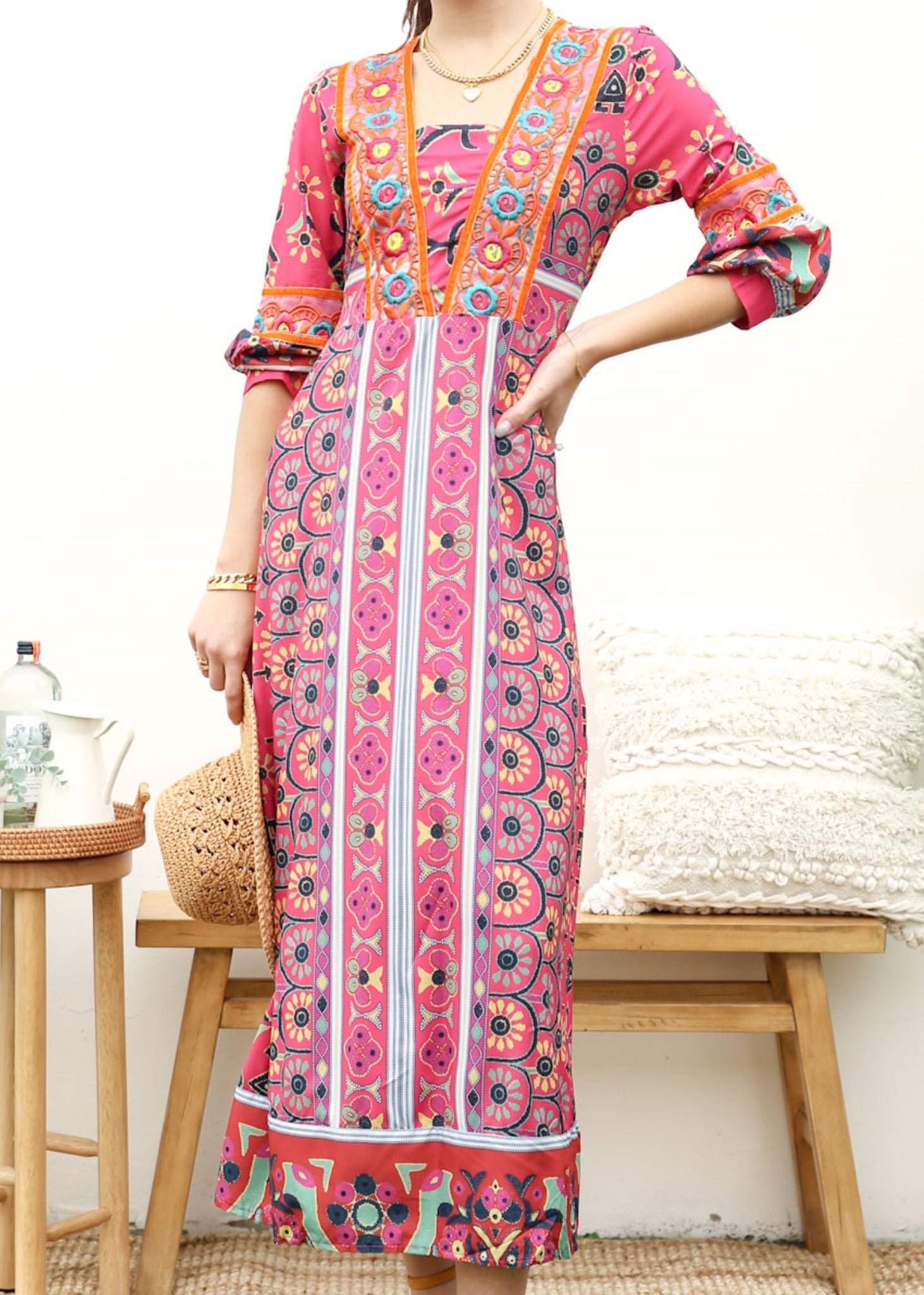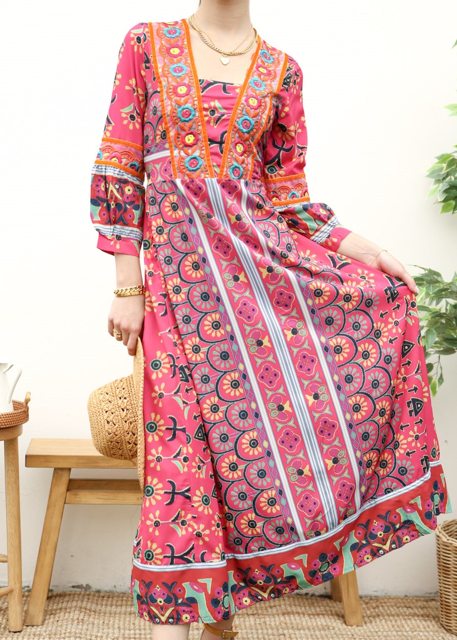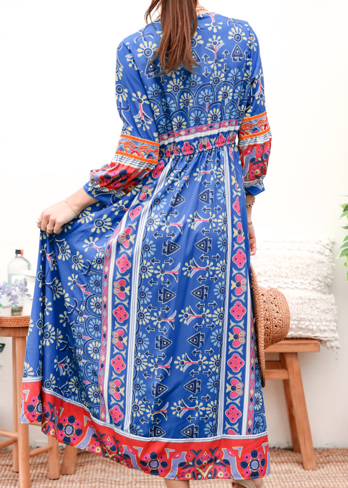 El vestido Anna-Kaci tiene un escote recto clásico, un estampado geométrico, mangas largas, una falda vaporosa y largo hasta el tobillo. Combínalo con aretes llamativos y sandalias para lograr un look fantástico.