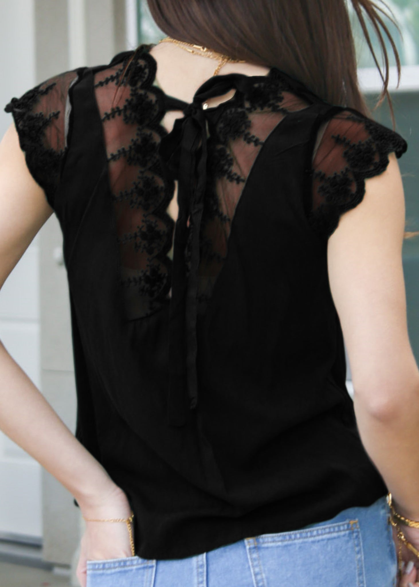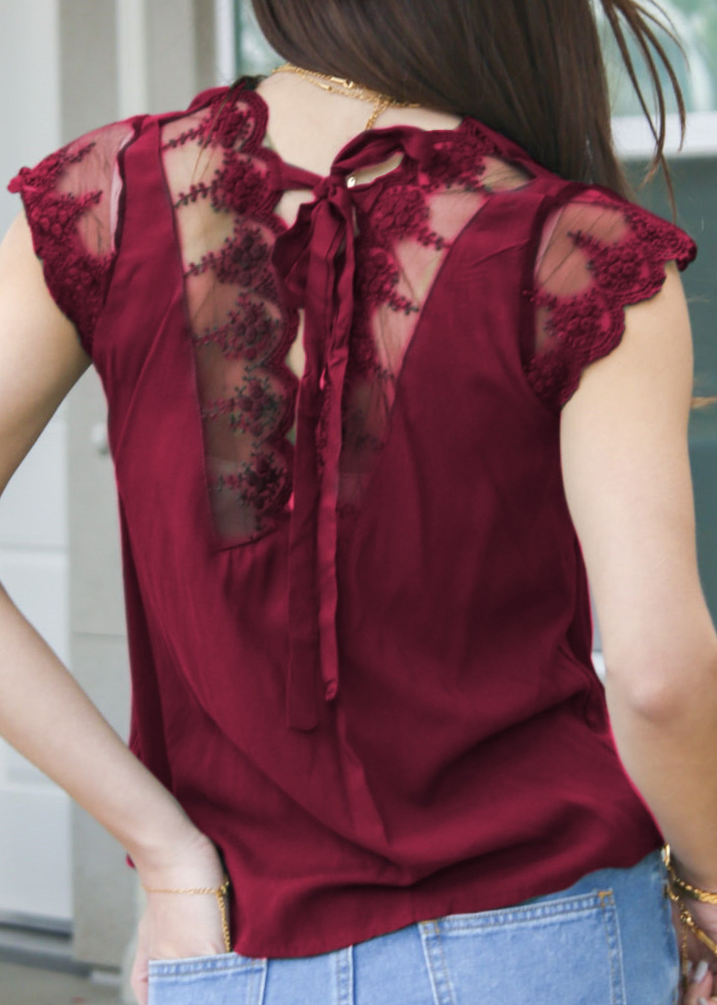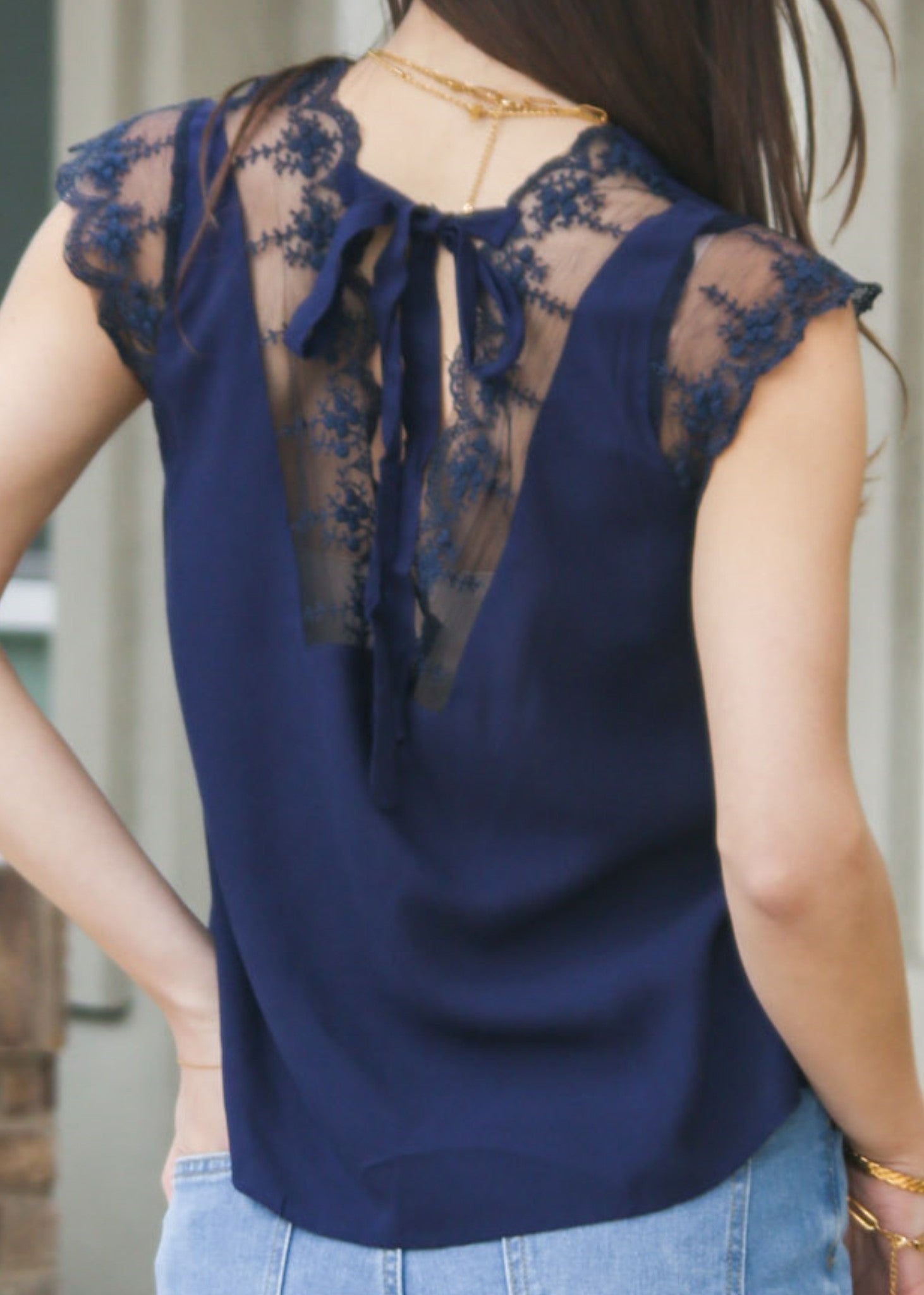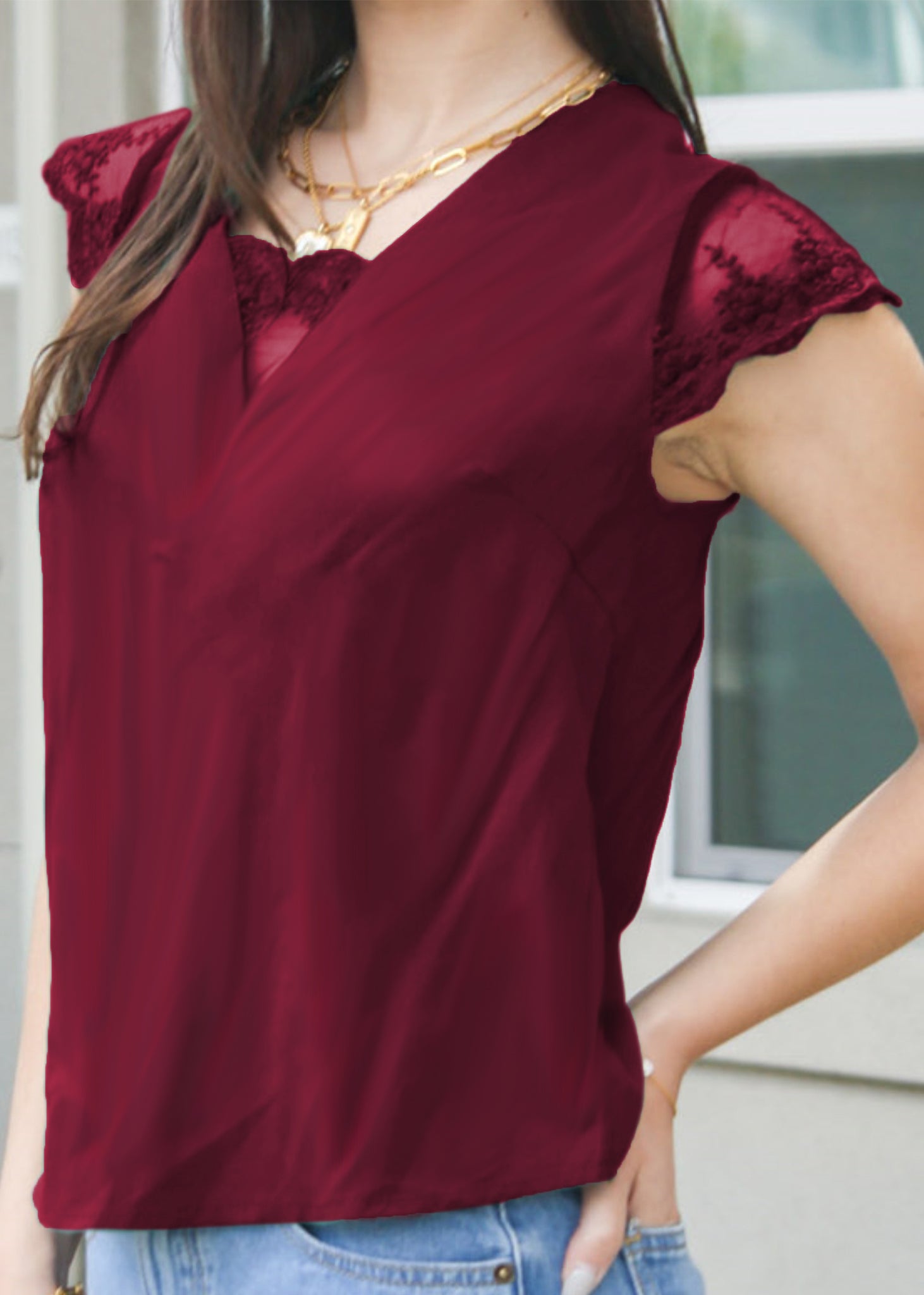 La blusa Anna-Kaci tiene un hermoso detalle de lazo en la espalda. Tiene escote en V, ribetes de encaje, mangas cortas y corte regular. Combínala con pantalones y tacones para lograr un look sofisticado.