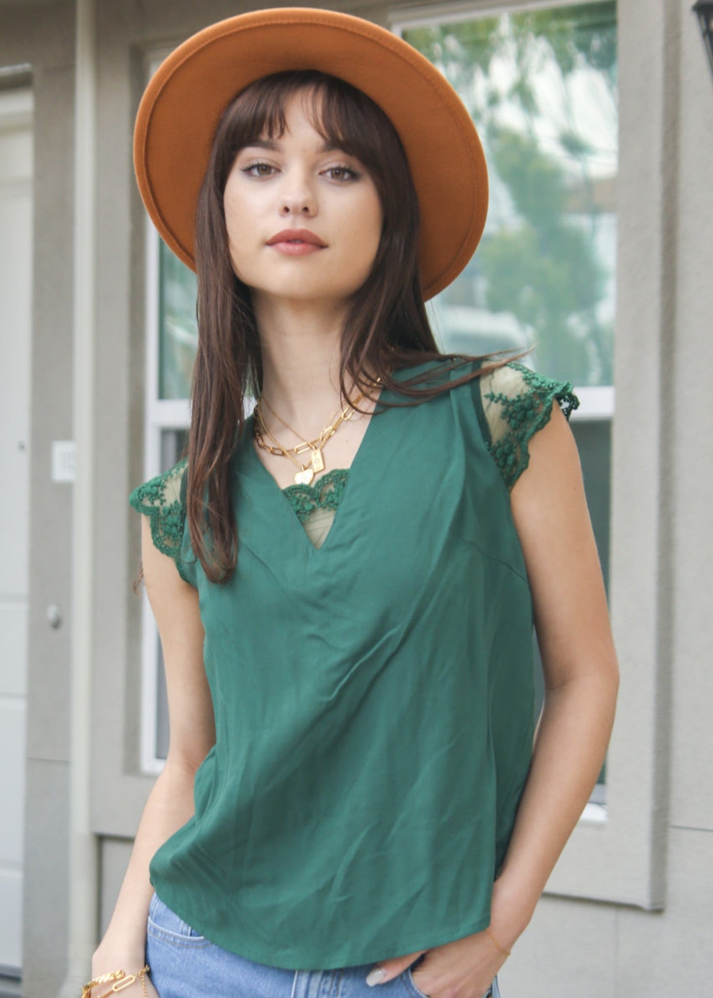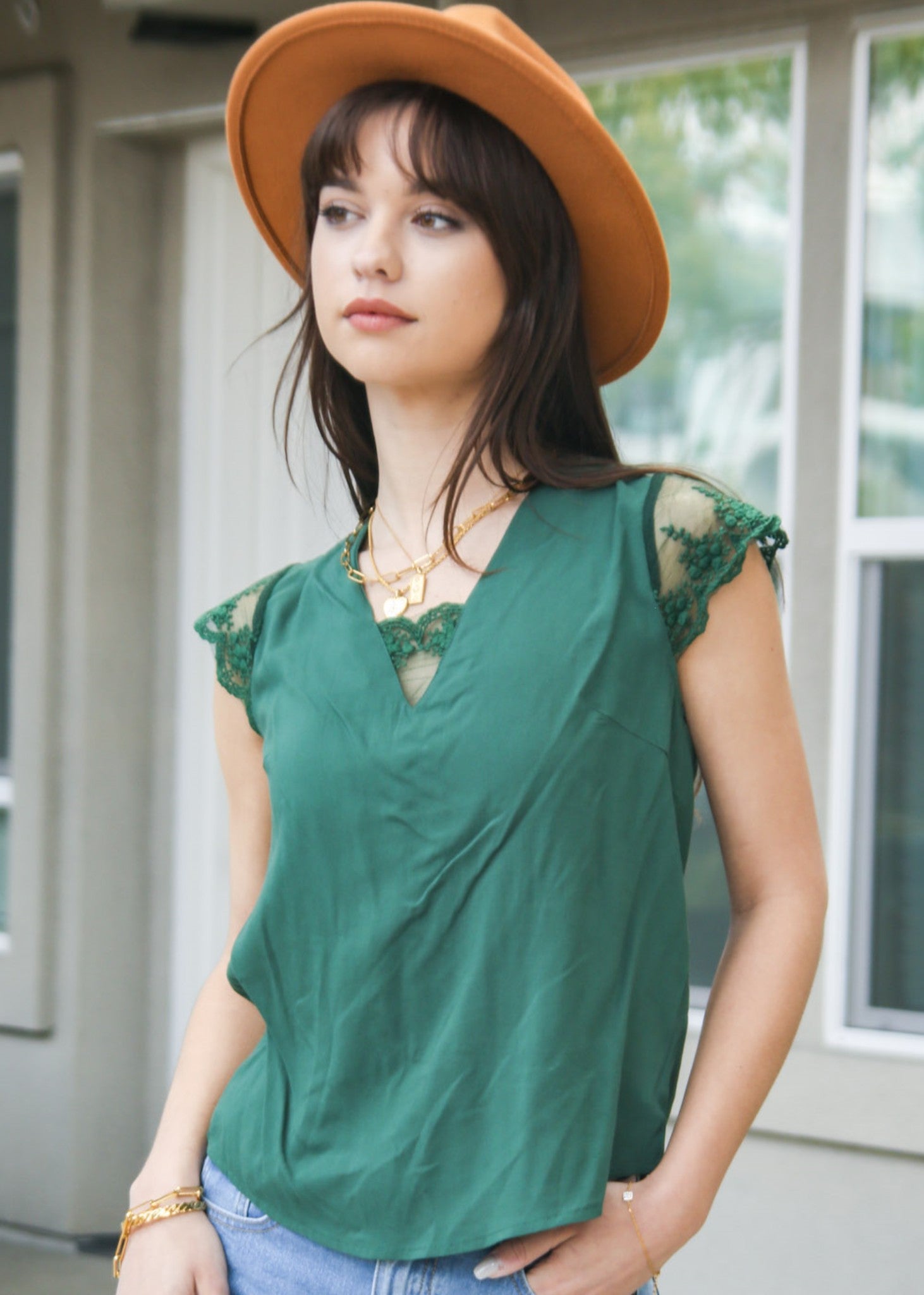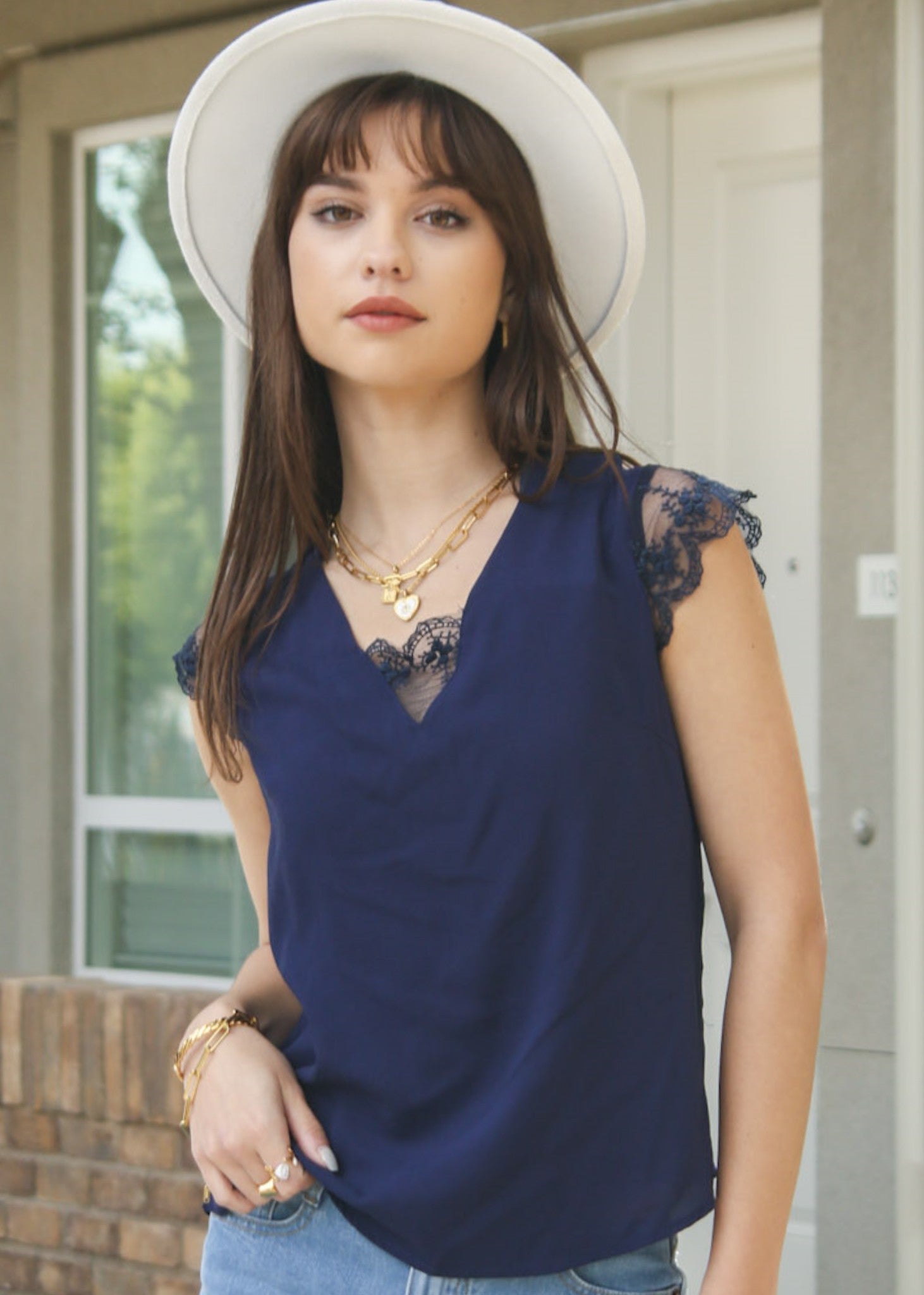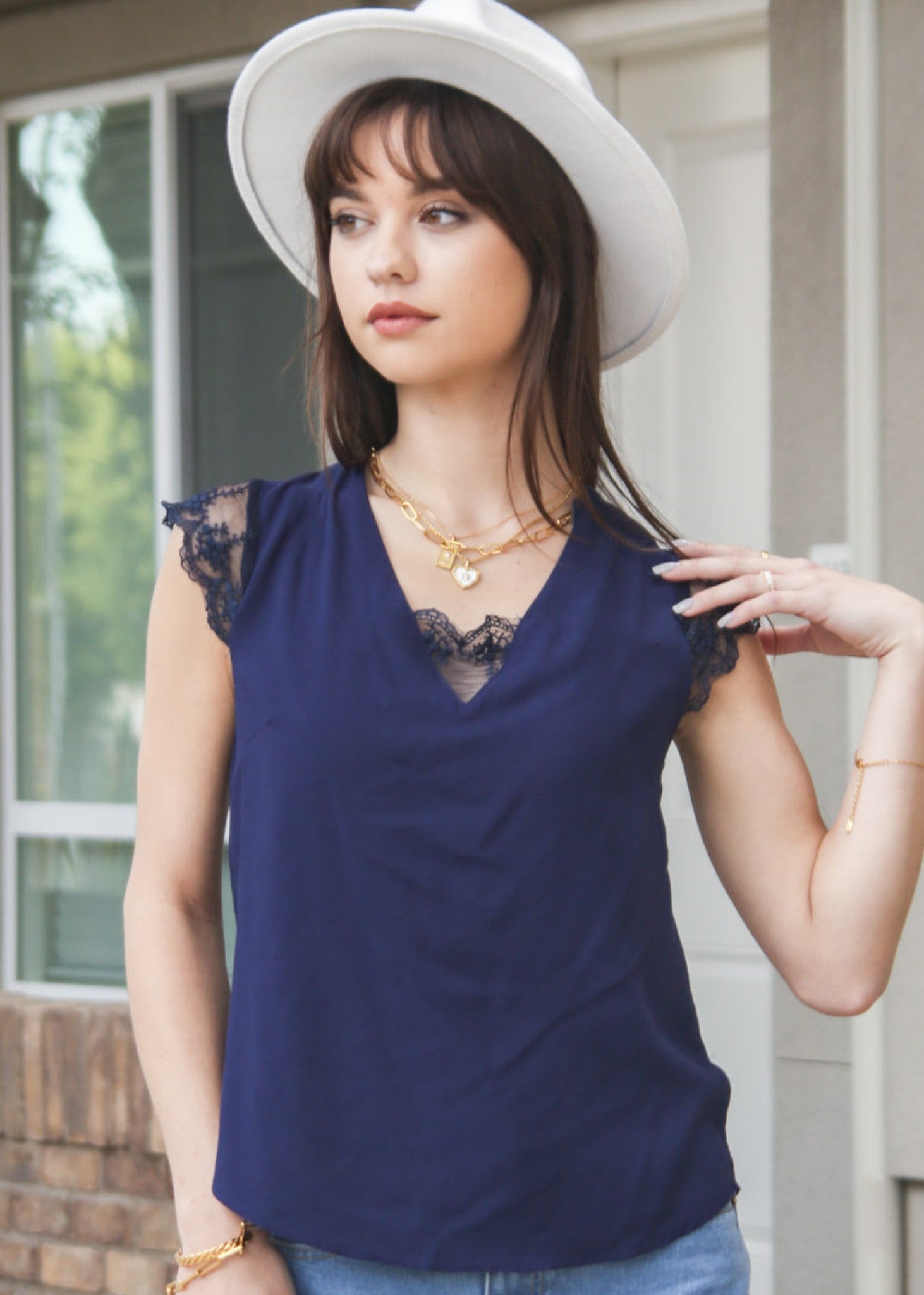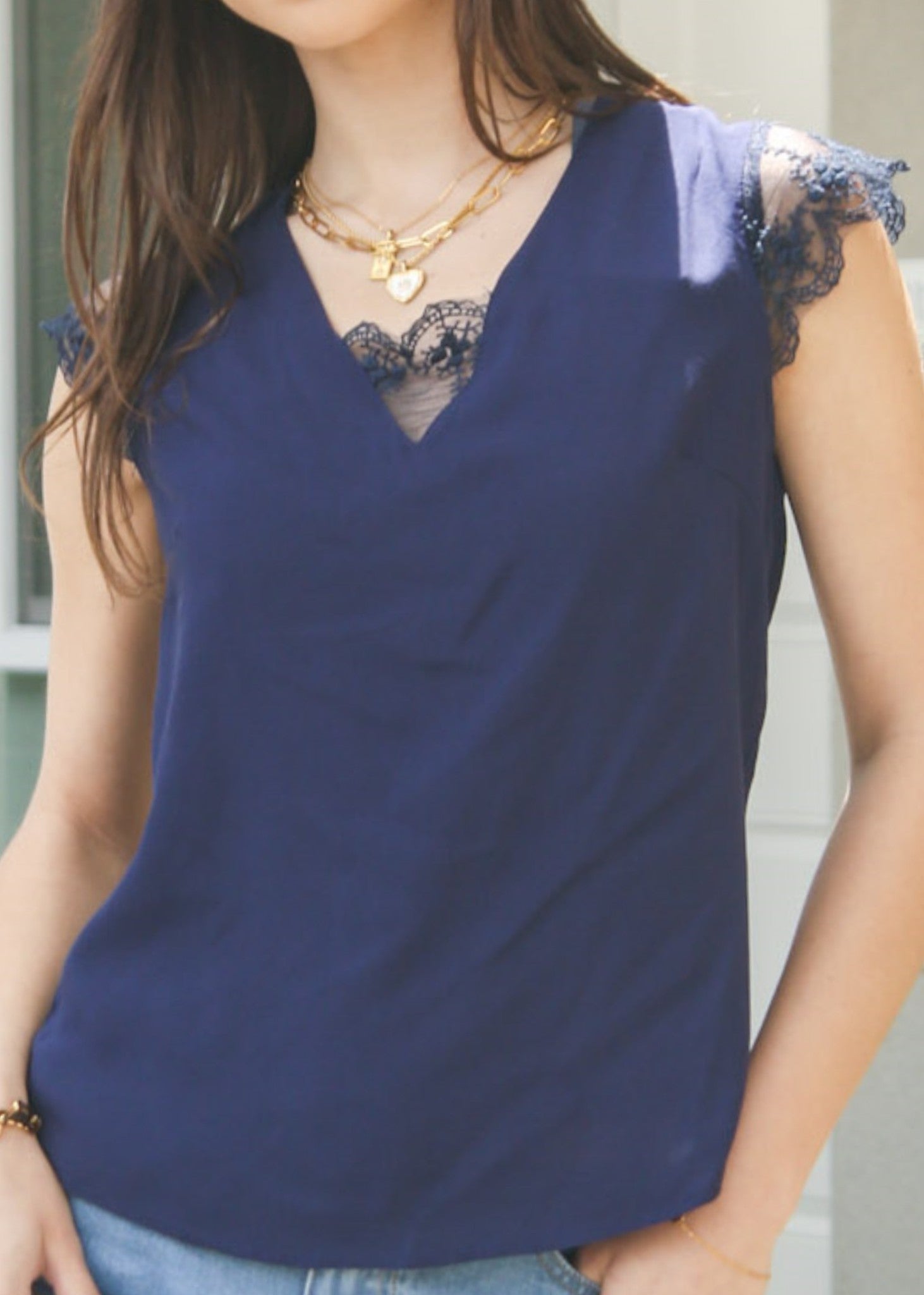 La blusa Anna-Kaci tiene un hermoso detalle de lazo en la espalda. Tiene escote en V, ribetes de encaje, mangas cortas y corte regular. Combínala con pantalones y tacones para lograr un look sofisticado.